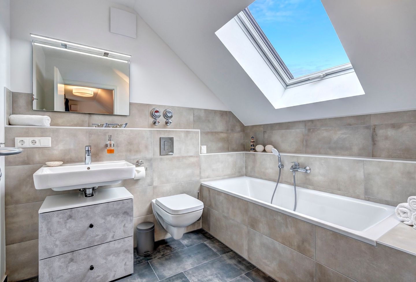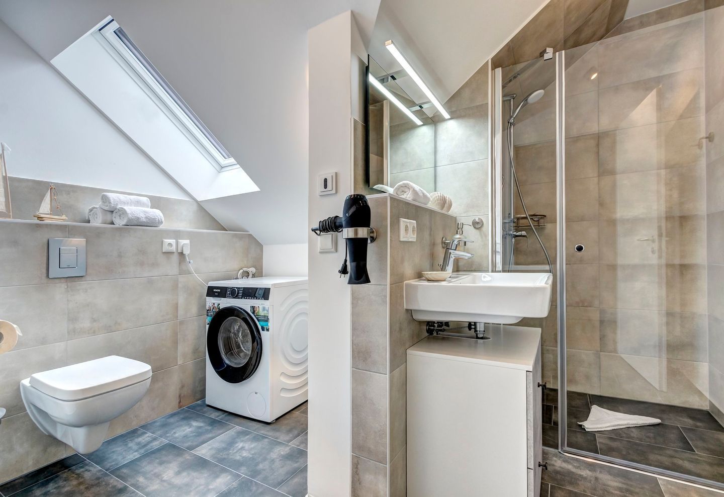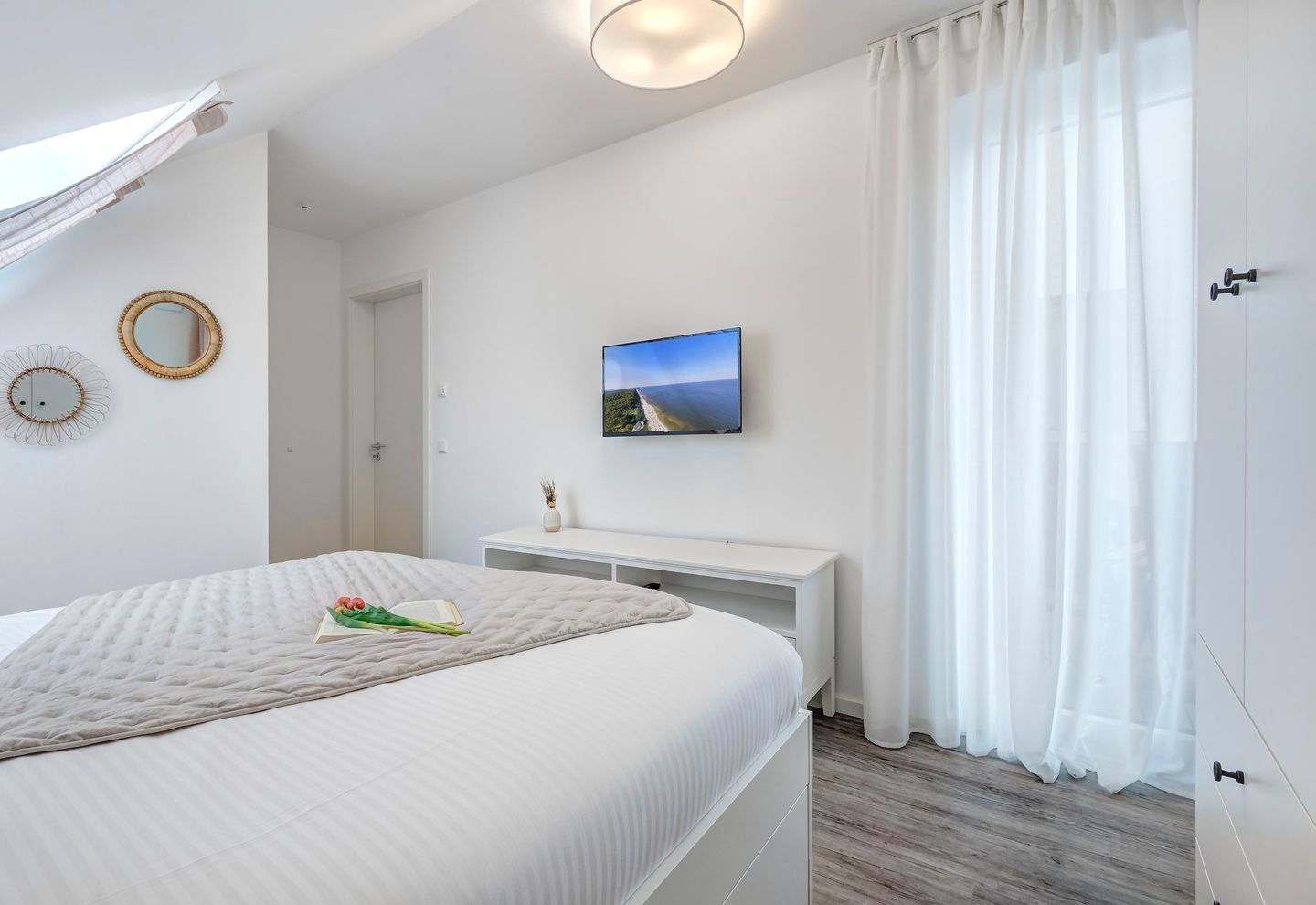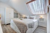 Zwei geschmackvoll eingerichtete Schlafzimmer mit komfortablen Boxspringbetten (je 1,80 m x 2,00 m), großen Kleiderschränken und jeweils eigenem TV bieten höchsten Schlafkomfort und ausreichend Rückzugsmöglichkeiten. Die moderne Ausstattung der Wohnung setzt sich auch im stilvollen Badezimmer fort, das mit einer Badewanne, Waschmaschine und Trockner ausgestattet ist. Zusätzlich steht ein separates Gästebad mit bodengleicher Dusche zur Verfügung – besonders praktisch für Familien oder bei längeren Aufenthalten.