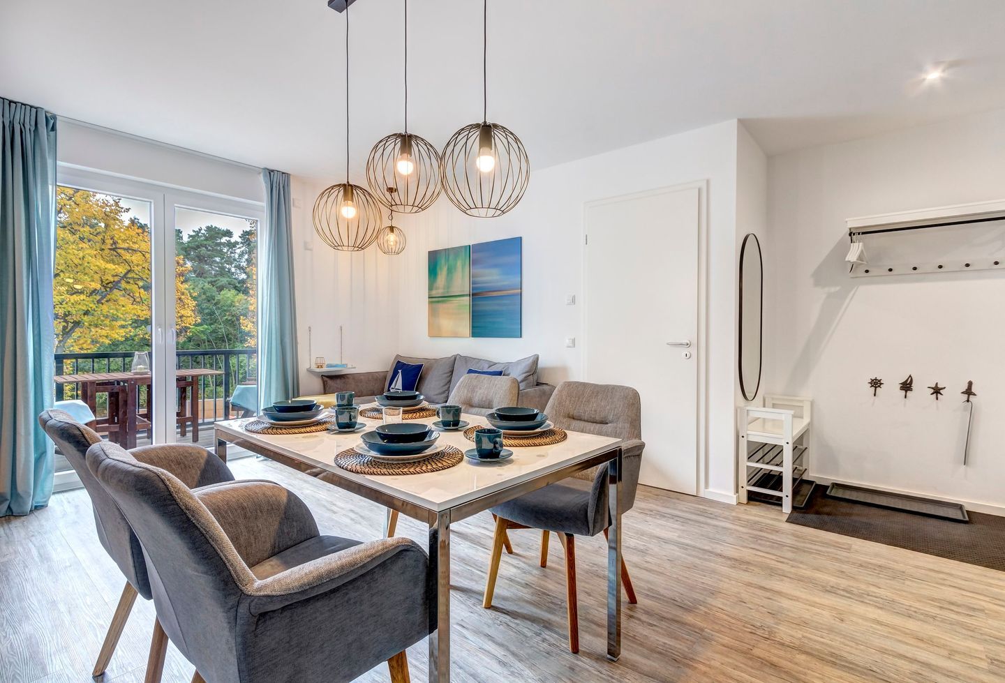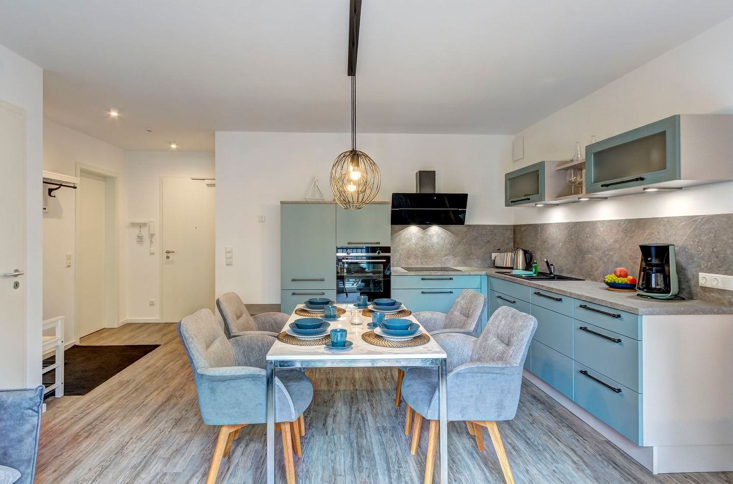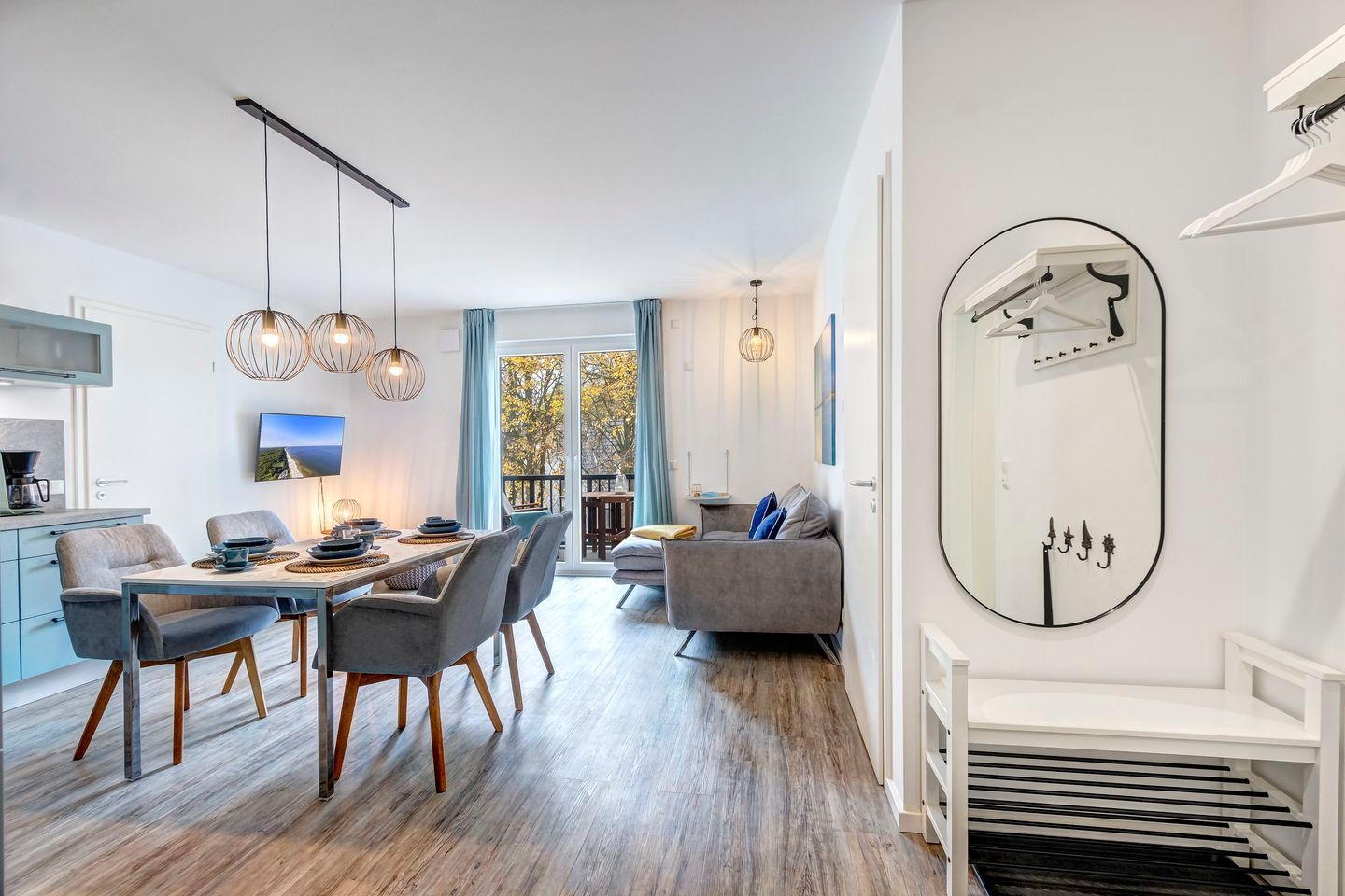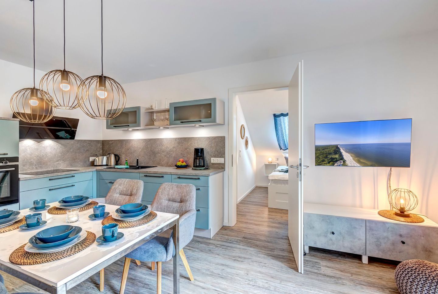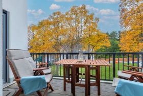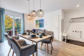 Der offen gestaltete Wohnbereich ist geschmackvoll möbliert und bietet mit einem großen Esstisch ausreichend Platz für gemeinsame Mahlzeiten. Die moderne Küche ist mit Induktionskochfeld, Backofen, Geschirrspüler und allen notwendigen Geräten ausgestattet und lädt zum Kochen ein. Der helle Wohnbereich ist mit einem großen Flachbildfernseher versehen, Amazon Prime und Netflix sind mit eigenem Account nutzbar. Von hier aus gelangen Sie auf den sonnigen Balkon mit gemütlicher Bestuhlung, der zu entspannten Stunden im Freien einlädt und dabei den Blick in die grüne Umgebung freigibt.