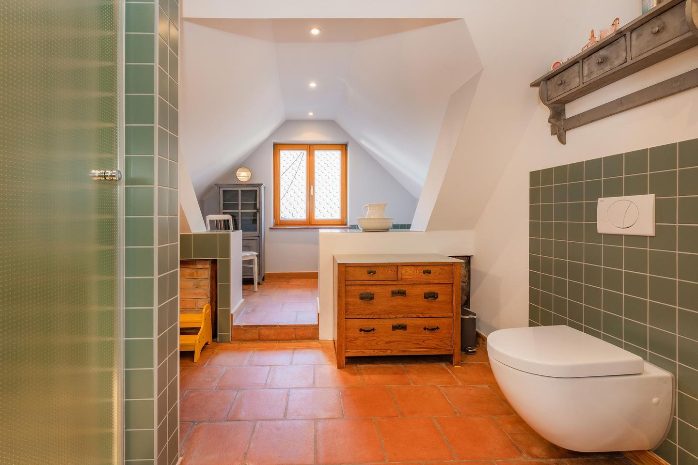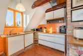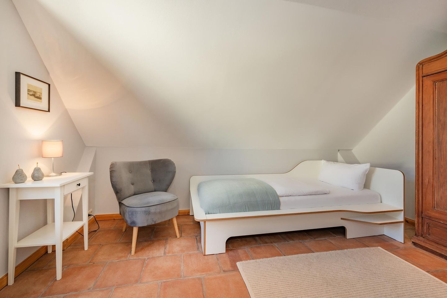 Das Herzstück der Wohnung ist die gemütliche Wohnküche, die dank eines integrierten Kaminofens in der kühleren Jahreszeit für eine besonders behagliche Stimmung sorgt – ein seltenes und geschätztes Highlight. Die kleine, aber hochmoderne Küche ist optimal ausgestattet mit Induktionskochfeld, Backofen und Spülmaschine und geht offen in den Wohnbereich über. Hier finden Sie einen komfortablen Esstisch für gemeinsame Mahlzeiten und einen gemütlichen Wohnraum mit einer einladenden Sitzecke und einem Flat-TV, der Streaming-Optionen wie Amazon Prime und Netflix (mit eigenem Account) ermöglicht. Für die kleinen Gäste steht im Erdgeschoss ein separates Kinderzimmer mit einem Einzelbett (0,90m x 2,00m) und Kleiderschrank bereit. Über eine charmante Holztreppe gelangen Sie in den Dachbereich, wo sich das geräumige Hauptschlafzimmer befindet.
