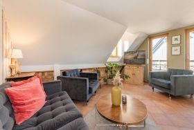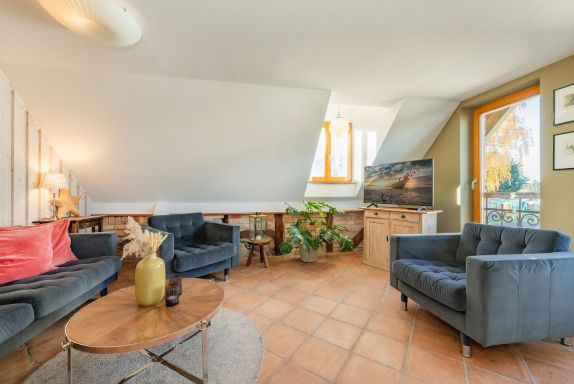 Entfliehen Sie dem Alltag und finden Sie Ihr persönliches Usedom-Glück in der charmanten Ferienwohnung Am Rieck 02. Idyllisch und ruhig gelegen im Herzen des traditionsreichen Seebades Zempin, besticht dieses Domizil durch seine einzigartige Lage: Die kurze Entfernung zum Achterwasser verspricht eine malerische Umgebung und traumhafte Sonnenuntergänge, während der Ostseestrand nach einem Spaziergang von etwas über einem Kilometer erreicht werden kann. Die großzügige Wohnung mit 95 m² Wohnfläche befindet sich im Obergeschoss eines reizvollen Fachwerkhauses und bietet dank eines separaten Hauseinganges über eine Holzaußentreppe ein hohes Maß an Privatsphäre. Die gesamte Wohnung strahlt ein sofortiges Wohlfühlambiente aus, geschaffen durch freiliegende Fachwerkbalken, eine liebevolle, klare Stilrichtung und eine warme Dekoration, die den Charakter des Hauses unterstreicht und zum Entspannen einlädt.
