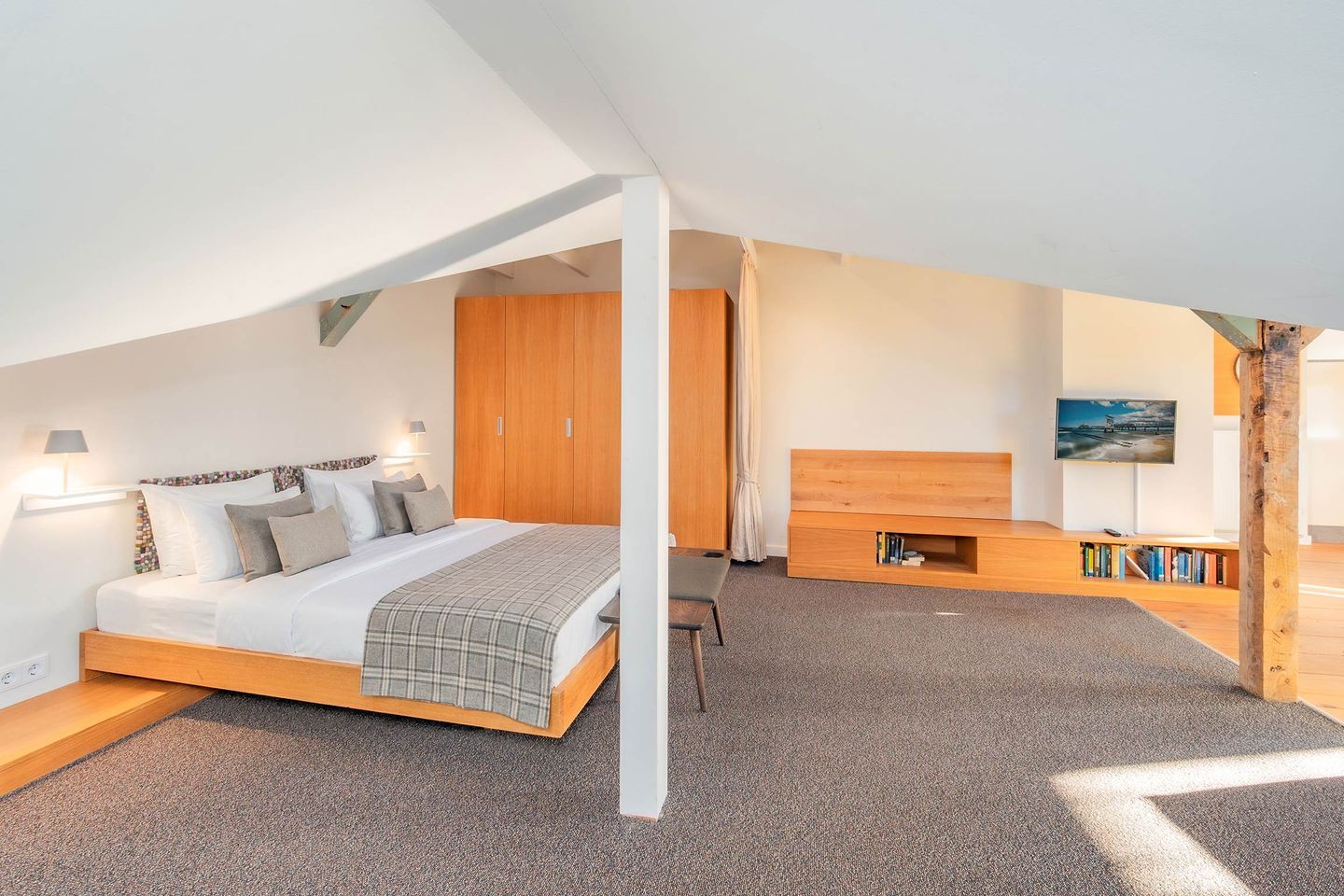 Genießen Sie einen Urlaub der Extraklasse über den Dächern des Kaiserbades Heringsdorf in der traumhaften Ferienwohnung Baltisches Haus 06. Dieses Juwel befindet sich in zentraler Bestlage, sodass Sie die belebte Promenade, die beeindruckende Seebrücke und den feinsandigen Ostseestrand nach einem kurzen Spaziergang von nur 600 Metern erreichen. Das Apartment liegt in der zweiten Etage, dem Dachgeschoss des stilvoll modernisierten Hauses, und besticht auf großzügigen 79 m² durch einen unverwechselbaren Loft-Charakter. Das offene Raumkonzept verbindet Wohnen, Kochen und Schlafen auf harmonische Weise und schafft durch die sichtbaren, hellen Holzbalken sowie eine sonnige und lichtdurchflutete Farbgestaltung ein Ambiente voller Wärme und Behaglichkeit. Hier fühlen Sie sich sofort willkommen und können den Alltag weit hinter sich lassen.