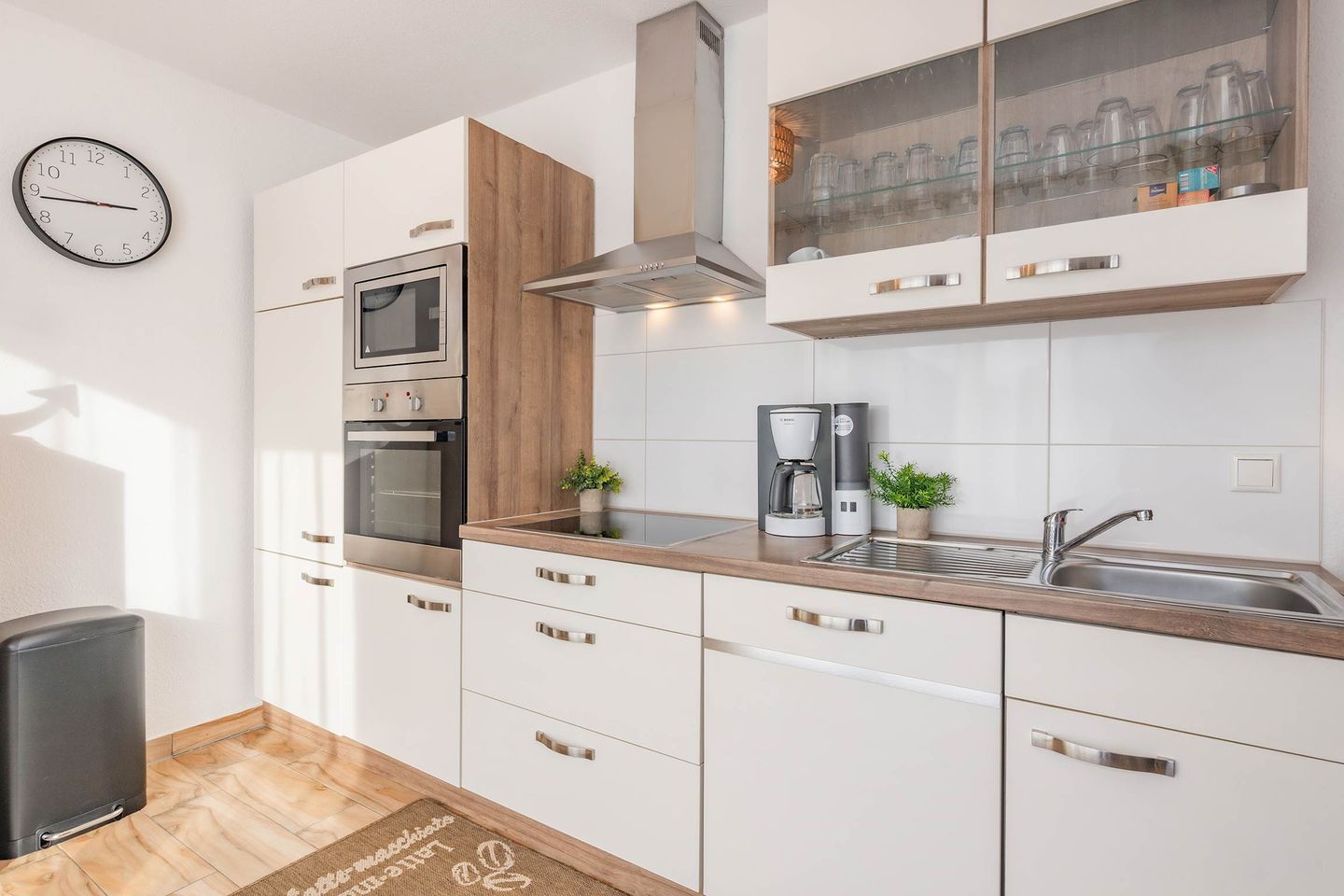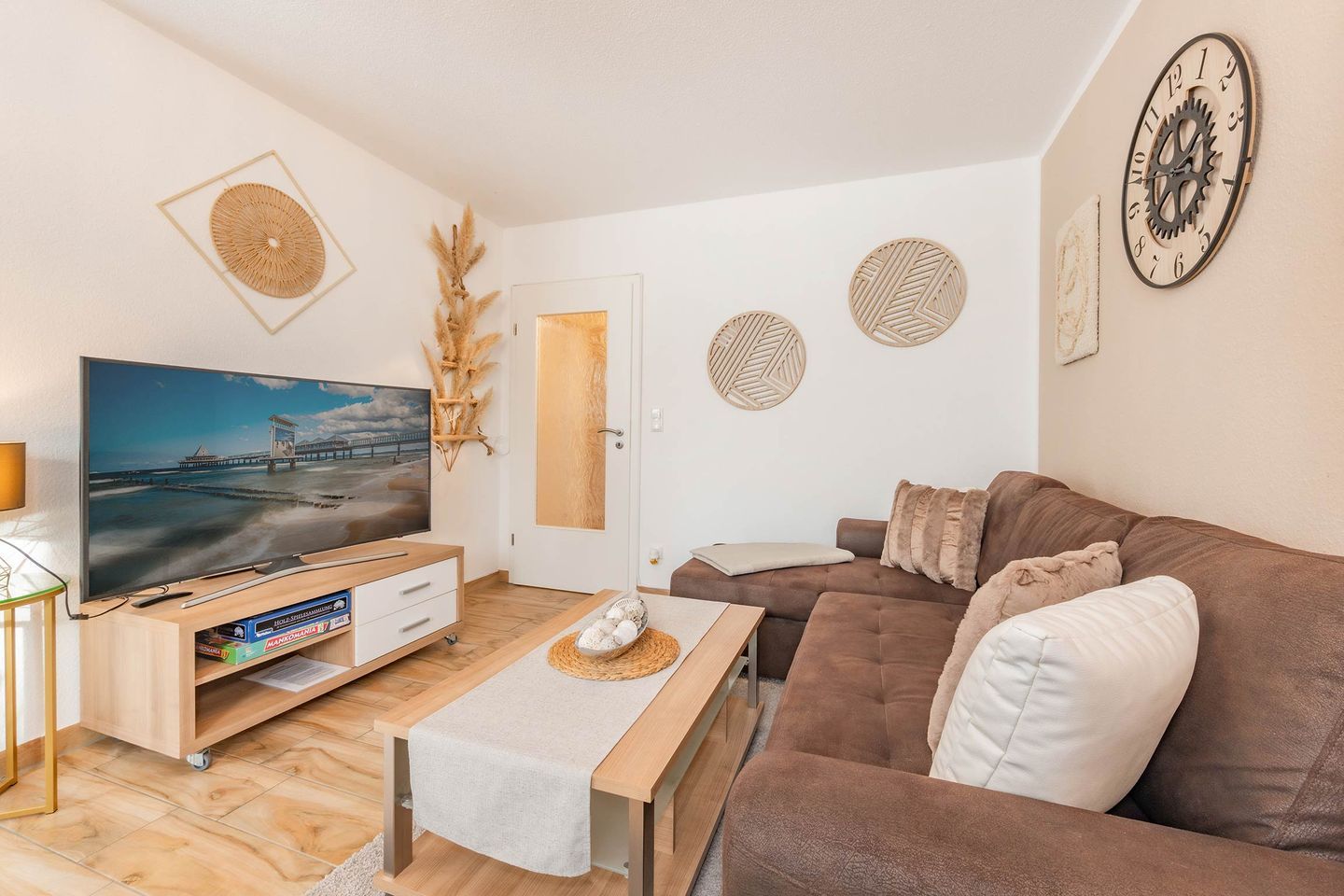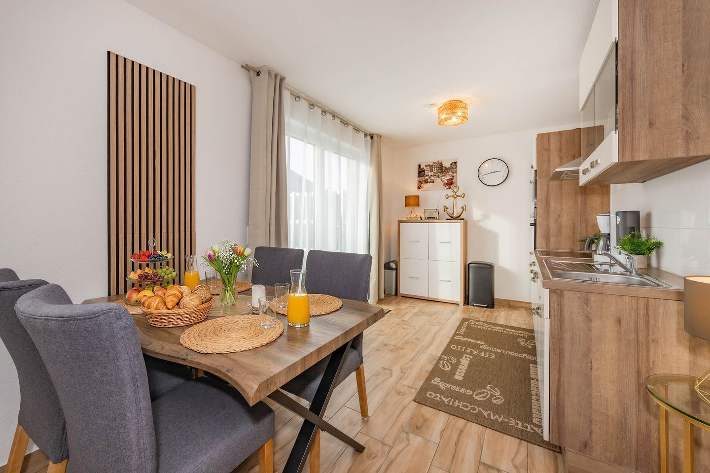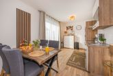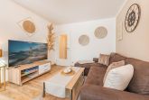 Die rund 48 Quadratmeter große Ferienwohnung befindet sich im Erdgeschoss des Hauses und überzeugt durch ein modernes, gemütliches Wohnkonzept. Der offene Wohn- und Essbereich bildet das Herzstück der Wohnung und verbindet komfortables Wohnen mit einer funktionalen Küche. Diese ist mit Backofen, Cerankochfeld, Spülmaschine und weiteren praktischen Geräten ausgestattet, sodass auch im Urlaub eine entspannte Selbstversorgung möglich ist. Am Esstisch lassen sich gemeinsame Mahlzeiten genießen, während der Wohnbereich mit Flat-TV und der Möglichkeit zur Nutzung von Amazon Prime und Netflix für Unterhaltung sorgt. Eine ausziehbare Schlafcouch bietet zusätzlich Platz für Kinder und macht die Wohnung auch für kleine Familien attraktiv.