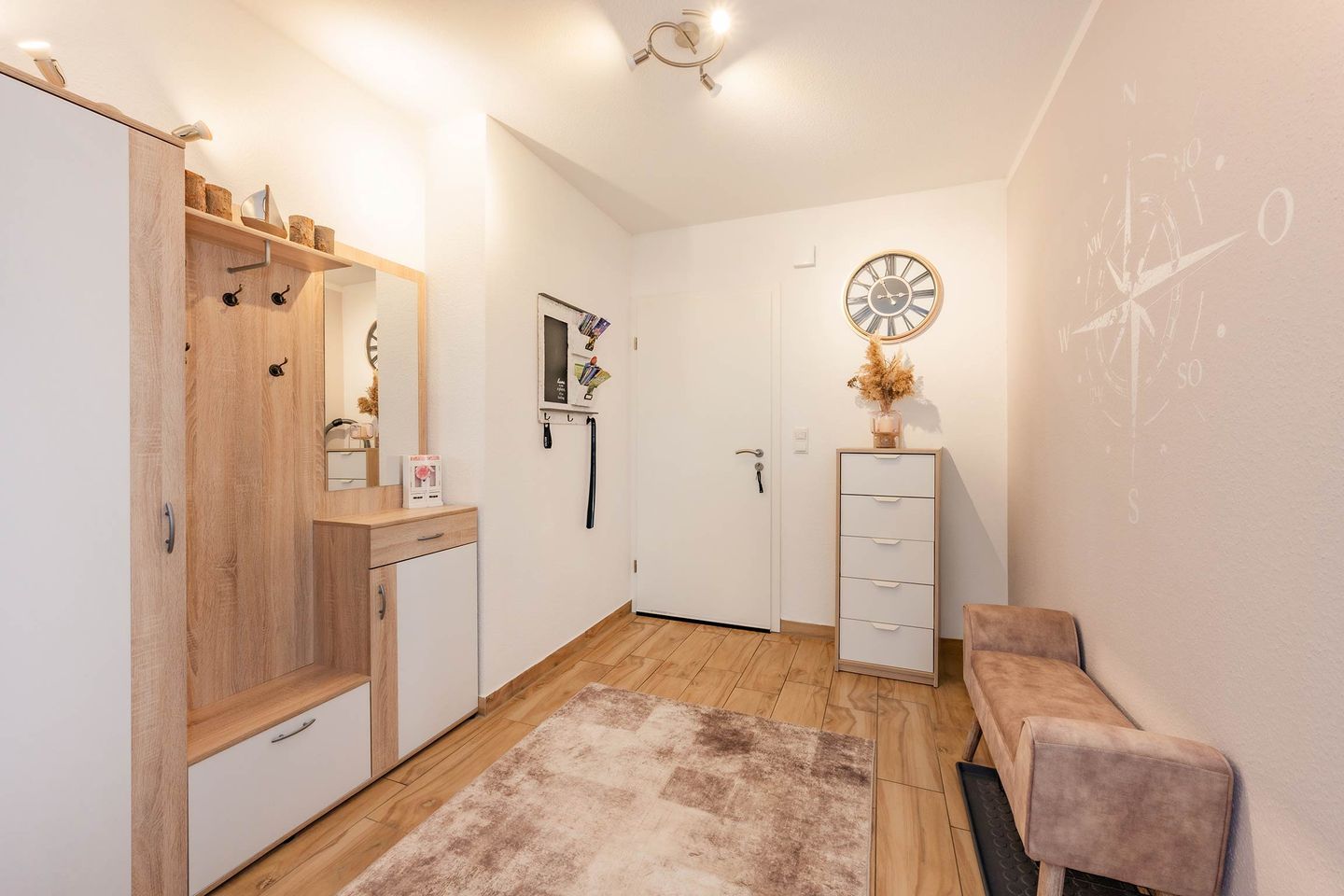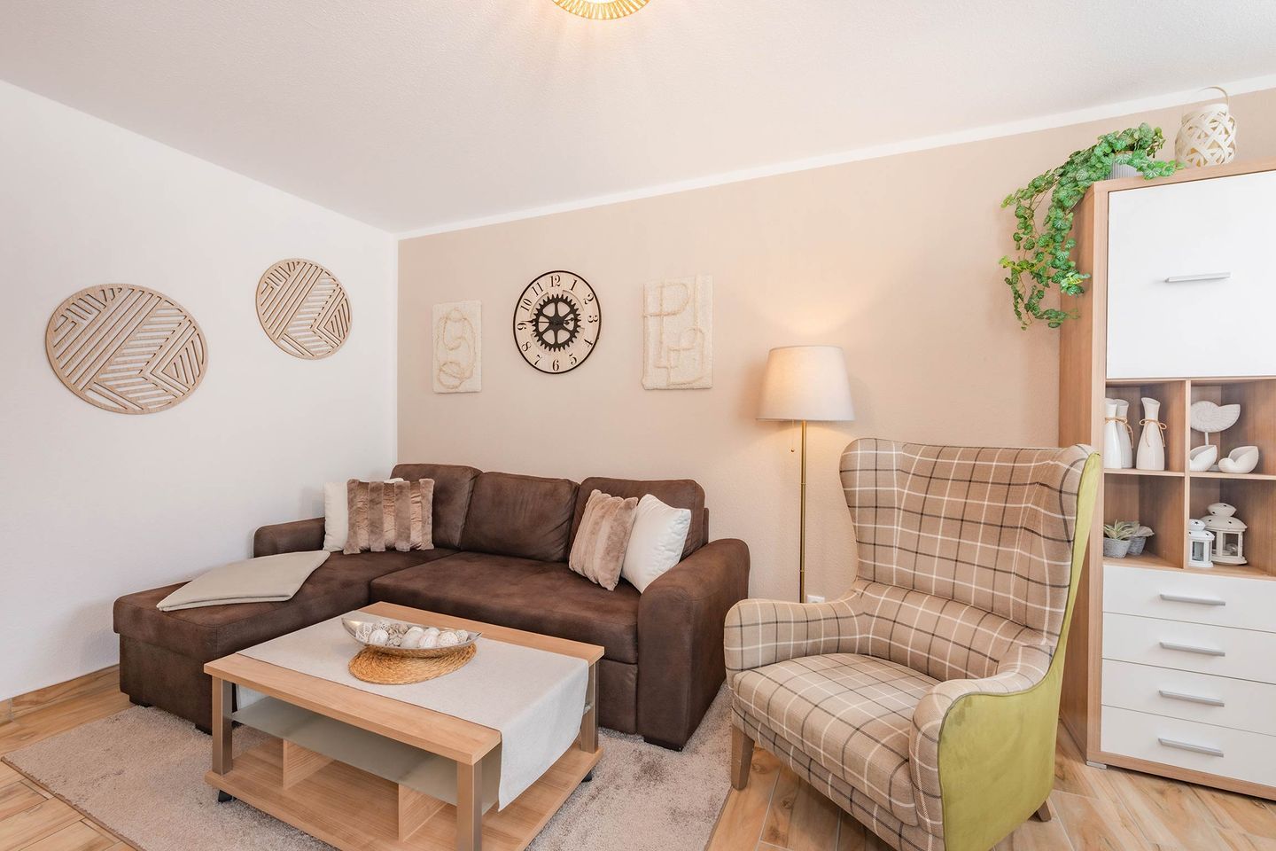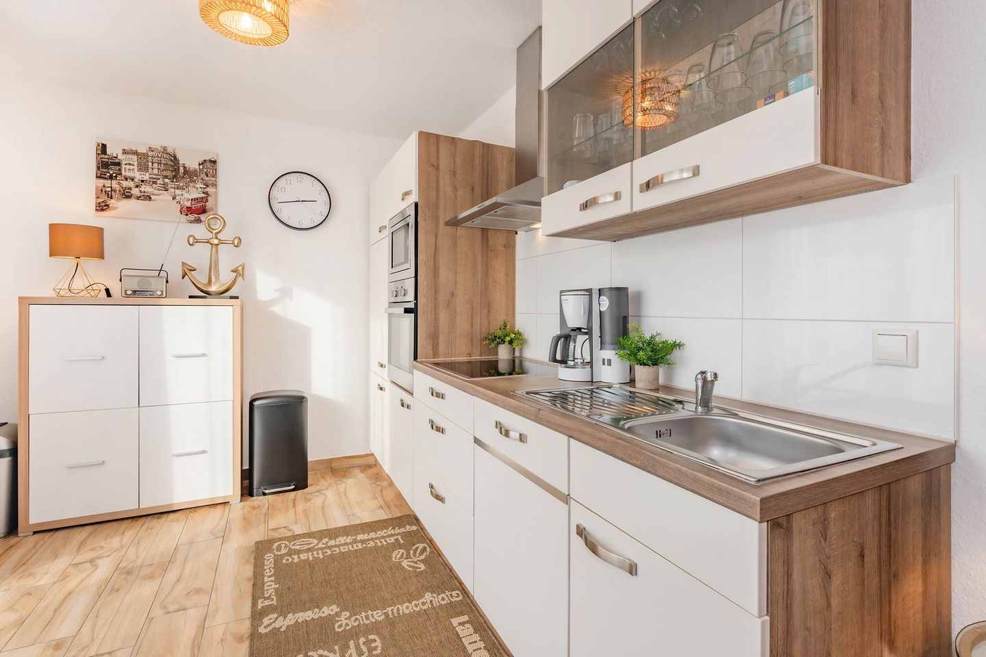Die rund 48 Quadratmeter große Ferienwohnung befindet sich im Erdgeschoss des Hauses und überzeugt durch ein modernes, gemütliches Wohnkonzept. Der offene Wohn- und Essbereich bildet das Herzstück der Wohnung und verbindet komfortables Wohnen mit einer funktionalen Küche. Diese ist mit Backofen, Cerankochfeld, Spülmaschine und weiteren praktischen Geräten ausgestattet, sodass auch im Urlaub eine entspannte Selbstversorgung möglich ist. Am Esstisch lassen sich gemeinsame Mahlzeiten genießen, während der Wohnbereich mit Flat-TV und der Möglichkeit zur Nutzung von Amazon Prime und Netflix für Unterhaltung sorgt. Eine ausziehbare Schlafcouch bietet zusätzlich Platz für Kinder und macht die Wohnung auch für kleine Familien attraktiv.