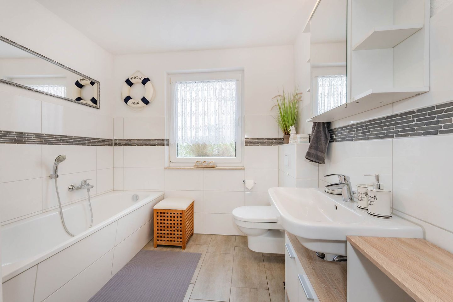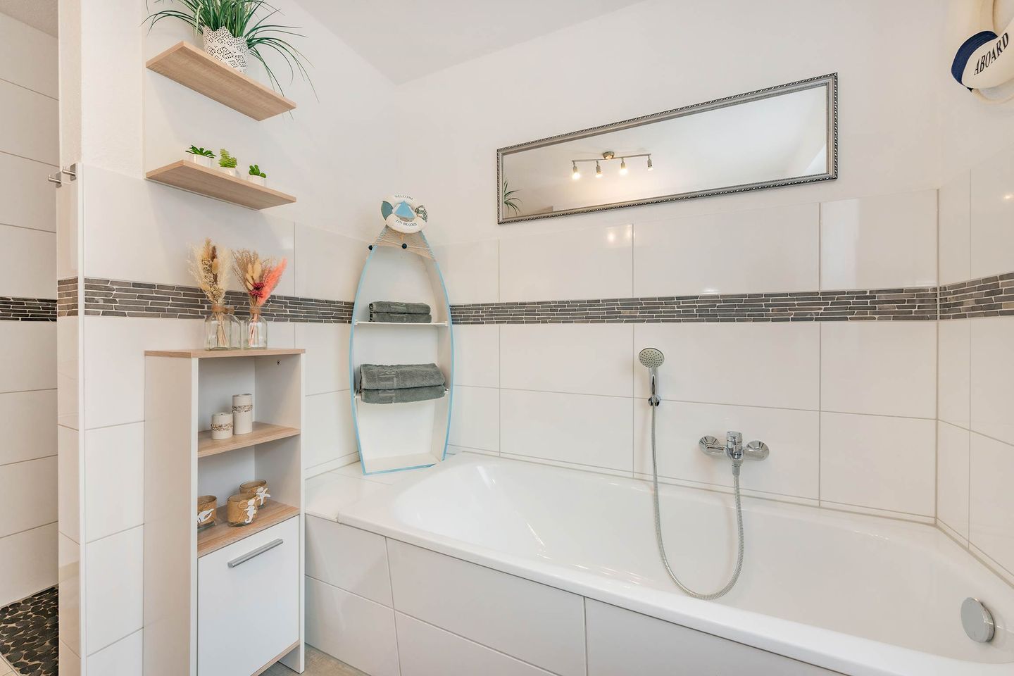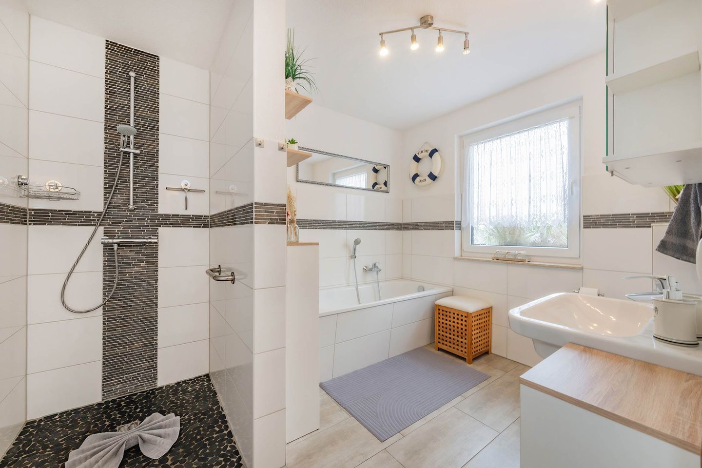 Das moderne Badezimmer ist stilvoll gestaltet und bietet sowohl eine Badewanne als auch eine bodengleiche Walk-in-Dusche. Für einen sorgenfreien Start in den Urlaub sind alle Betten bereits bezogen, Handtücher liegen in ausreichender Menge bereit und eine Grundausstattung an wichtigen Utensilien steht zur Verfügung.