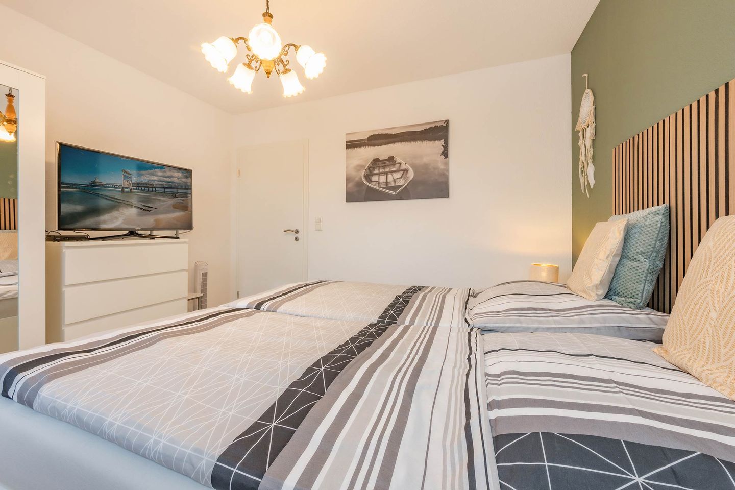 Das separate Schlafzimmer verfügt über ein komfortables Doppelbett mit einer Liegefläche von 1,80 m x 2,00 m, Verdunklungsmöglichkeiten sowie einen großzügigen Kleiderschrank. Hochwertige Möbel und liebevolle Dekoration schaffen eine behagliche Atmosphäre, in der man sich sofort willkommen fühlt.