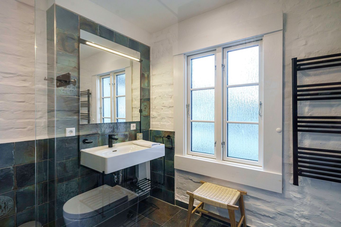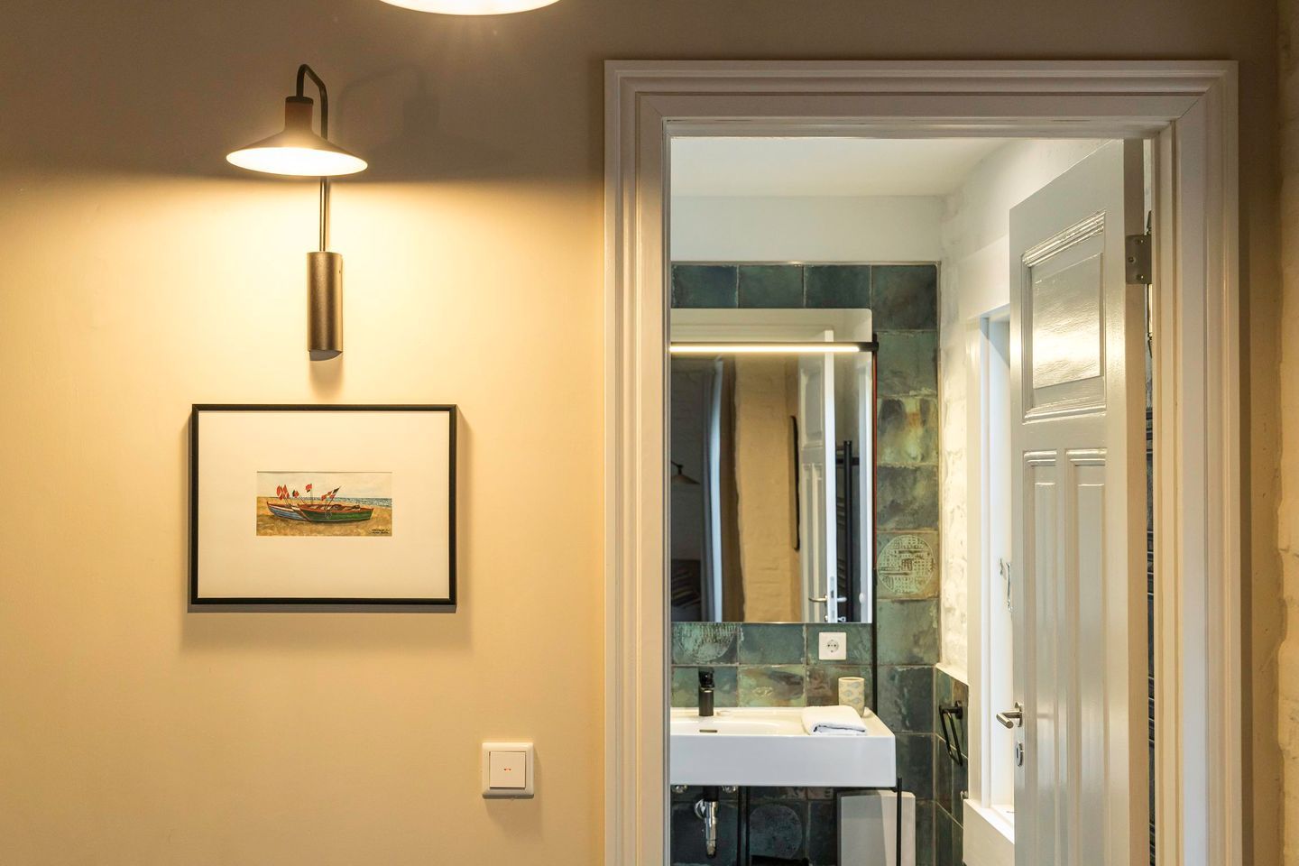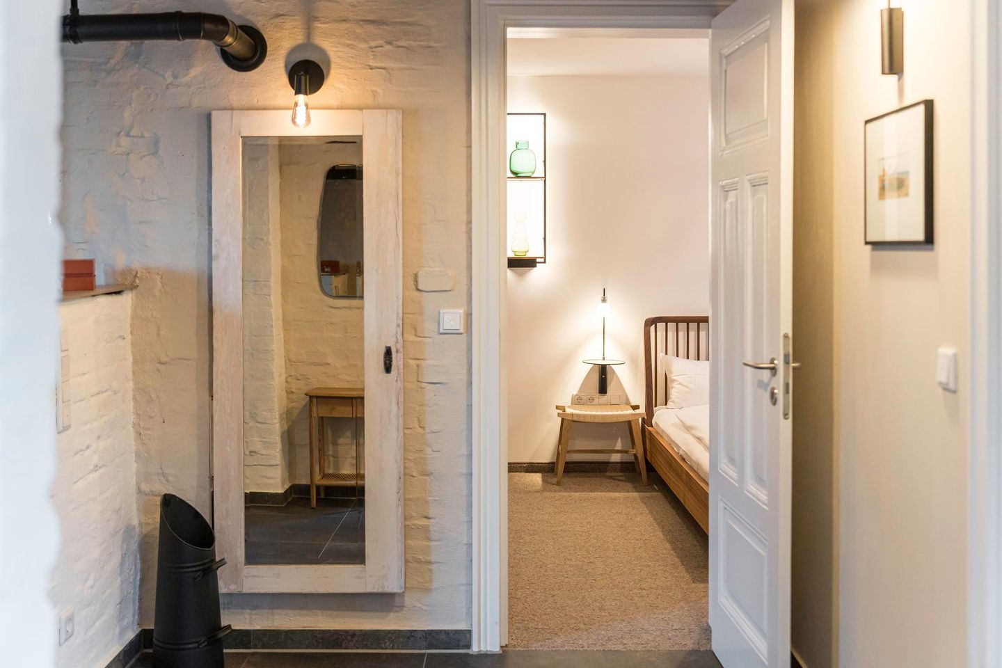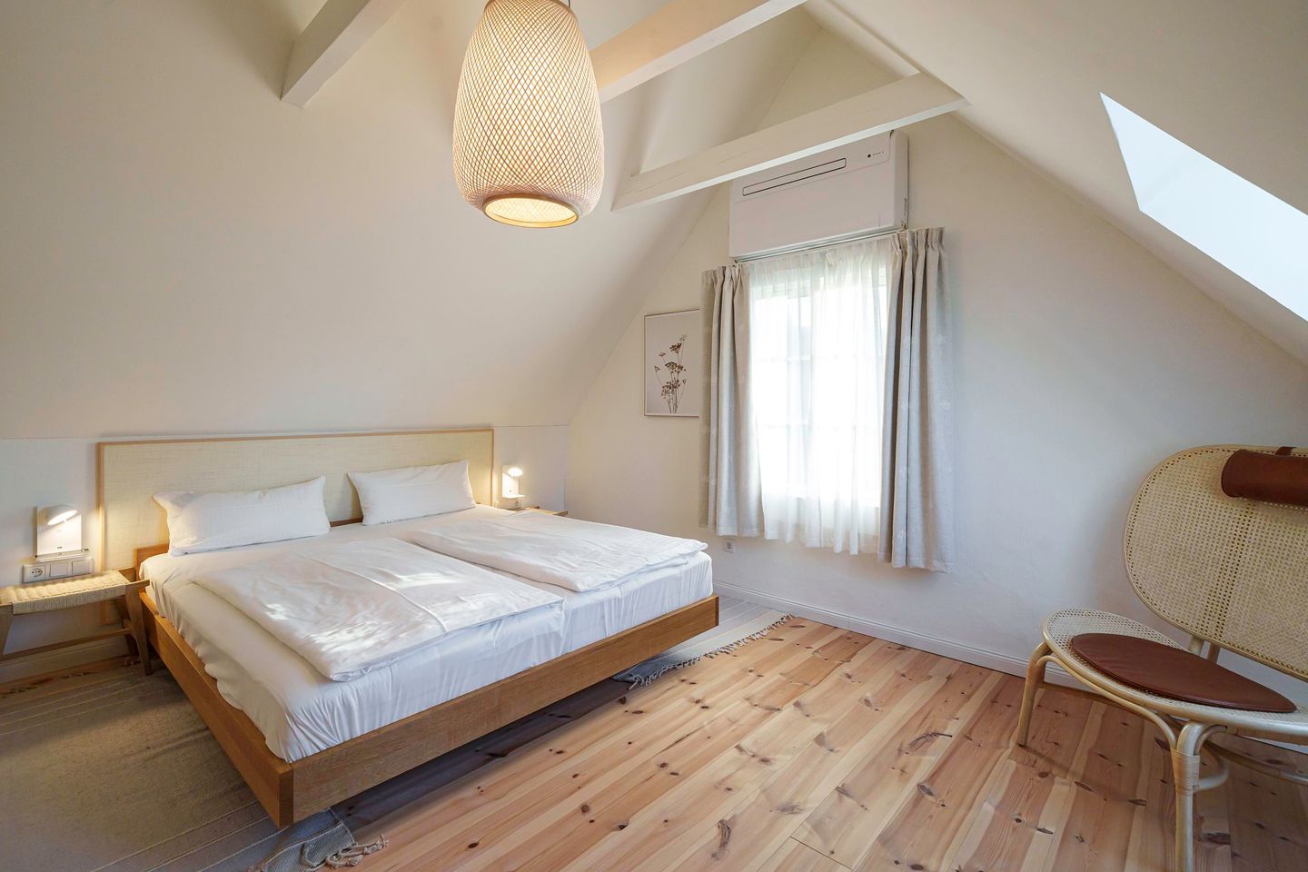 Im Erdgeschoss befindet sich ein geschmackvoll eingerichtetes Schlafzimmer mit komfortablem Doppelbett (1,80 m x 2,00 m), Verdunklungsmöglichkeiten und großzügigem Kleiderschrank. Ein weiteres Schlafzimmer mit Doppelbett und offenem Kleiderschrank liegt im oberen Geschoss und bietet einen ruhigen Rückzugsort. Zwei moderne, stilvolle Bäder mit bodengleicher Dusche stehen den Gästen zur Verfügung und sorgen auch bei mehreren Personen für entspannten Komfort.