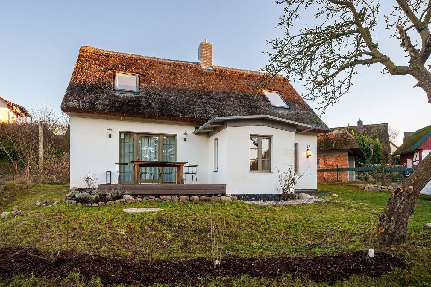 Zwei sonnige Terrassen mit Südost- und Nordwestausrichtung erweitern den Wohnraum nach draußen. Hier können Sie den Tag mit einem Frühstück in der Morgensonne beginnen oder den Abend entspannt bei frischer Luft ausklingen lassen. Bequeme Gartenmöbel sorgen dabei für hohen Komfort.
