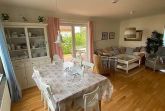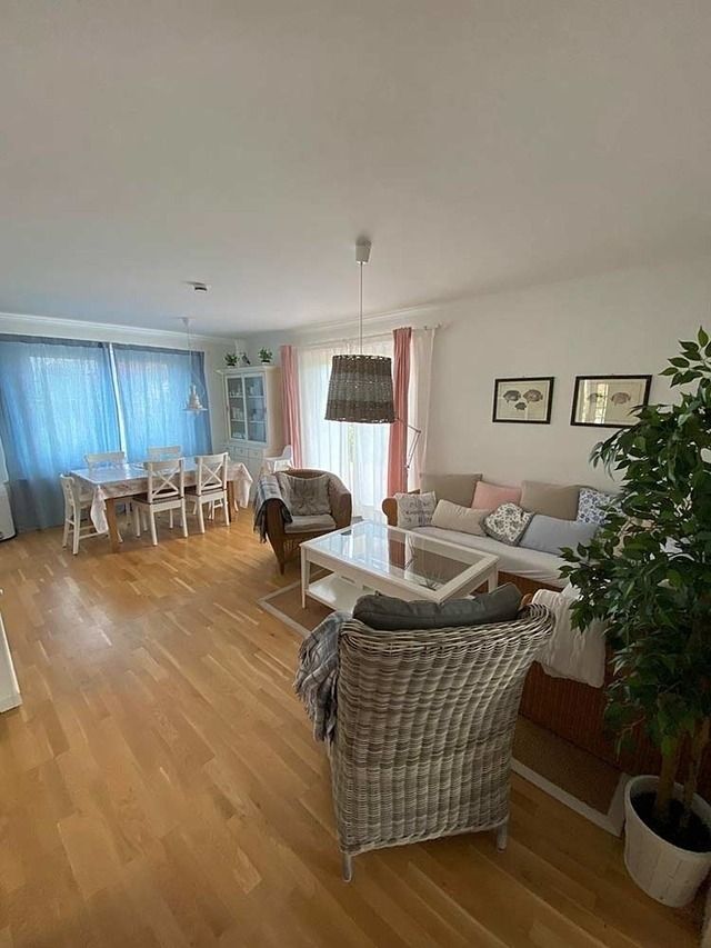 Bereits beim Betreten empfängt Sie eine helle, freundliche Atmosphäre mit liebevoll eingerichteten Wohnräumen und einer harmonischen Mischung aus Gemütlichkeit und Funktionalität. Der großzügige Wohnbereich mit bequemer Sofalandschaft lädt zu entspannten Abenden ein, während große Fenster viel Tageslicht hereinlassen und den Blick ins Grüne freigeben.