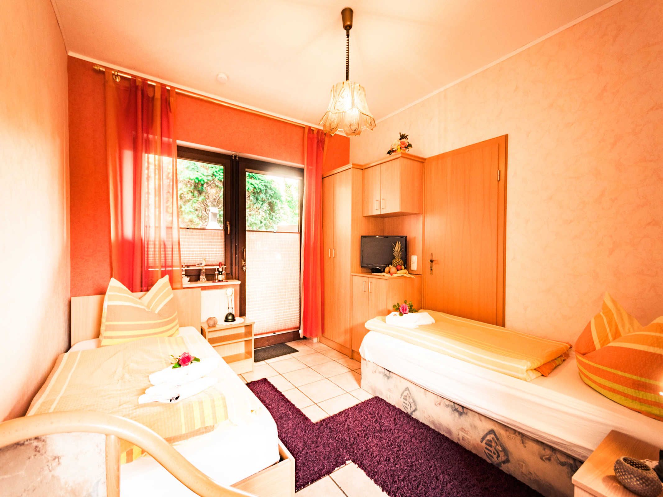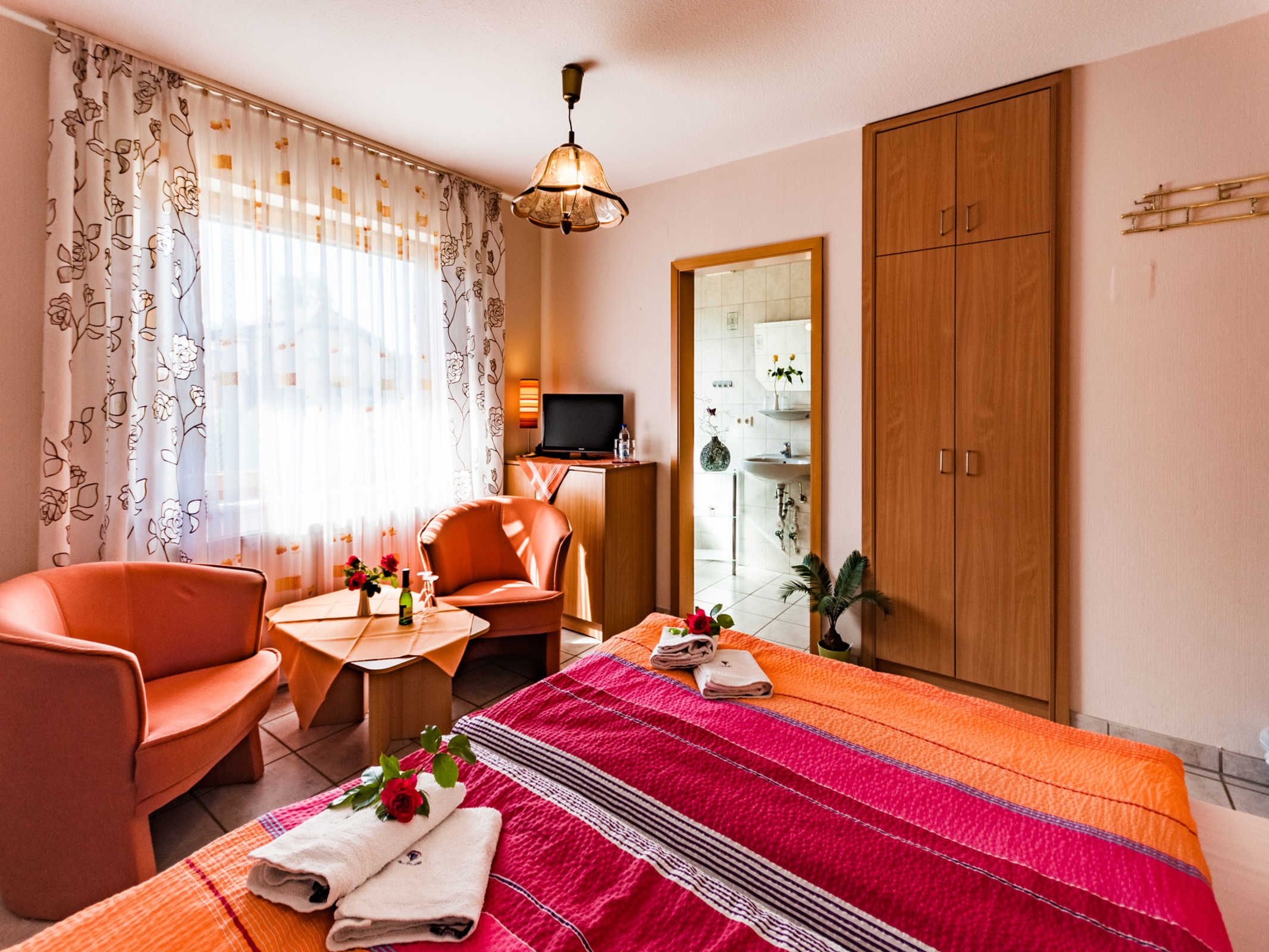Nichtraucherzimmer; Raucherzimmer nach Absprache durch Zimmerwechsel möglich. TV- und Telefonanschluß, Sitzgruppe mit Tisch und teilweise eine zusätzliche Couch, Doppelbett mit Bandscheibenmatratzen, DU/WC gefliest, ruhige u. sonnige Lage, inklusive Bettwäsche und Handtücher. Behindertenfreundlich und Rollstuhlgerecht dazu bitte anfragen.