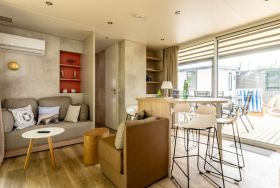 Im Ferienpark befinden sich die gastfreundliche Rezeption, sowie der Spielplatz mit Hüpfkissen, Klettergerüst, Tischtennis, Kicker, Sandkiste usw. Wir haben einen Imbiss vor Ort (u.a. Brötchenservice). Den Verleih von Bollerwagen (für die An- und Abreise und den Strand!), Blu-Ray-Playern u.v.m. bieten wir an unserer Rezeption an. Wir verfügen über eine gemütliche Gästelounge mit Sitzecken, Gesellschaftsspielen und einer Spielecke für Kinder. Im Juli und August gibt es ein kostenfreies Sportprogramm (u.a. TRX-Training, Nordic Walking, Yoga am Strand). Für einen Einkauf in der näheren Umgebung kann unser KOSTnix-Car für max. 1 Stunde genutzt werden. Waschmaschine und Trockner können gegen Gebühr verwendet werden.