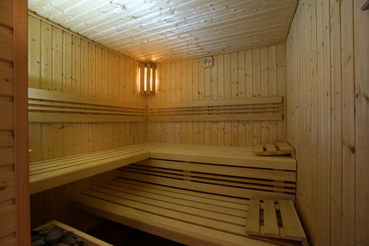 Das Schwimmbecken mit Überlaufrinne, ähnlich wie in öffentlichen Bädern, misst etwa 7m x 4,50m bei einer Wassertiefe von 1,35 m. Im Erdgeschoss des Hauses finden Sie eine traditionelle Finnische Sauna, ideal für erholsame Stunden.