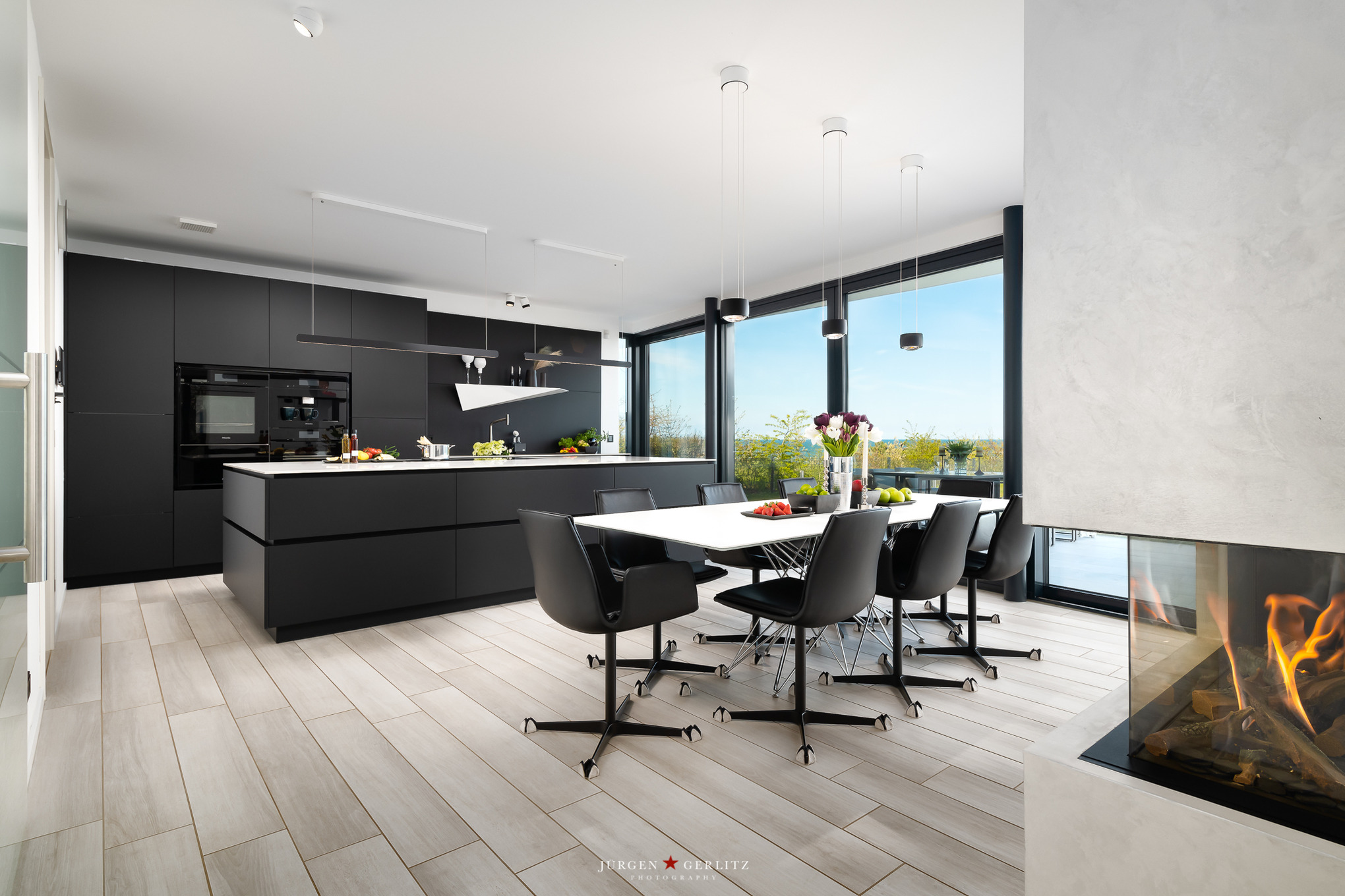 - eine offene Küche mit Backofen, Dampfgarer, Miele Kaffeevollautomat für ganze Bohnen, Wärmeschublade, 6-Platten-Induktionskochfeld, Geschirrspülmaschine, Kühlschrank und allen übrigen Küchenutensilien.