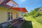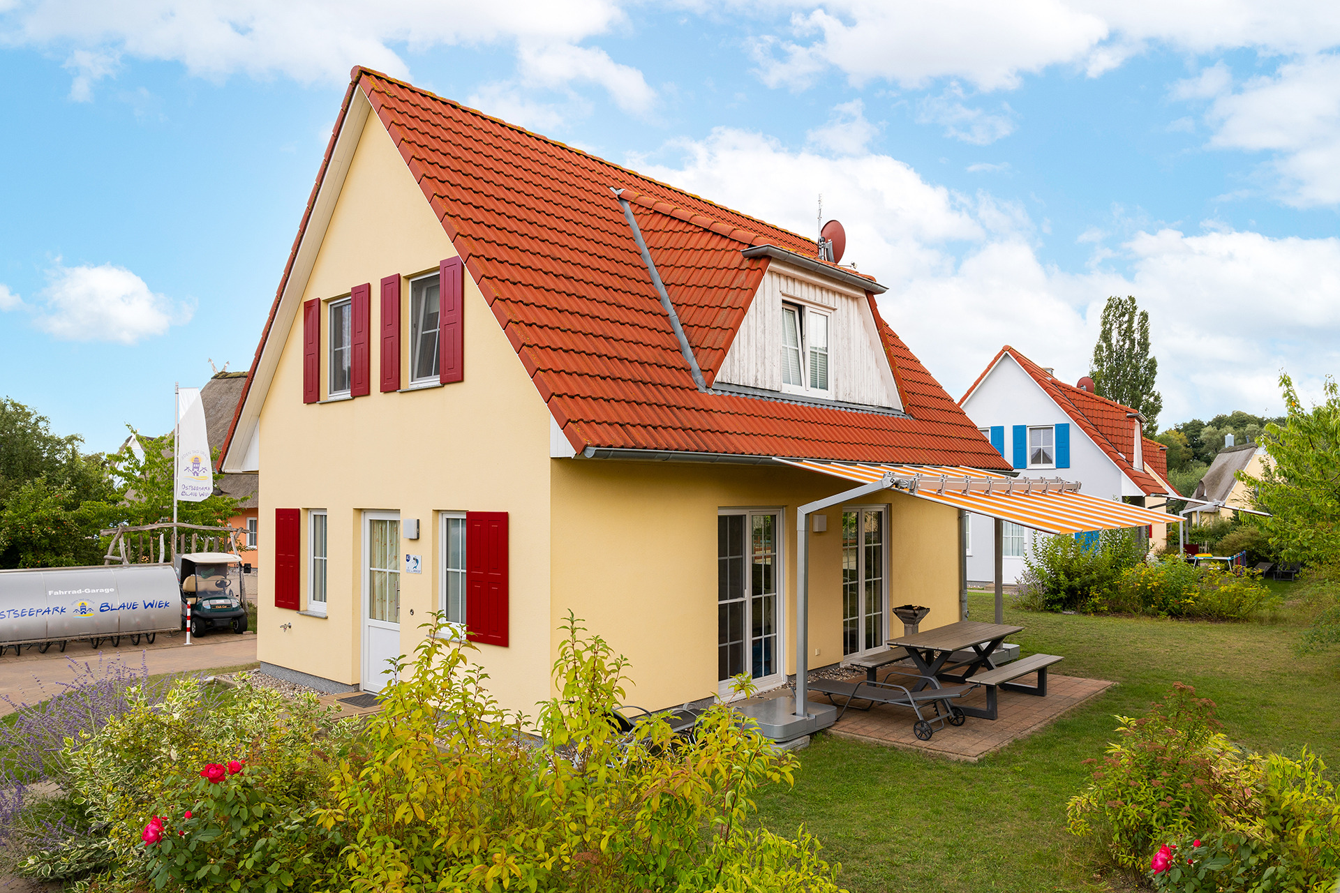 Auf der möblierten Terrasse können Sie gemütliche Grillabende genießen. Ein Bollerwagen kann optional gemietet werden – ideal für Ausflüge oder den Weg zum Strand.