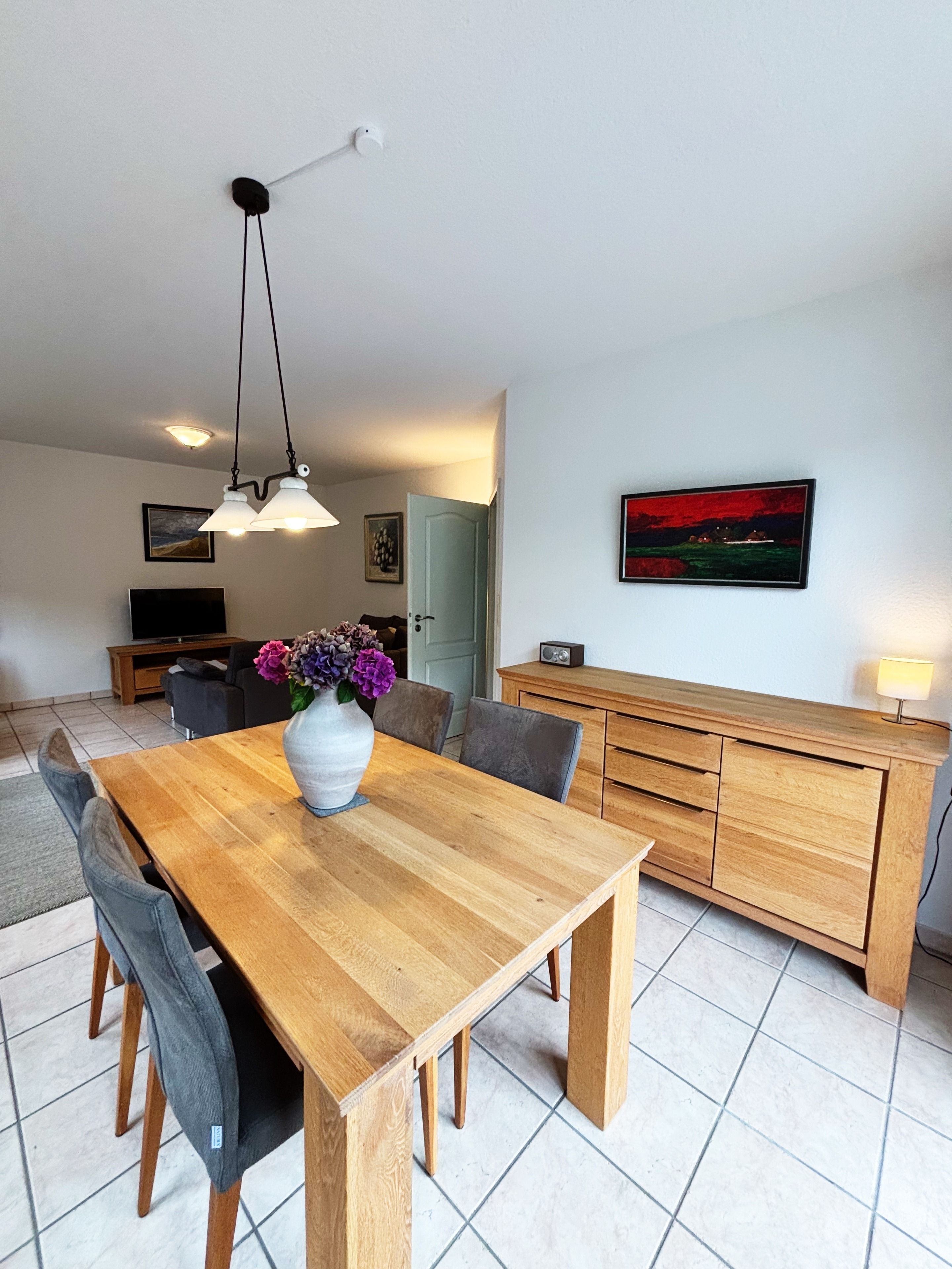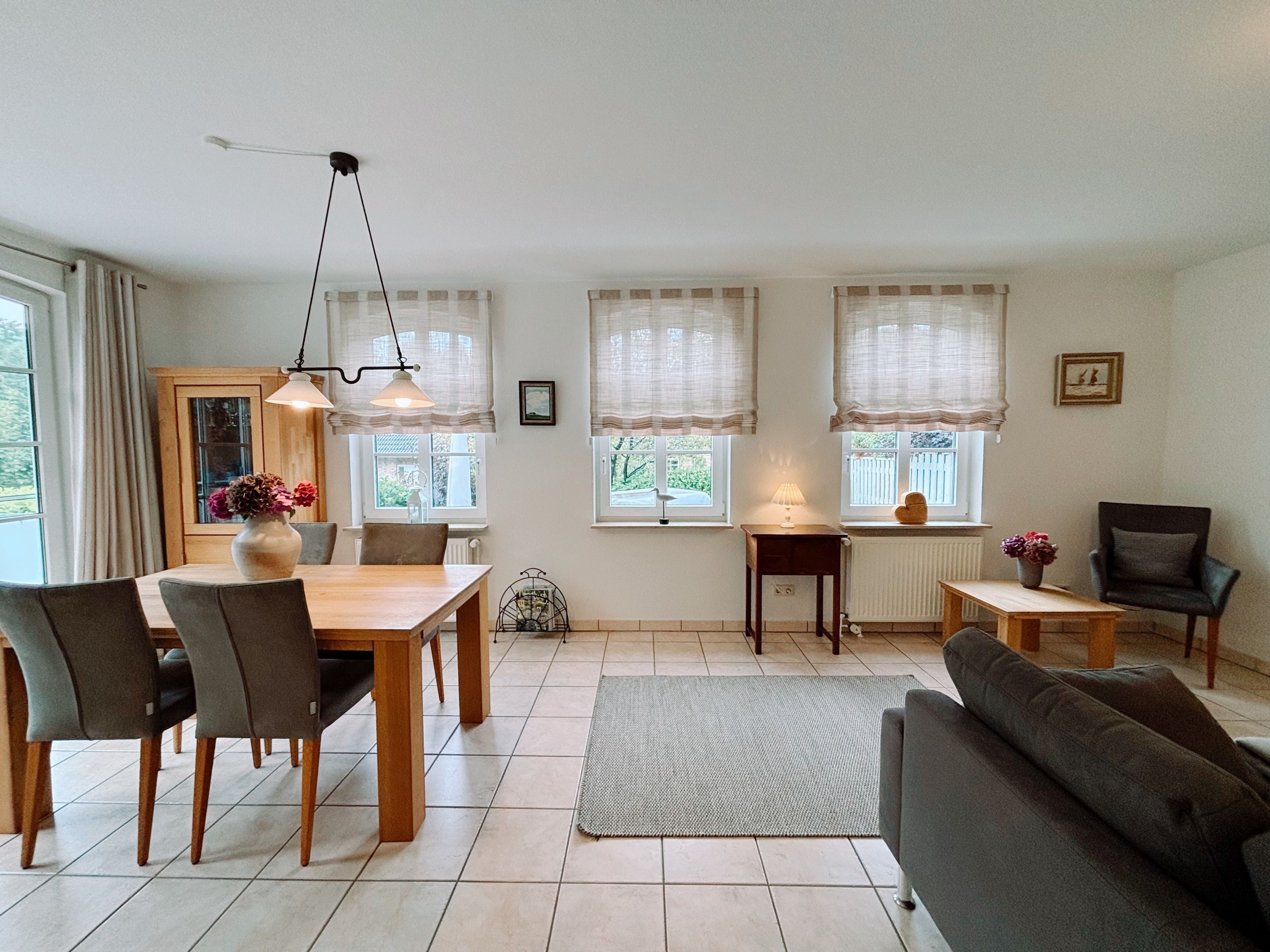 Das Ferienhaus Pauline wurde mit viel Liebe zum Detail eingerichtet und bietet auf zwei Stockwerken eine gemütliche und komfortable Atmosphäre. Im Erdgeschoss befindet sich eine großzügige, hell gestaltete Küche, die keine Wünsche offenlässt. Hier können Sie Ihre Lieblingsgerichte in vollen Zügen genießen, während Sie gleichzeitig den Blick auf den Glücksburger Wald schweifen lassen. Die Küche ist mit allen modernen Geräten ausgestattet, darunter ein Herd, ein Backofen, ein Geschirrspüler sowie eine Mikrowelle und ein Kühlschrank, sodass Sie für jeden Anlass bestens gerüstet sind. Direkt neben der Küche befindet sich der Essbereich, der genügend Platz für gemeinsame Mahlzeiten bietet und für eine gesellige Atmosphäre sorgt.