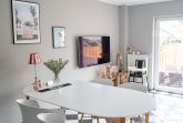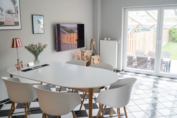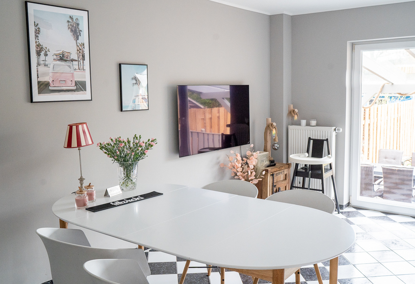 Unten befindet sich das Wohnzimmer. Ausgestattet mit einem 55 cm Smart TV, einem Esstisch mit Platz für sechs Personen und einer Couch, die ebenfalls als Schlafcouch genutzt werden kann.