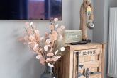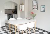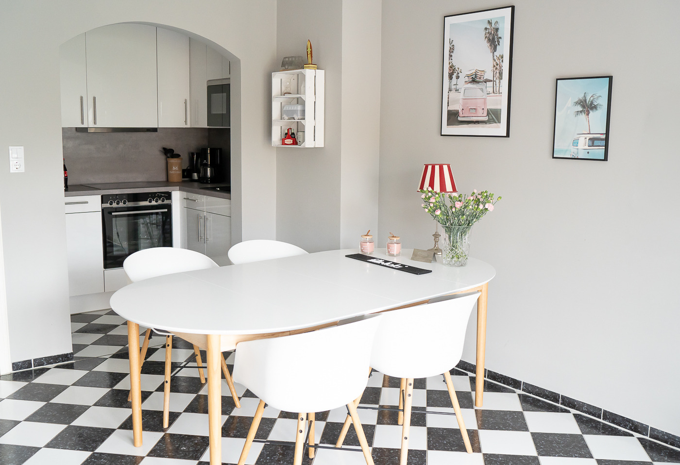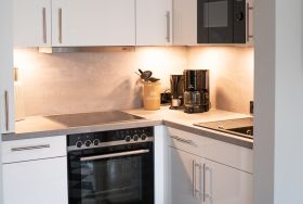 In einer Nische ist die neue Einbauküche mit einem Ceranfeld für vier Töpfe, einem Backofen, einer Mikrowelle und einem Geschirrspüler. Eine Filterkaffeemaschine, eine Kapselkaffeemaschine, ein Toaster und ein Wasserkocher sind vorhanden.