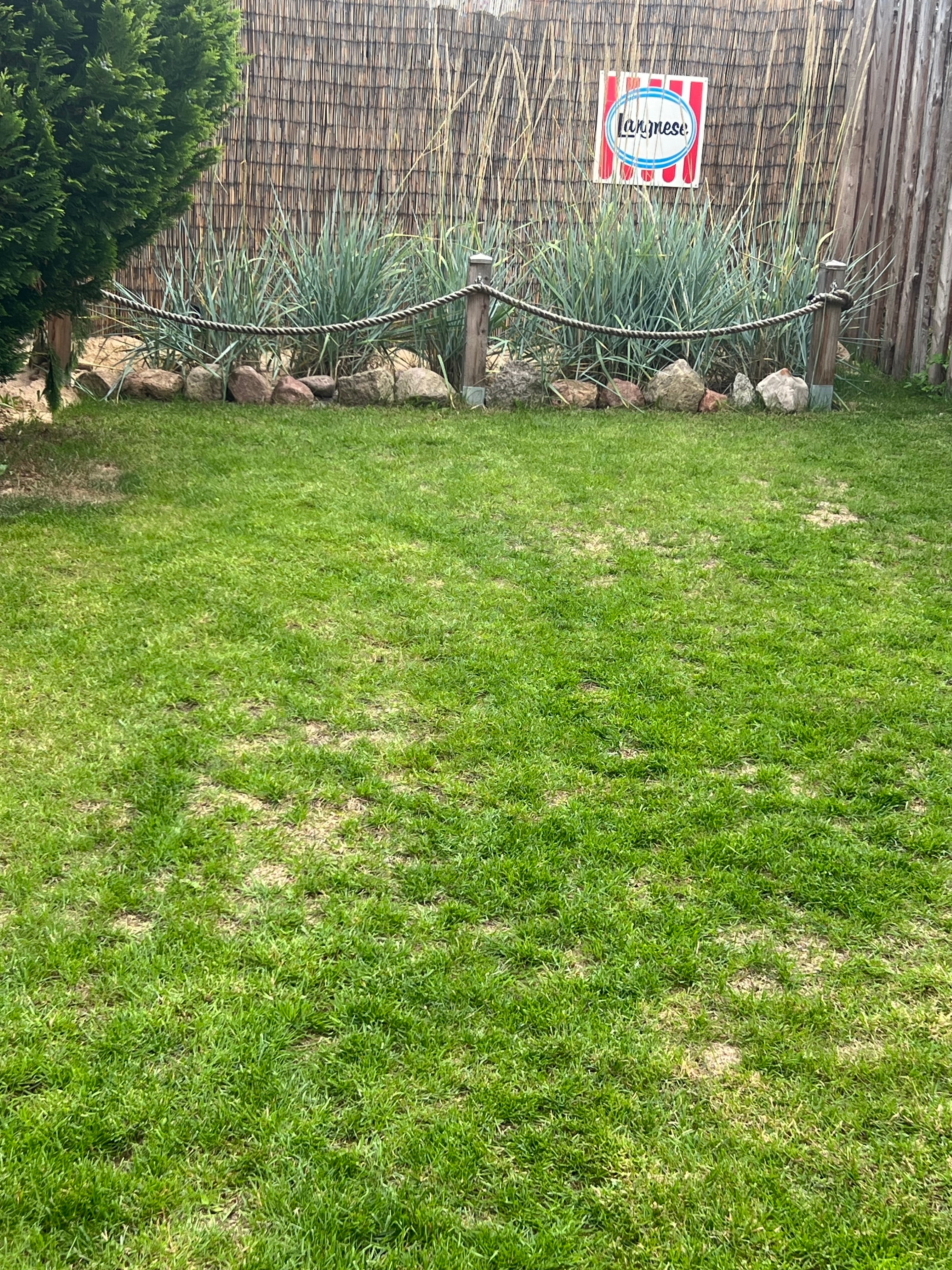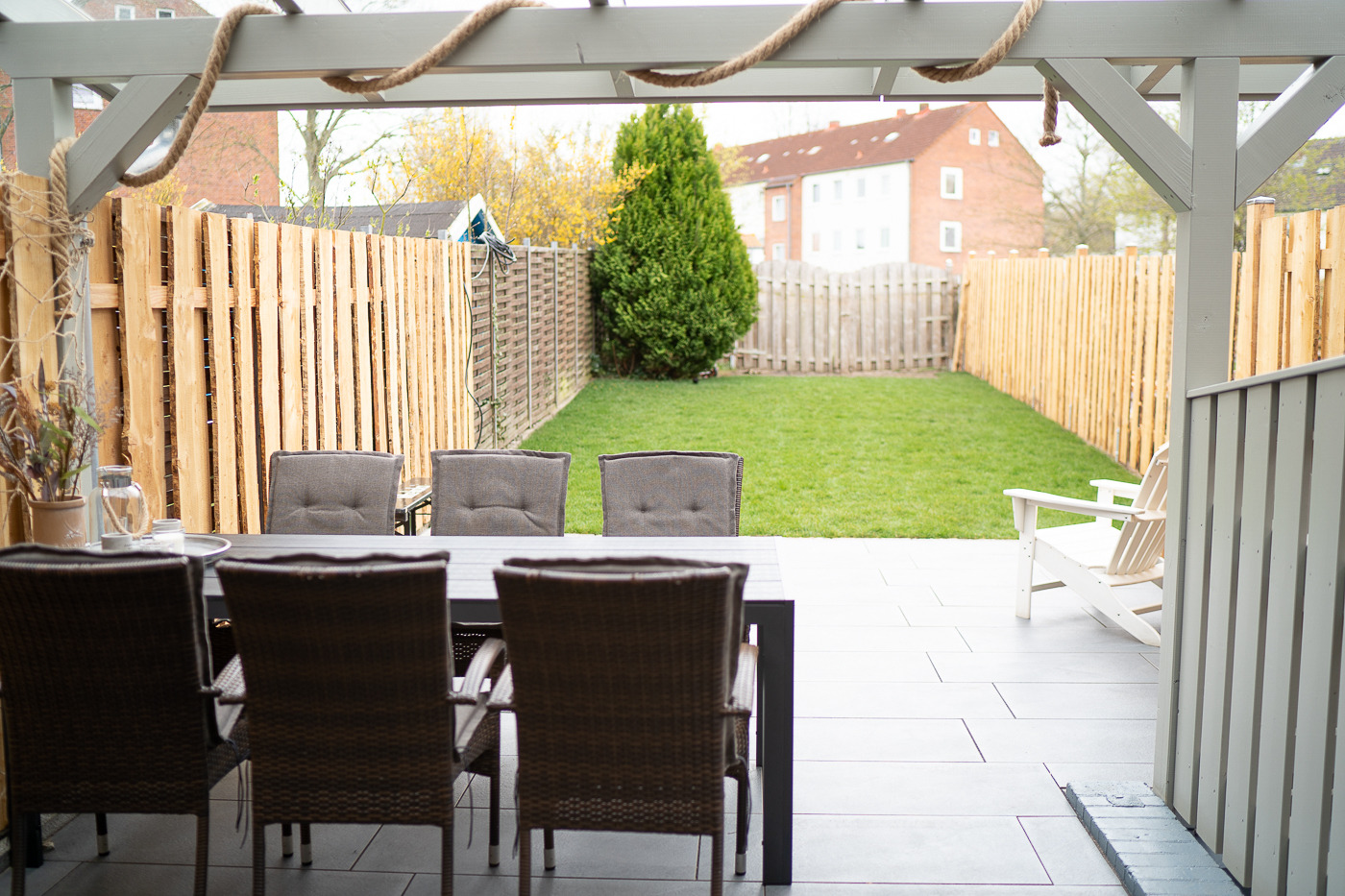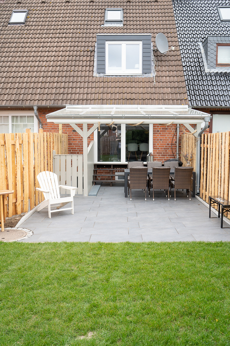 Die große Terrassentür führt Euch in den Garten. Eine Überdachung aus Glas sorgt für Schutz bei unbeständigem Wetter. Für die Kinder oder den Hund bietet der komplett umzäunte Garten Auslauf und Platz zum Toben.