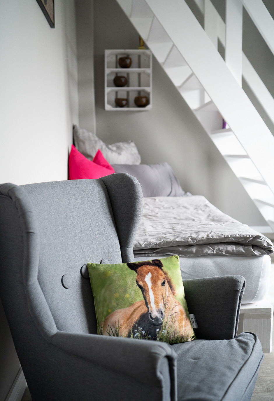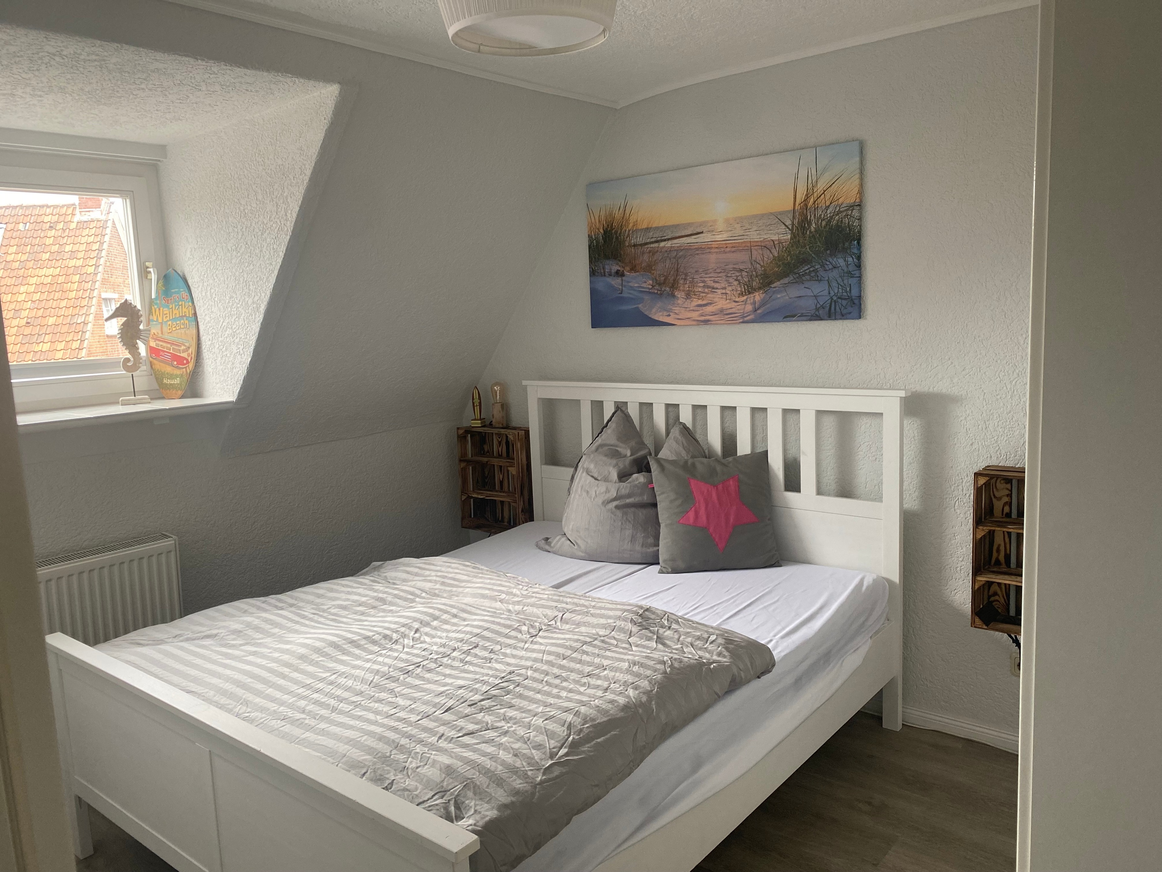 Die Treppe hinauf führt zu den Schlafzimmern. Ein Zimmer ist mit einem Doppelbett (180 x 200 cm) und einem Kleiderschrank ausgestattet. Das zweite Zimmer verfügt über ein Bett (90 x 200 cm) und ein Schlafsofa, das herausgezogen Platz für Zwei bietet. Dieses Zimmer ist gut für die Kinder geeignet.