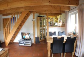 Das Wohnzimmer wird beheizt mit zwei Deckenpaneelen – Infrarot Wärmewellen - und zusätzlich gibt es einen Kaminofen, so dass auch in der kalten Jahreszeit der Gemütlichkeit kein Abbruch getan wird.