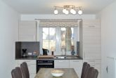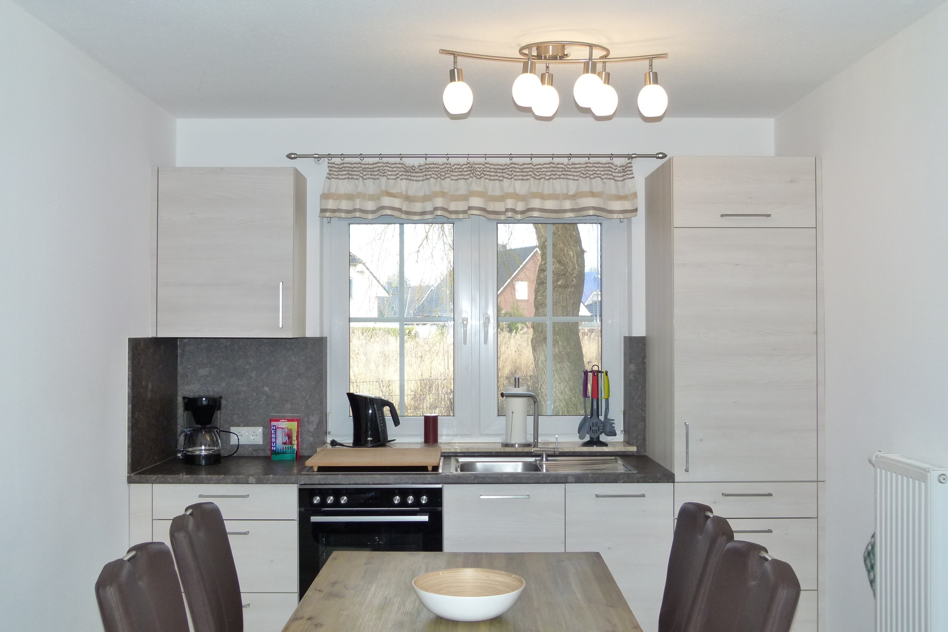 Die gut ausgestattete Küche besitzt unter anderem einen Kühlschrank, einen Herd zum Kochen und sogar eine Spülmaschine.