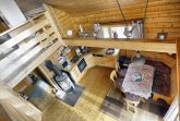 Im unteren Bereich gibt es einen großen Wohnraum mit Sofa, Relaxsesseln, Fernseher und integrierter gemütlicher Wohnküche mit Esstisch.