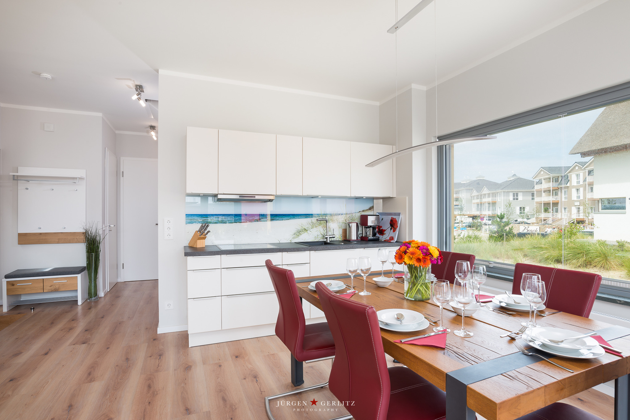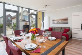 Der Essbereich bietet Platz für 6 Personen. Die offene, komplett ausgestattete Küchenzeile ermöglicht Ihnen ein Miteinander auch um die Mahlzeiten herum.