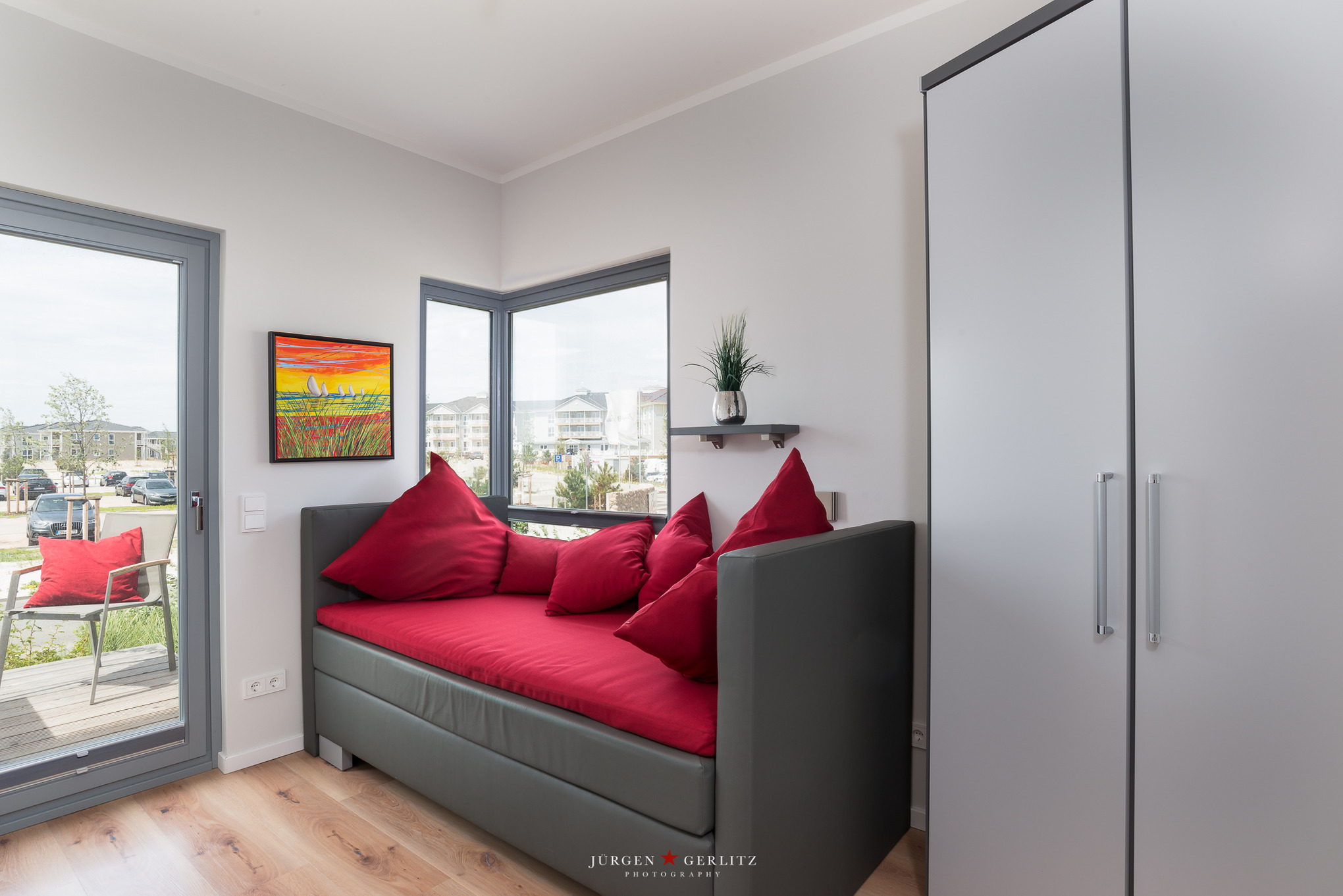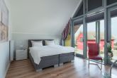 Das dritte Schlafzimmer ist im Erdgeschoß barrierefrei zu erreichen und mit einem Einzelbett ausgestattet. Alternativ kann dieser Bereich mit seiner Kissenlandschaft als Ruhe-, Lese- oder Rückzugsraum genutzt werden. Dieses Zimmer hat eine eigene Terrasse mit Blick auf den Binnensee.