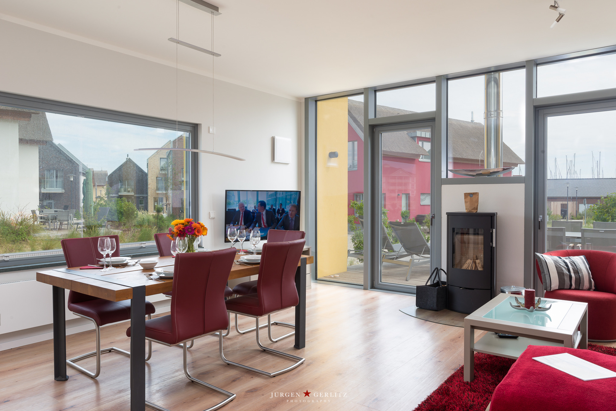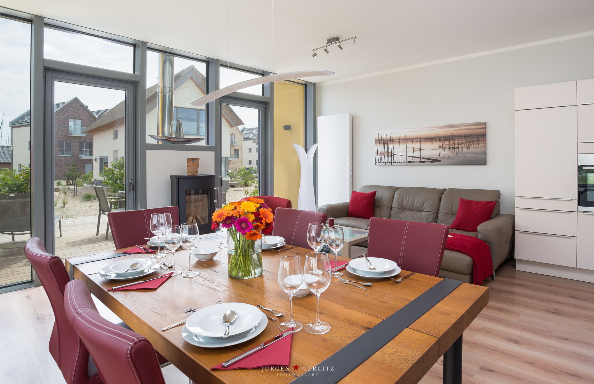 Das Wohnbereich ist hochwertig und modern mit einer Sitzgruppe aus Leder eingerichtet. Ein Kaminofen sorgt zusätzlich für Gemütlichkeit.