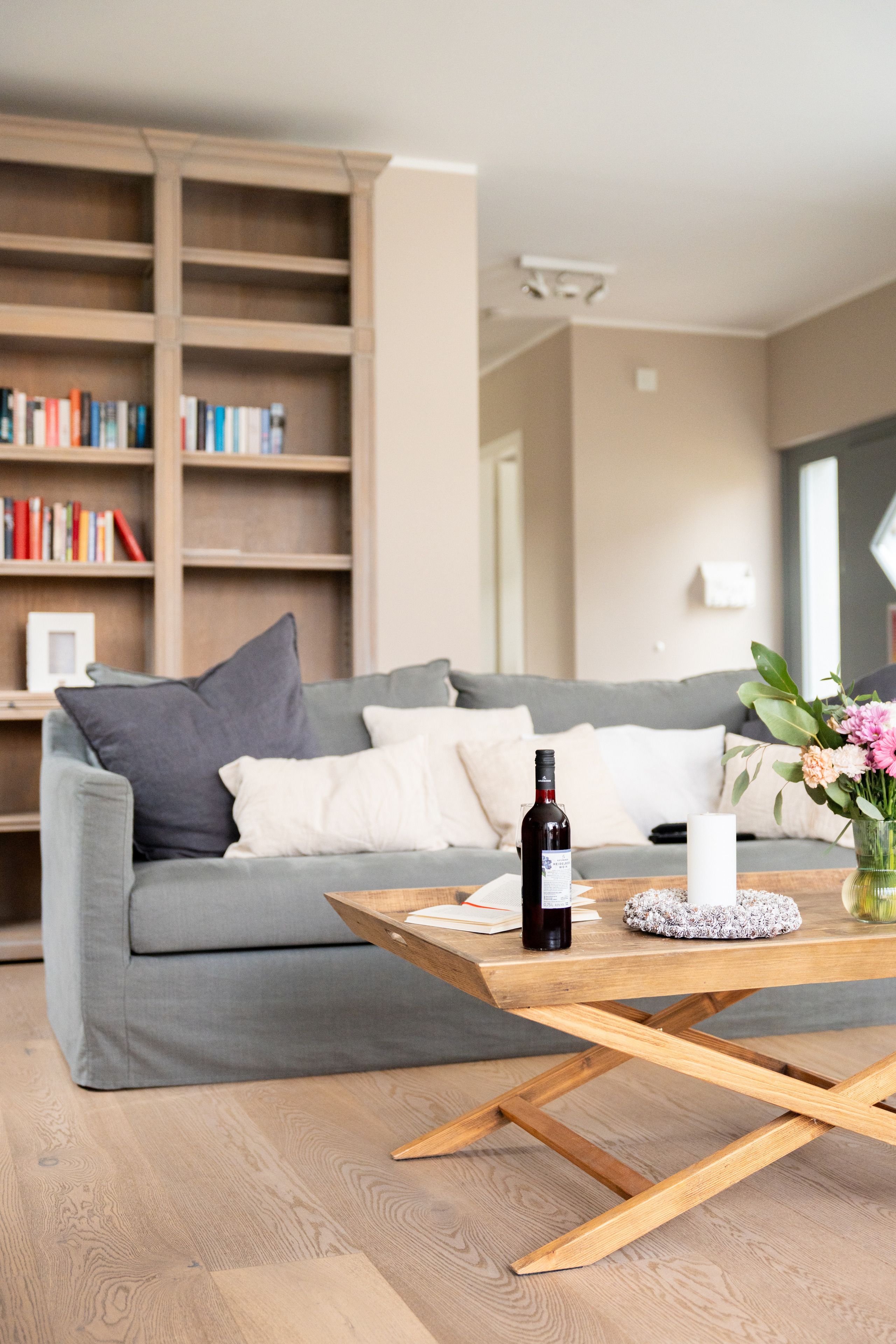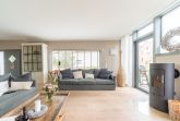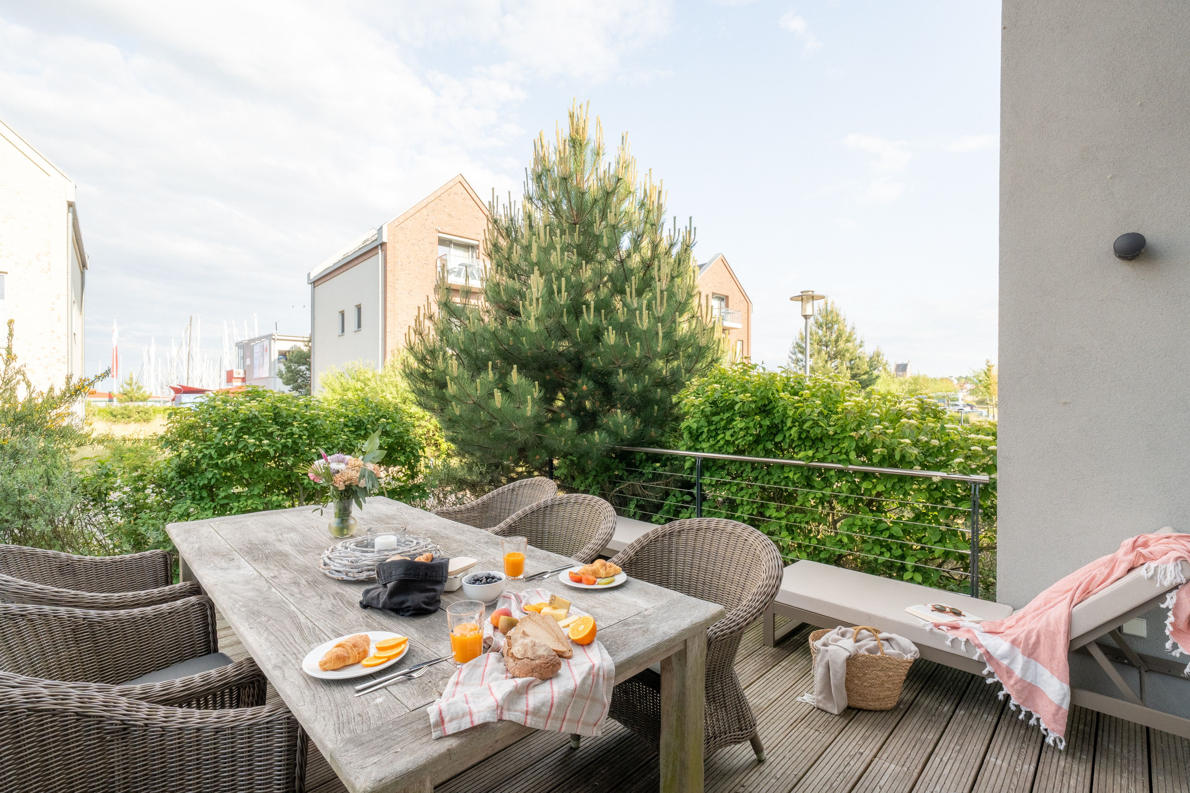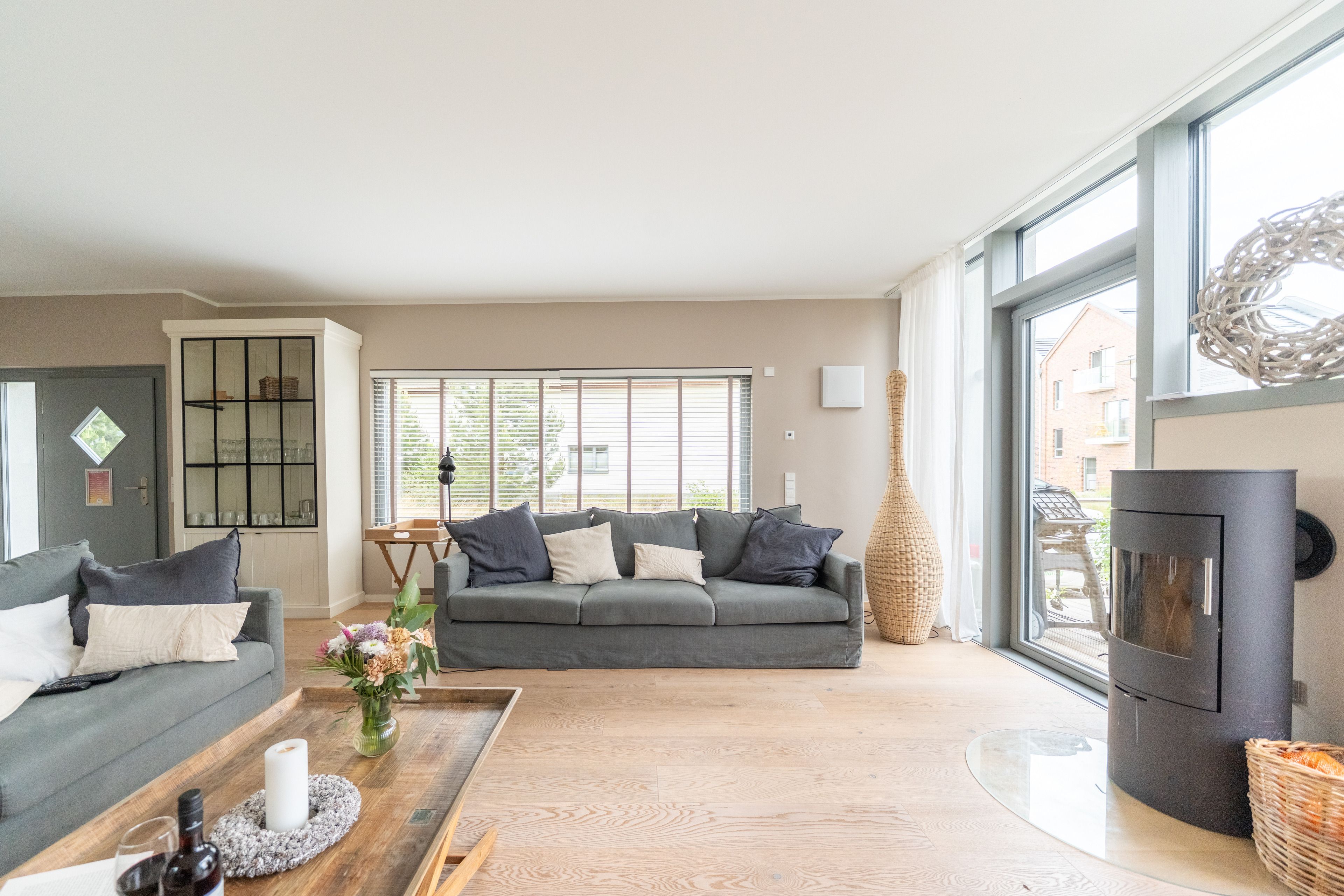Im Erdgeschoß empfängt Sie ein großzügiger Wohnbereich mit Kaminofen, Fernseher und bequemen Sofamöbeln. Durch die große Glasfront im Wohnraum haben Sie einen tollen Blick auf die Sonnenterrasse (30 qm), die zum Sonnenbaden, Ausruhen und Verweilen, aber auch zum Grillen und Beisammensein einlädt. Hinzu kommt ein toller Blick von der Sonnenterrasse und vom Wohnzimmer auf den Segelhafen.