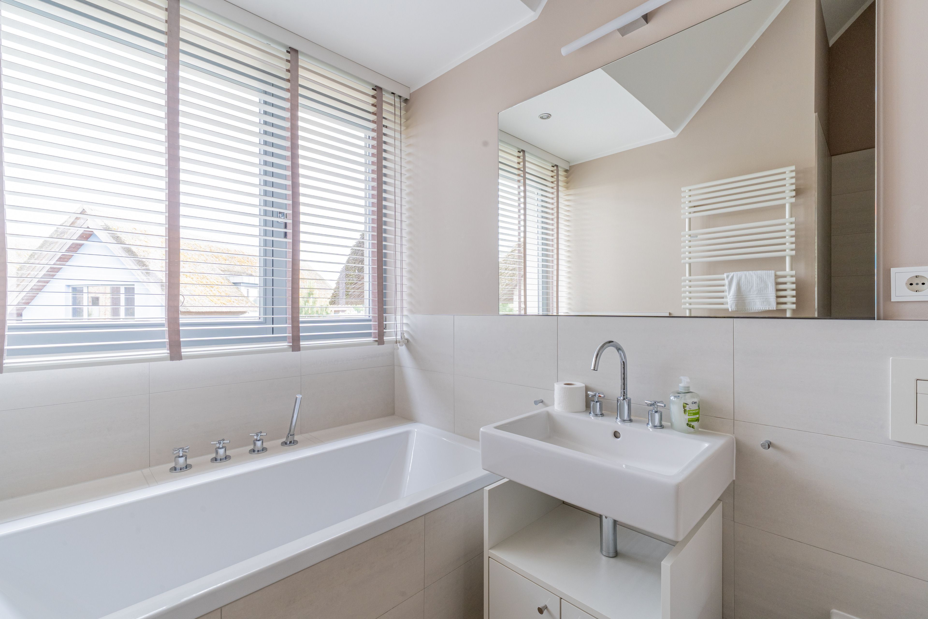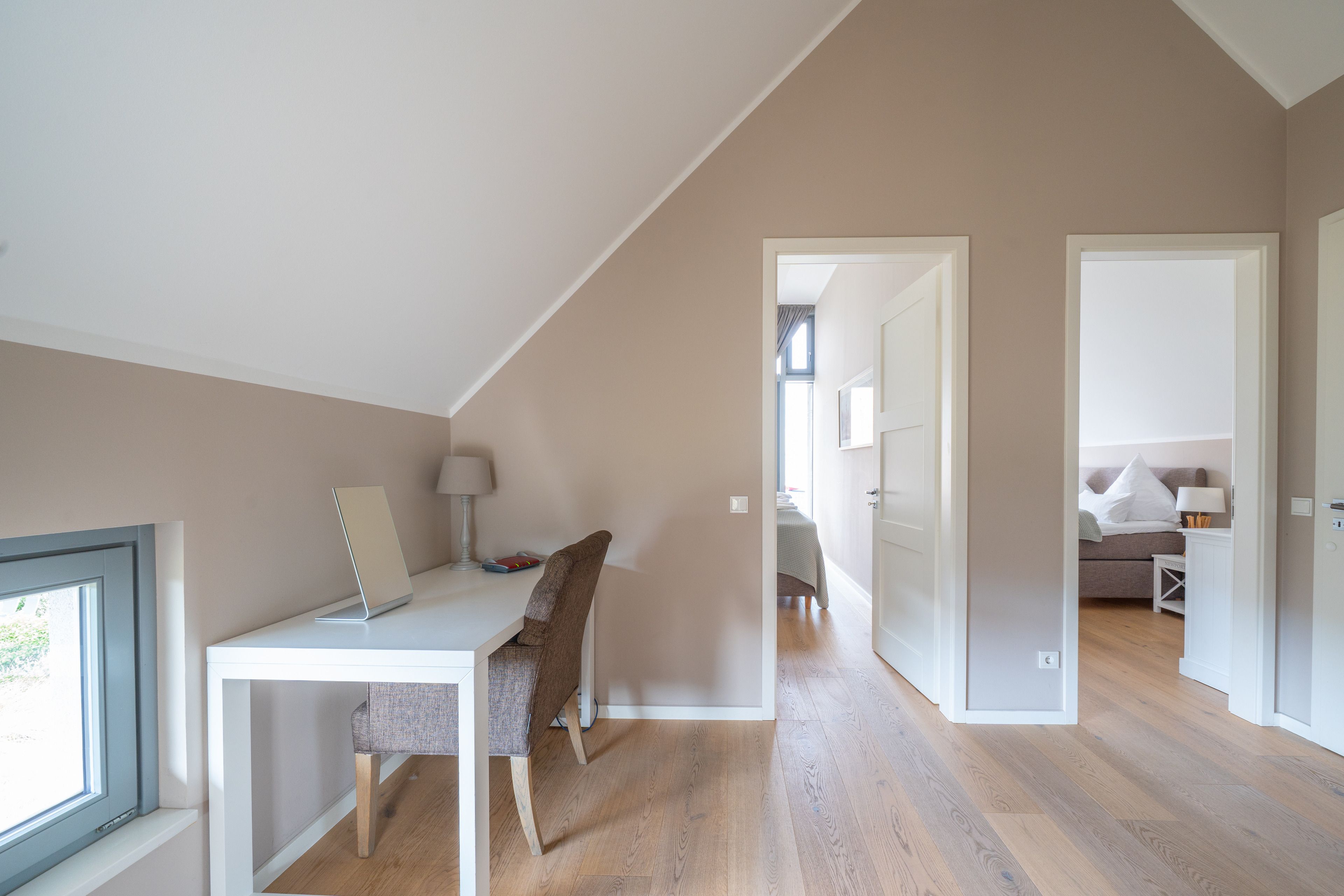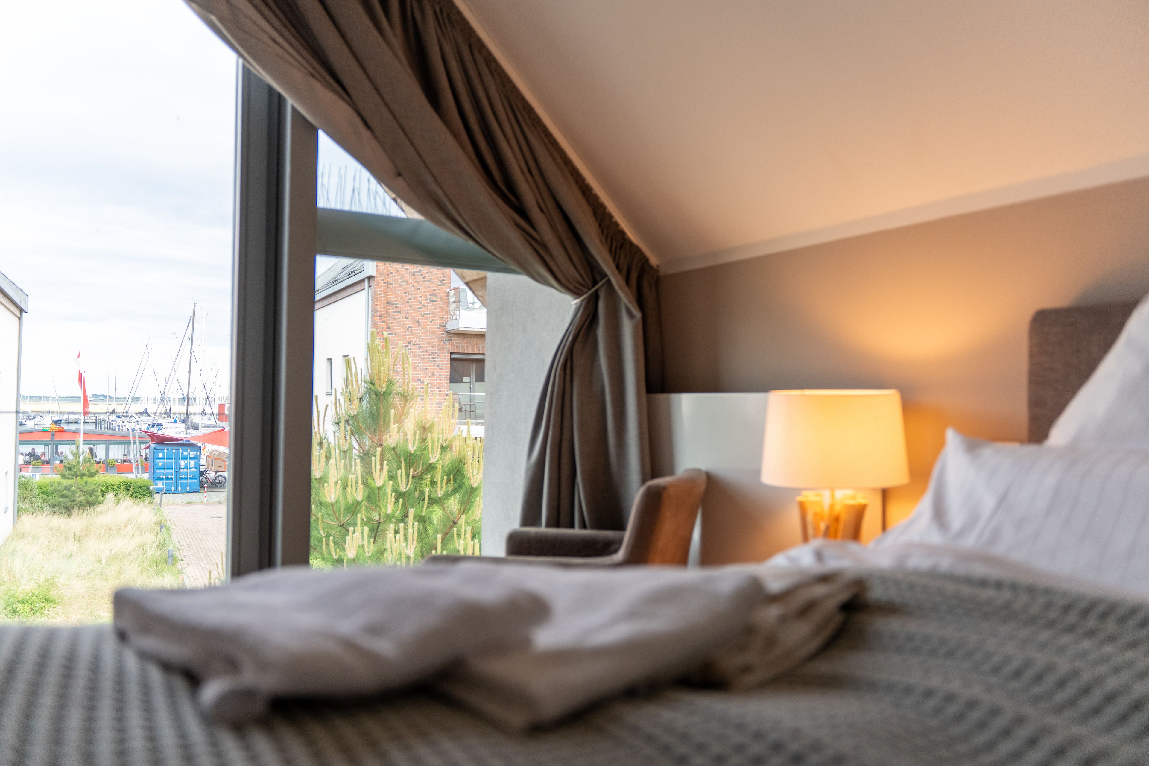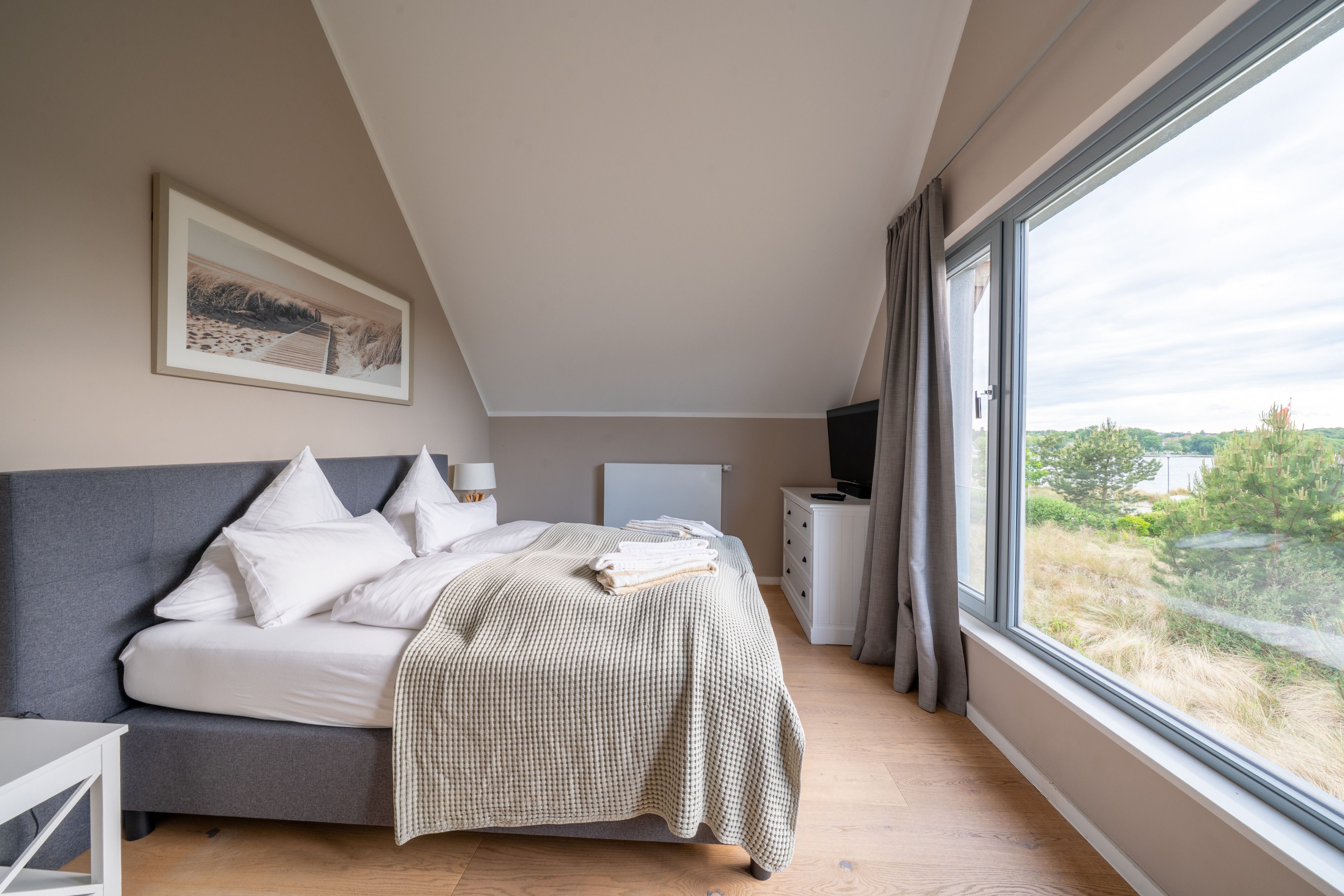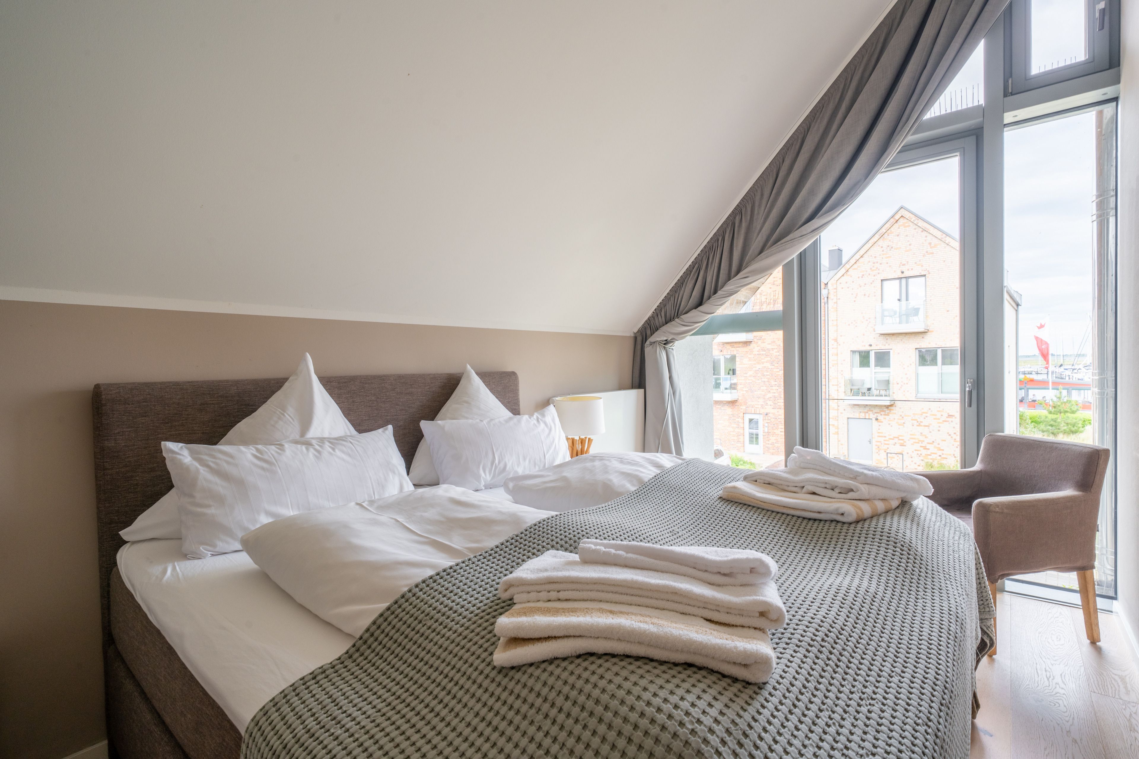 Im Obergeschoß warten drei helle Schlafräume und ein großes Bad auf Sie. 2 Schlafzimmer gewähren einen Blick auf den Segelhafen, von dem dritten Schlafzimmer hat man einen schönen Blick auf den Binnensee. Das exklusive Badezimmer ist schön ausgestattet und verfügt über eine große Dusche und eine Badewanne zum Entspannen für ruhige Mußestunden.