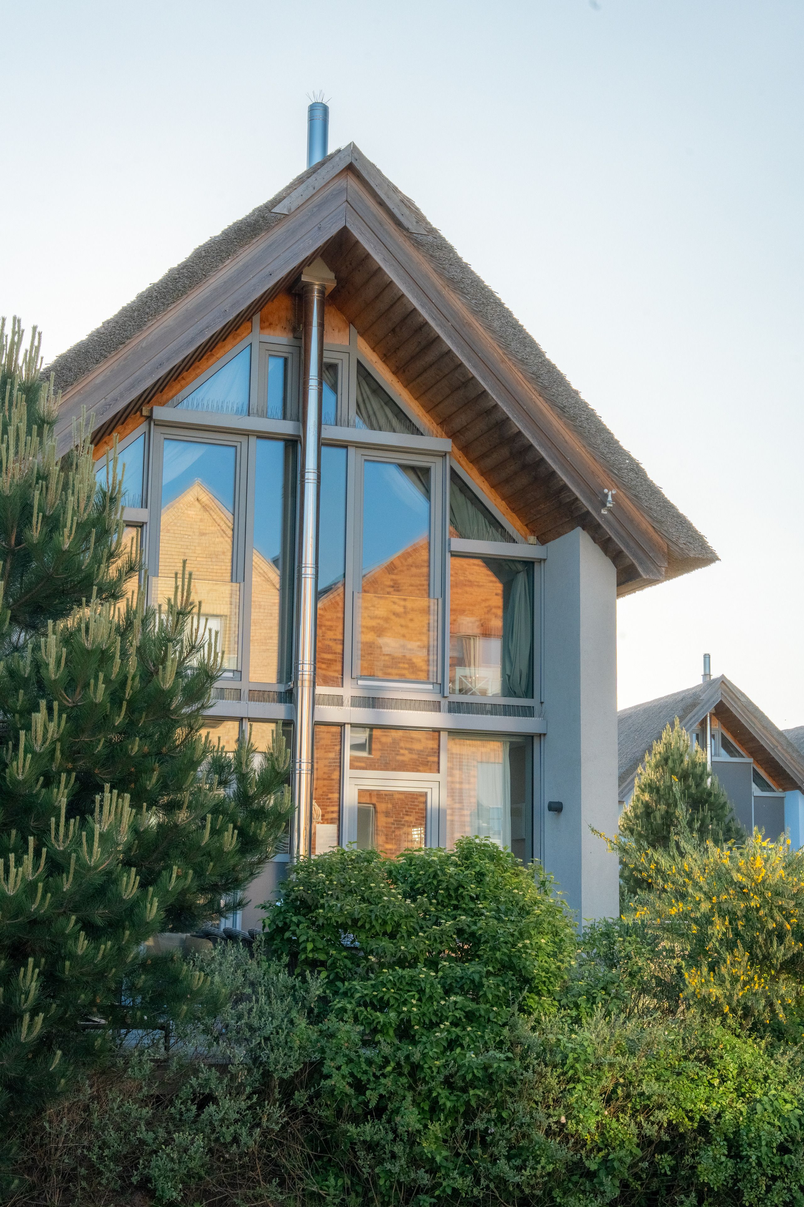 Das freistehende Reetdachhaus Newport steht im 5 Sterne Resort auf dem Graswarder umgeben von einer Dünenlandschaft.