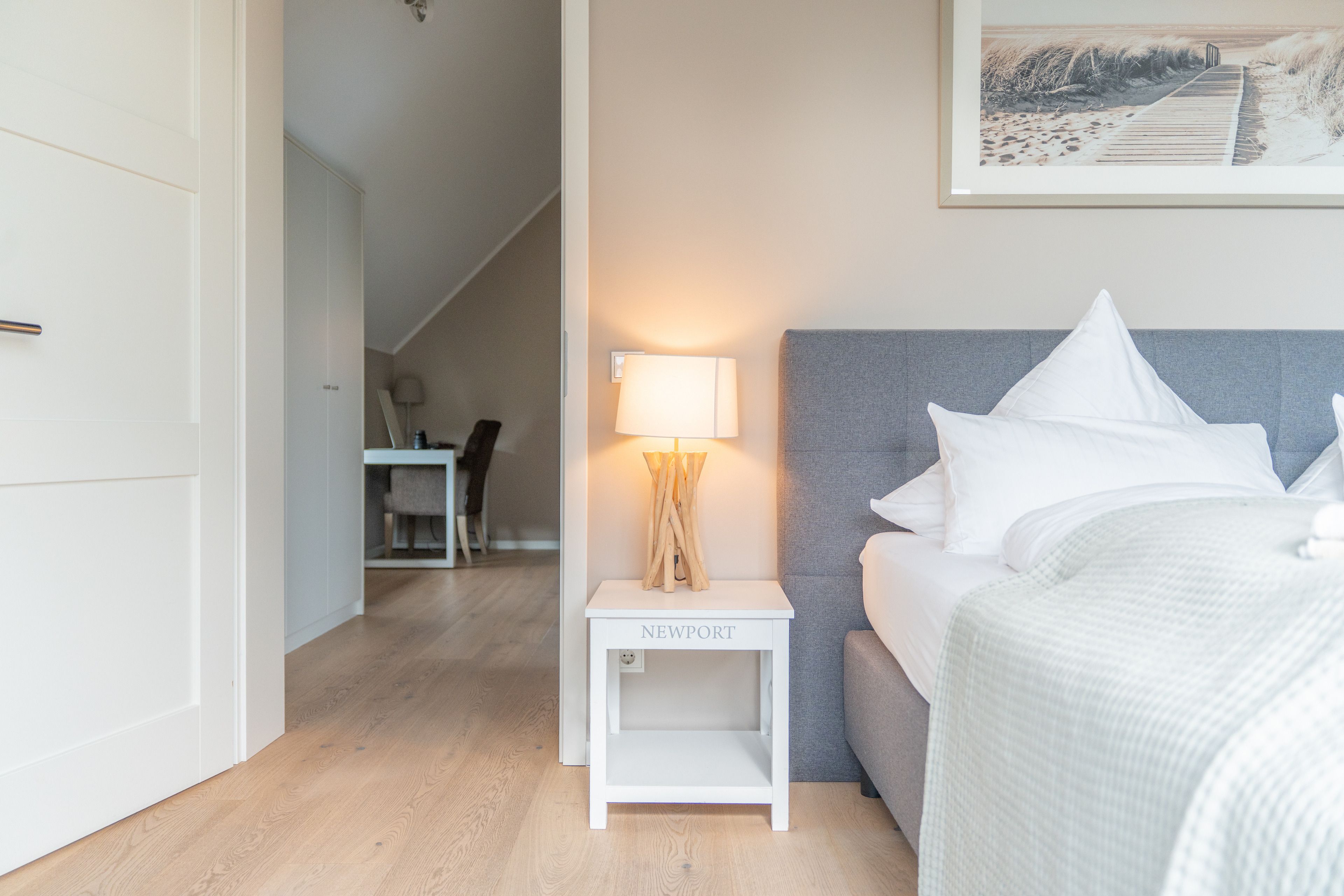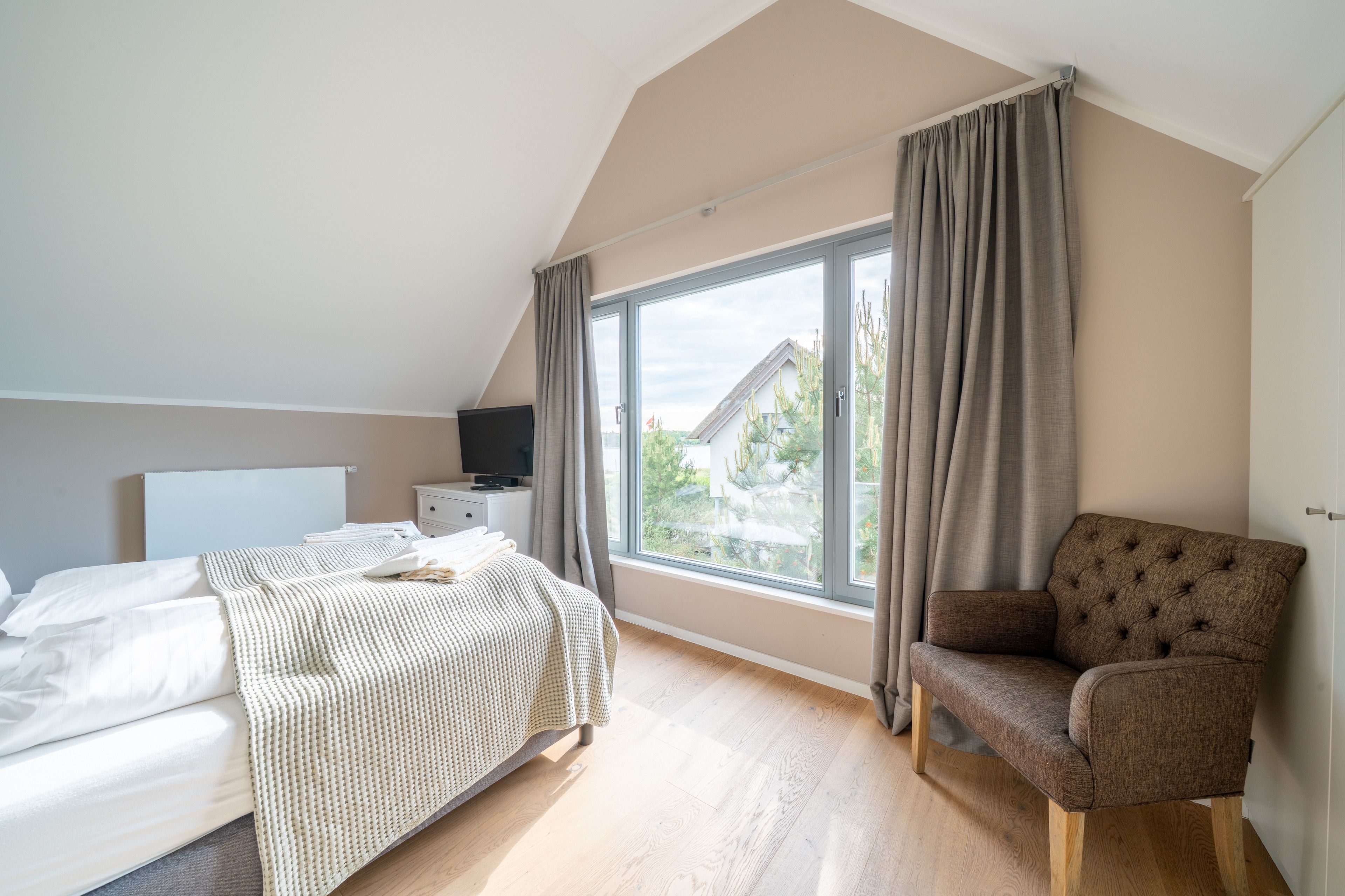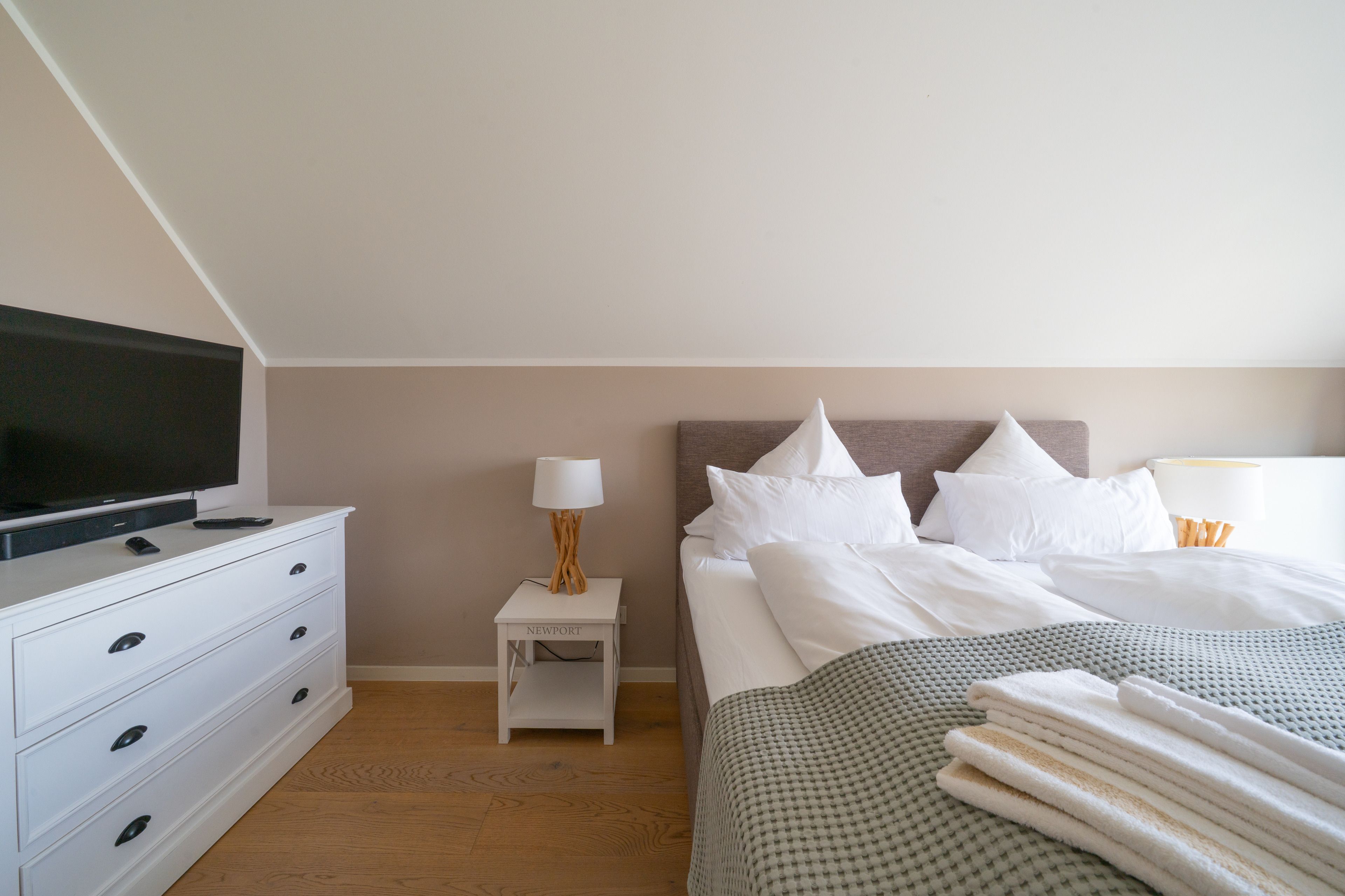 Alle drei Schlafzimmer sind mit großen, komfortablen Boxspringbetten (180 cm x 200 cm) und je einem UHD-TV ausgestattet. Ein Kinderreisebett, welches nach Wunsch in einem der Zimmer aufgestellt werden kann, rundet das Schlafangebot ab. Selbstverständlich steht Ihnen genügend Stauraum für die Garderobe in großzügigen Einbauschränken zur Verfügung.