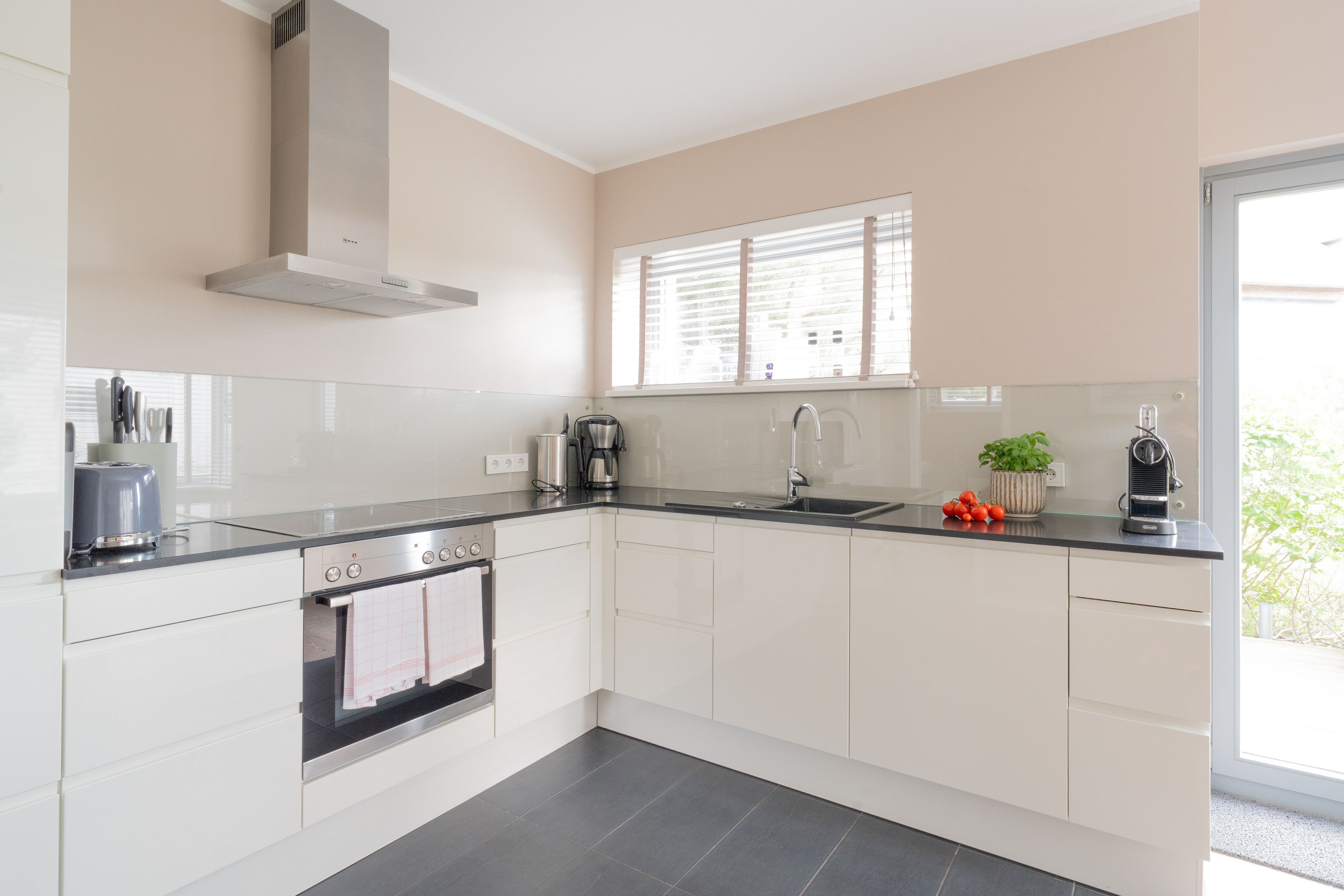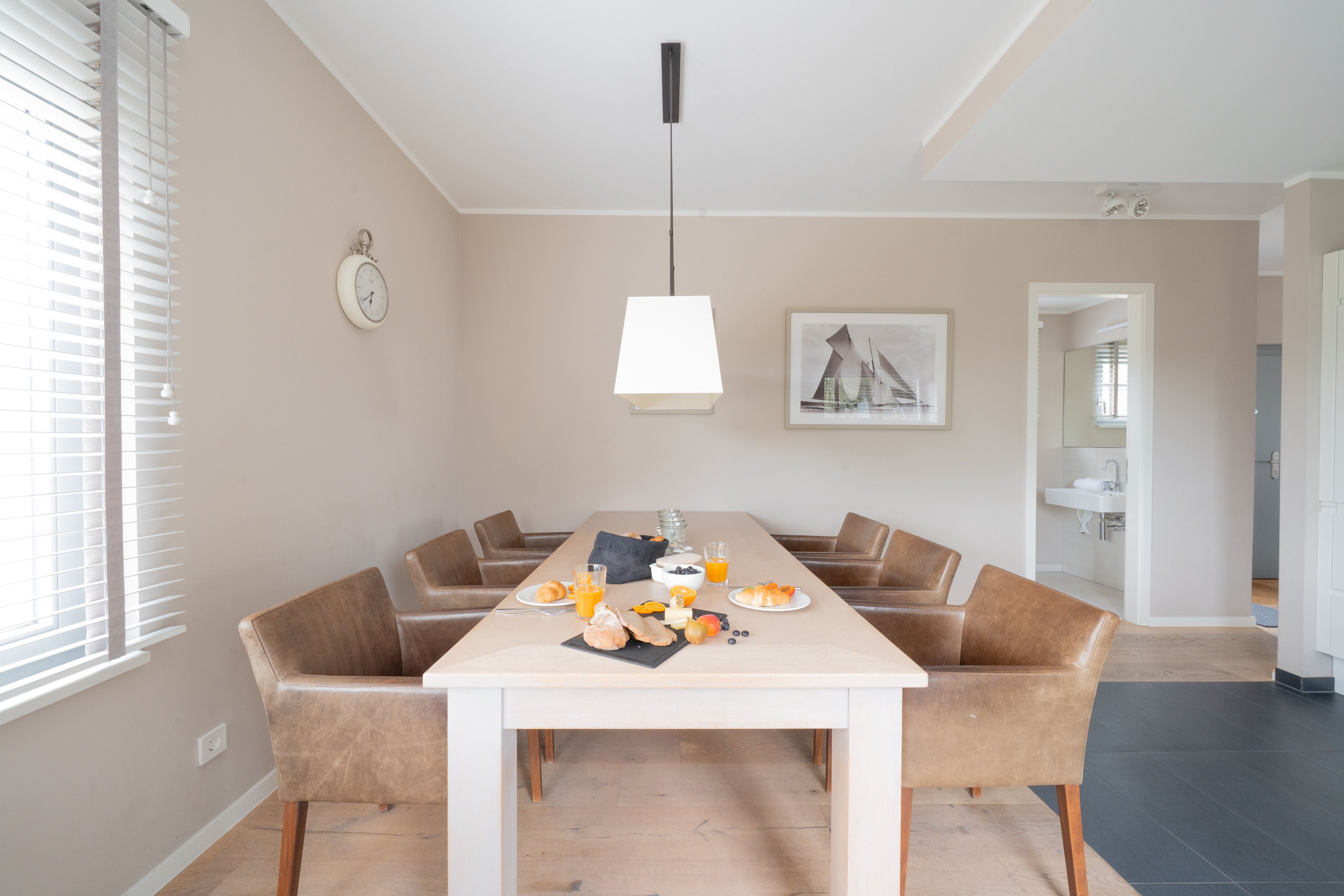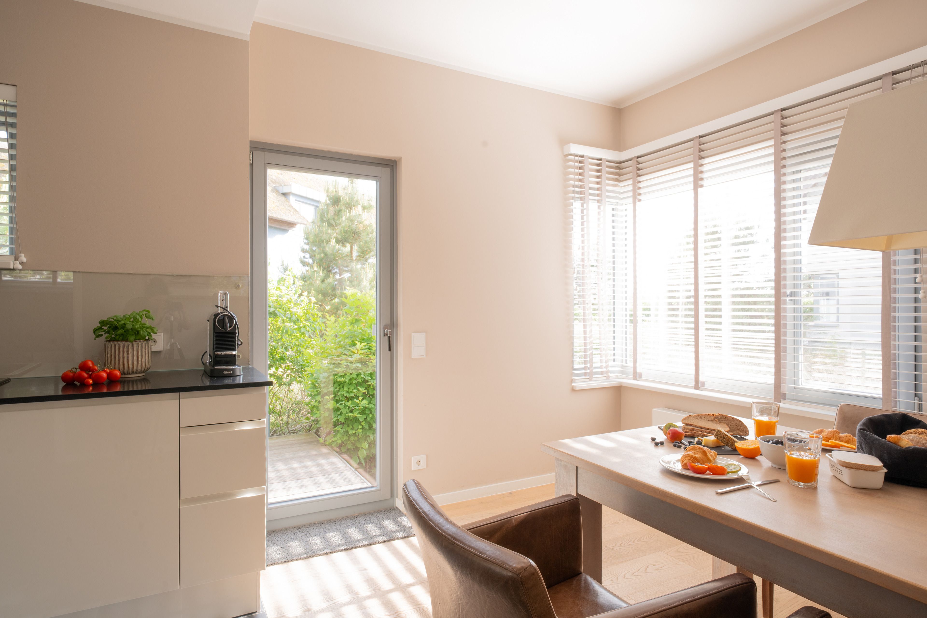 Im hinteren Bereich des Erdgeschosses erwartet Sie eine voll ausgestattete Küche mit einem großzügigen Esssitzbereich für 6 Personen. Hinzu kommt noch ein Garderoben-Bereich und ein Gäste-WC.