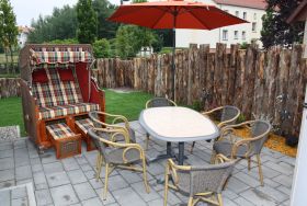 Eine Terrasse mit Gartenmöbeln und einem Strandkorb, zwei