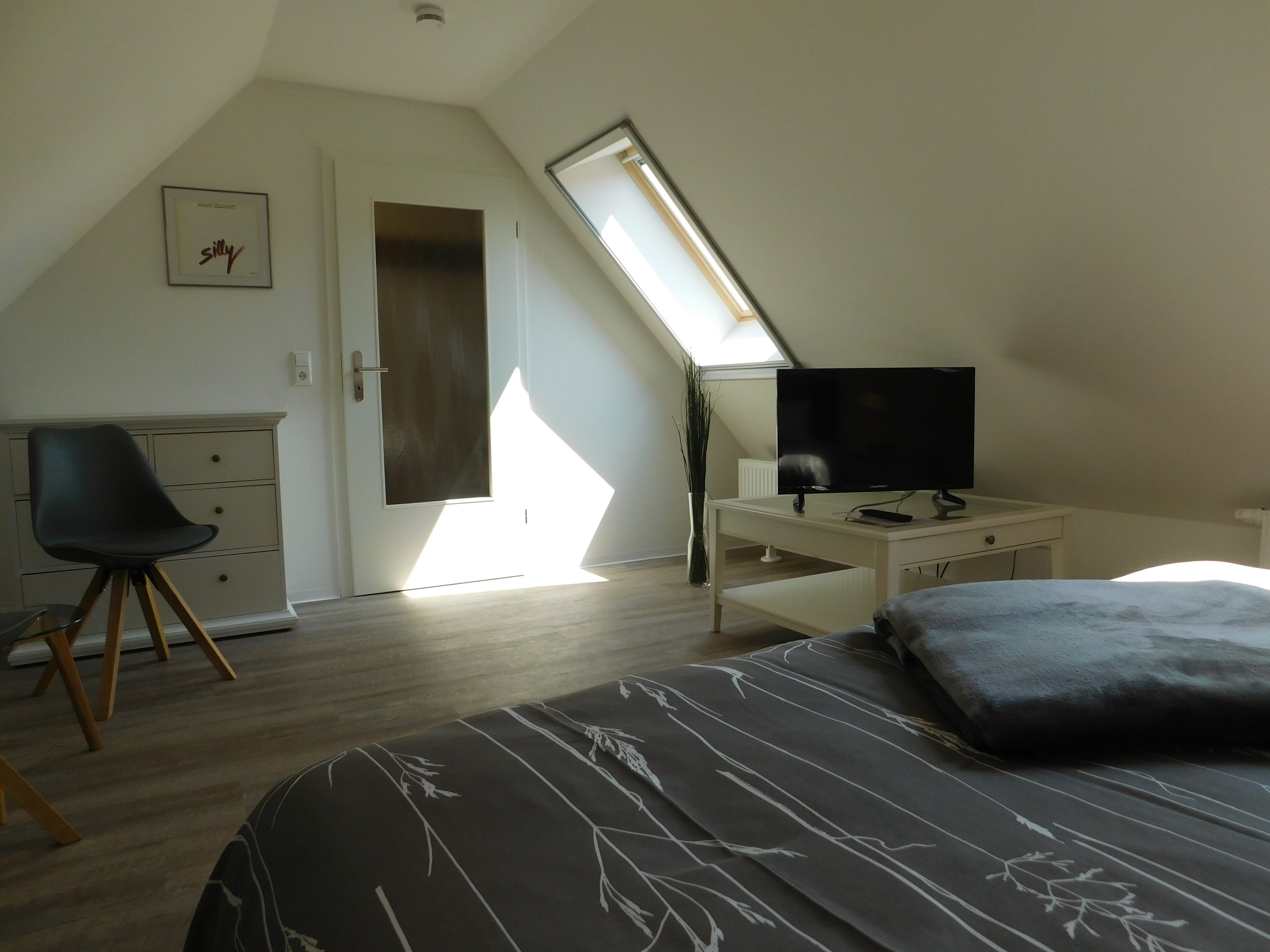 Das Bad ist mit einer ebenerdigen Dusche ausgestattet. Über eine bequeme kleine Treppe kommen Sie in das gemütliche Schlafzimmer im Dachgeschoss.