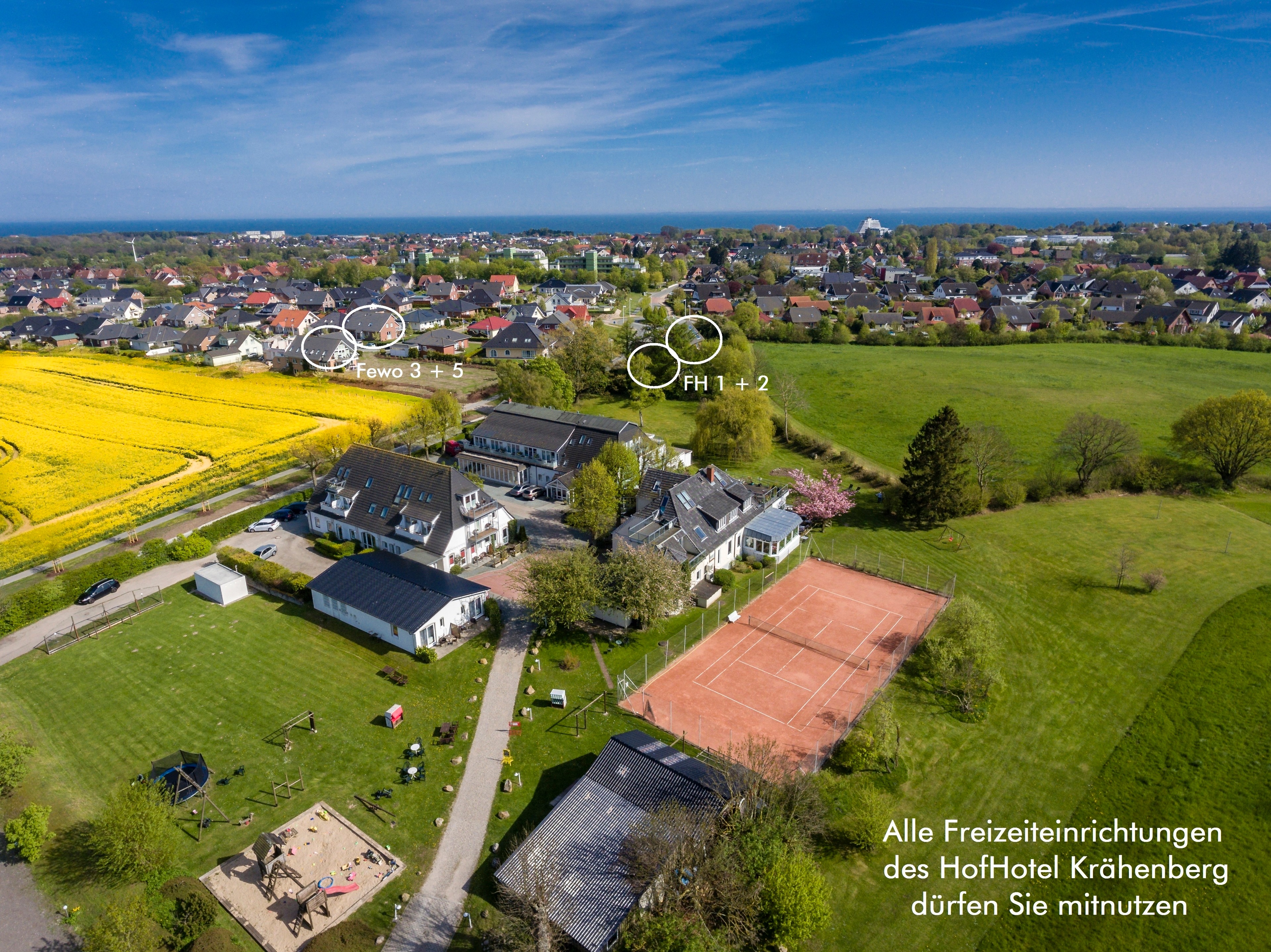 Das Ferienhaus II ist idyllisch und ruhig auf dem Grundstück des HofHotels Krähenberg gelegen, mit Blick in die freie Natur. FH II, 150 qm, hat 4 DZ, 1 EZ und ein 2. Wohnzimmer mit Doppelschlafcouch, einen großen Wohn-/Essraum mit integrierter Küche und eine große Gartenterrasse, 2 TVs, Sat-Anlage, 4 Bäder - eines mit Badewanne. Im EG behindertengeeignet: 2 Duschen ohne Wanne und 90 cm breite Türen, max. 11 Personen, ein Kinderbett ist vorhanden. Ideal für Großfamilien oder kleine Gruppen.