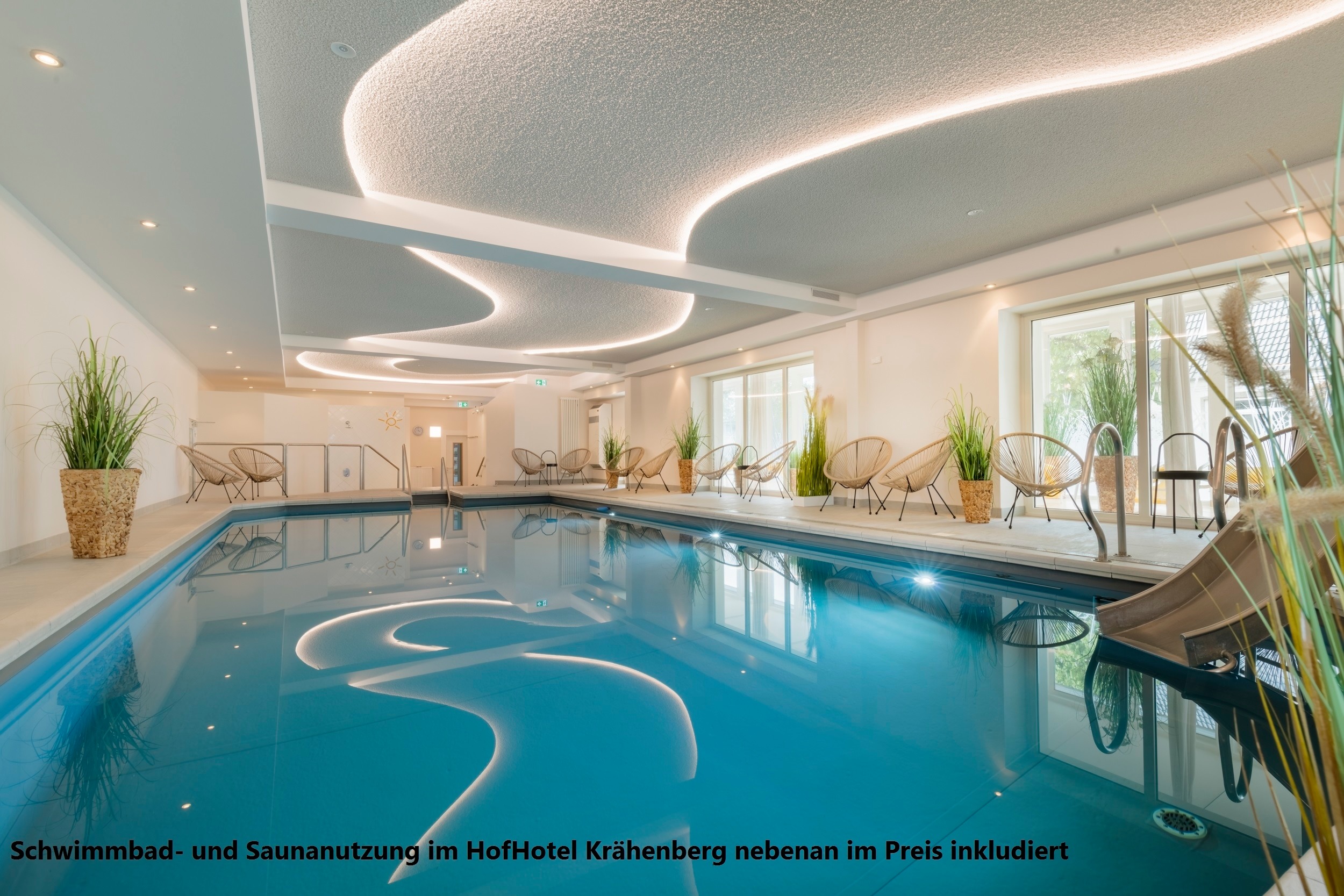 Die Nutzung der Freizeitangebote des HofHotels Krähenberg, z. B. Wellness-Oase mit Schwimmbad, Sauna ist schon bezahlt und für Sie kostenfrei nutzbar. Wellnessbehandlungen, Saunatücher, Bademäntel und Hotelfahrräder gegen Gebühr.