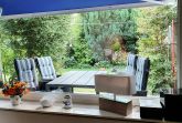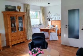 Unsere Doppelhaushälfte befindet sich auf einem eingefriedeten Grundstück. Bei der Hausnummer 31D handelt es sich um ein Endhaus von 2 aneinander gebauten Doppelhäusern. Der zur Strasse gelegene Vorgarten ist umzäunt, zur benachbarten Doppelhaushälfte 31C aber nicht abgetrennt. Das Haus verfügt im Erdgeschoss über Küche, Flur, Gäste-WC und ein Wohn-Esszimmer, im Obergeschoss ein großes und ein kleines Schlafzimmer sowie Bad-WC. Eine Belegung ist mit 3 Personen möglich - zusätzlich kann ein Kleinkind in einem Kinderreisebett untergebracht werden. Virtueller Rundgang: Im Erdgeschoss unseres Hauses befindet sich rechts vom Flur/Treppenhaus die Küche mit modernen Einbaumöbeln, Ceranfeld mit 4 Kochstellen, Dunstabzugshaube, Backofen, Geschirrspüler, Spüle, Kühl-/Gefrierkombination, Mikrowelle, Kaffeemaschine, Wasserkocher, Toaster und einer breiten Auswahl an Küchen-/Kochutensilien sowie Gläsern/Geschirr. Links zwischen Haustür und Treppenaufgang findet sich das kleine Gäste-WC. Wir gehen nun im Flur mit seiner maritimen blau-weißen Streifentapete sowie Abstellmöglichkeiten unter der Treppe geradeaus weiter in das geräume L-förmige Wohn-/Esszimmer. Die Essecke ist mit Weichholzmöbeln ausgestattet. 4 Personen haben hier bequem Platz. Der Tisch ist zusätzlich ausziehbar, eine Weichholzvitrine rundet das ganze Ensemble ab. Den Wohnbereich haben mit einer bequemen 3er-Sitzkombination in schwarzem Leder ausgestattet. Hier kann nicht nur die Rückenlehne nach hinten verstellt, sondern für einen gemütlichen Fernseh-/Filmabend können auch die Beine hochgelegt werden. Über eine Infrarotfernsteuerung werden individuell die vorhandenen Standleuchten für ein gemütliches Ambiente ein- und ausgeschaltet. Der moderne Flachbildfernseher mit einer Diagonale von 140 cm verfügt über Satelliten-TV sowie Smart-TV, so dass über Internet Mediatheken und/oder Netflix angesteuert werden können. Unterhalb des Fernsehers bietet eine Weichholzkommode viel Stauraum und Platz für den vorhandenen DVD-Player. Durch ein Fenster im Essbereich wie das große Panoramafenster im Wohnbereich ist der gesamte Wohnraum lichtdurchflutet und bietet zudem einen schönen Blick auf die Terrasse und ins Grüne. Eine Verdunkelung ist jederzeit durch die Außenrolläden möglich. Rundfunkempfang ist sowohl über TV als auch eine separate Stereoanlage mit CD-Player möglich. Auf der Süd-West-Terrasse finden Sie einen großen Tisch und 4 bequeme Rattan-Stühle mit Sitzauflagen, deren Rückenteile verstellbar sind. Eine 4m breite Markise sorgt für die ggfls notwendige Beschattung. Der kleine Garten ist rundherum eingezäunt. Ein kleiner Efeu-berangter Pavillon lädt zum Genuß der Morgensonne ein.