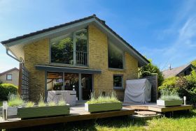 Ansprechendes, gemütliches Ferienhaus im dänischen Stil - mit hellen, lichtdurchfluteten Räumen - auf Endgrundstück in einem Ferienhaus-Gebiet, DIREKT AM STRAND von Karlsminde gelegen. Luftlinie zum Wasser ca. 250m.