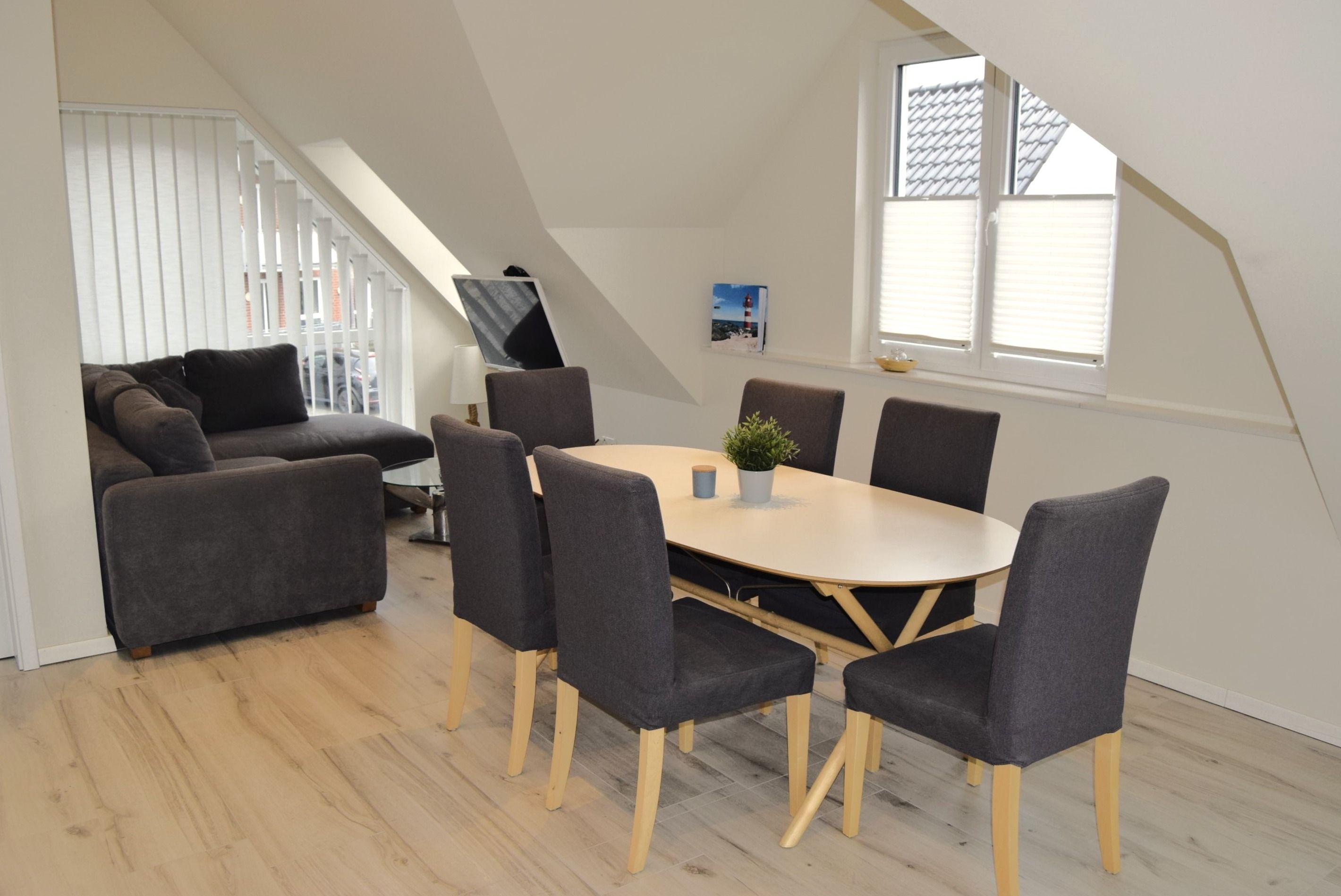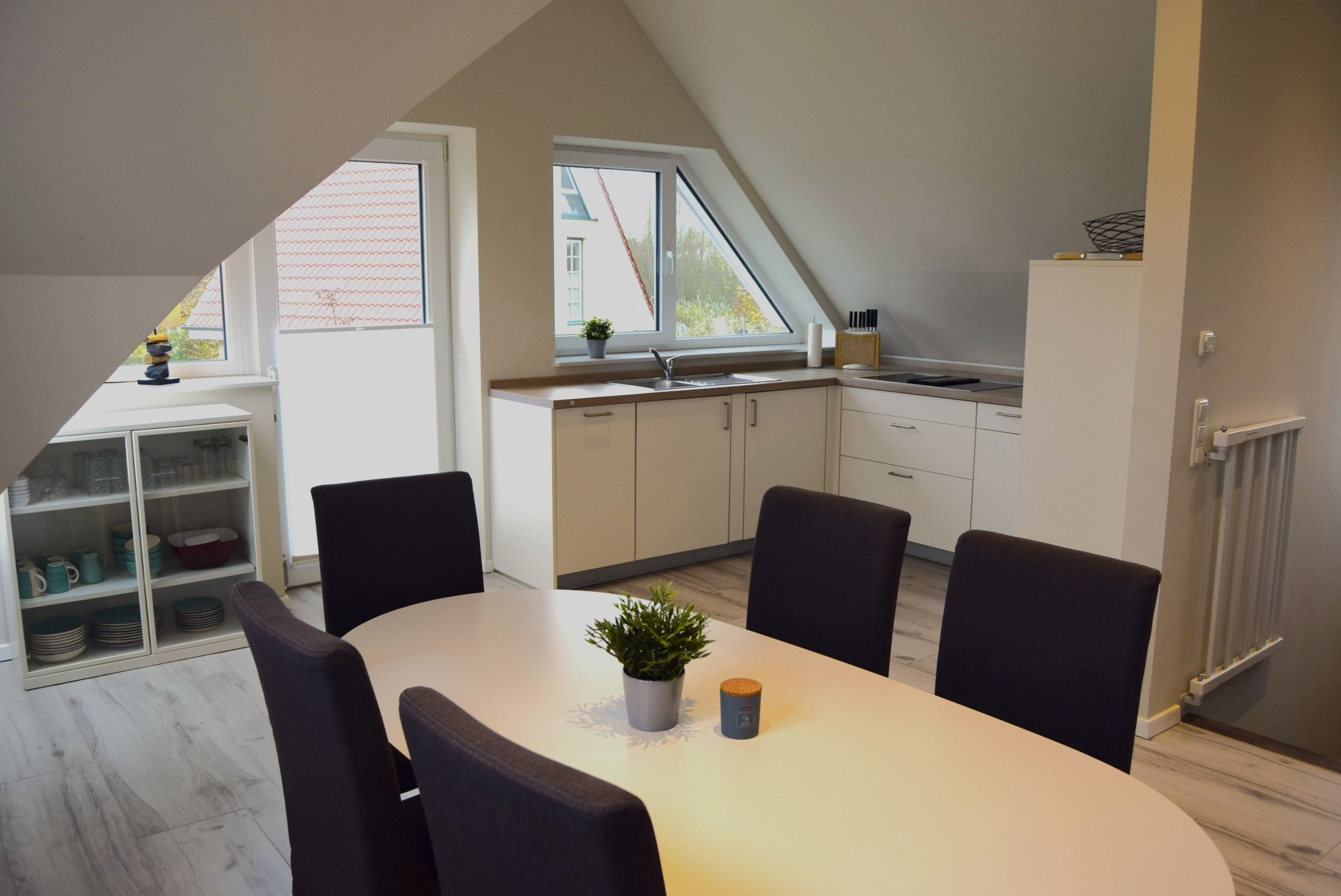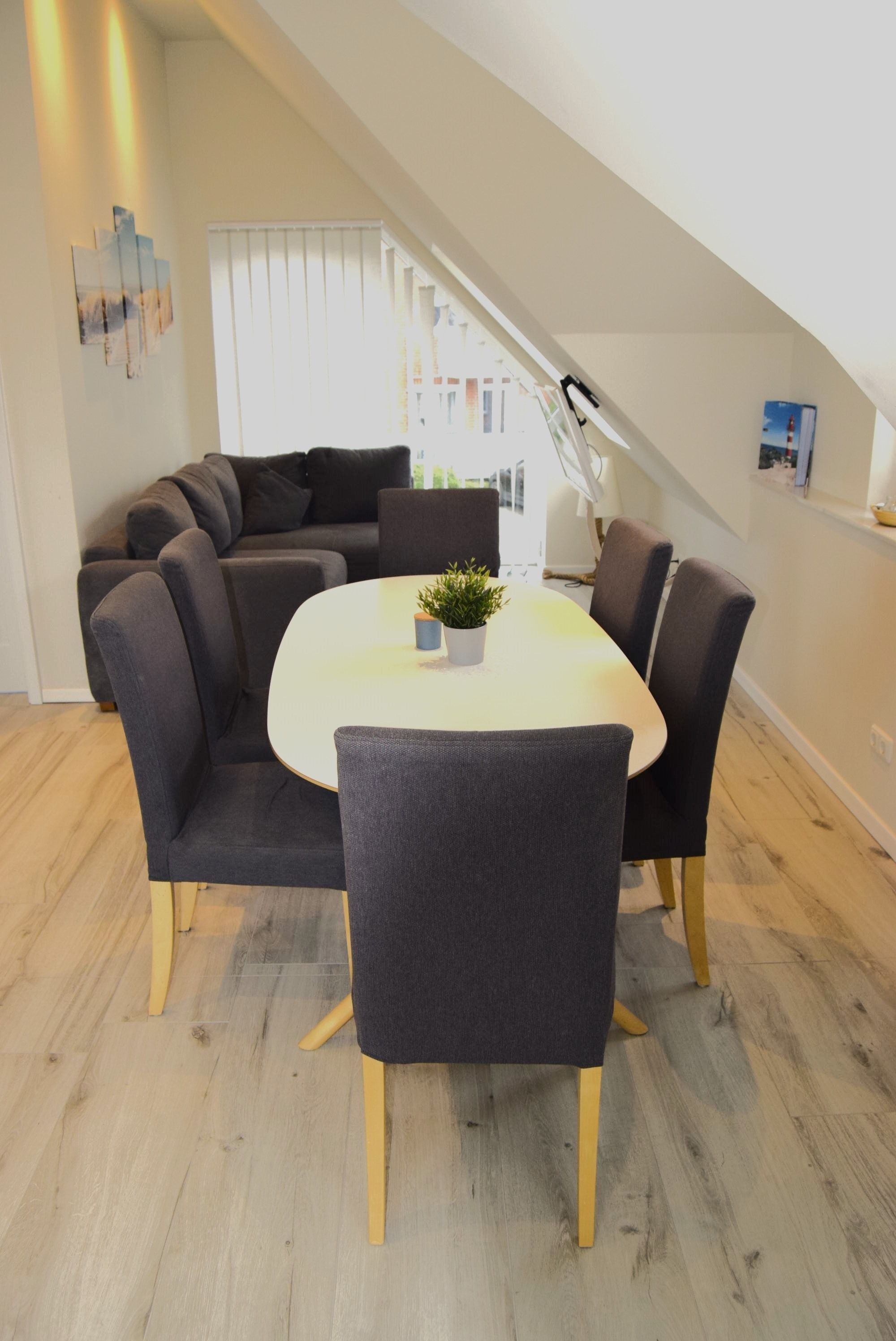 In unserem schönen Ferienhaus Haus Stüürmann direkt hinter dem Deich ist das die tägliche Erholung. Die großen Fenster sorgen für ein lichtdurchflutetes Obergeschoss mit Wohnzimmer, Essbereich und offener Küche für geselliges Beisammensein.