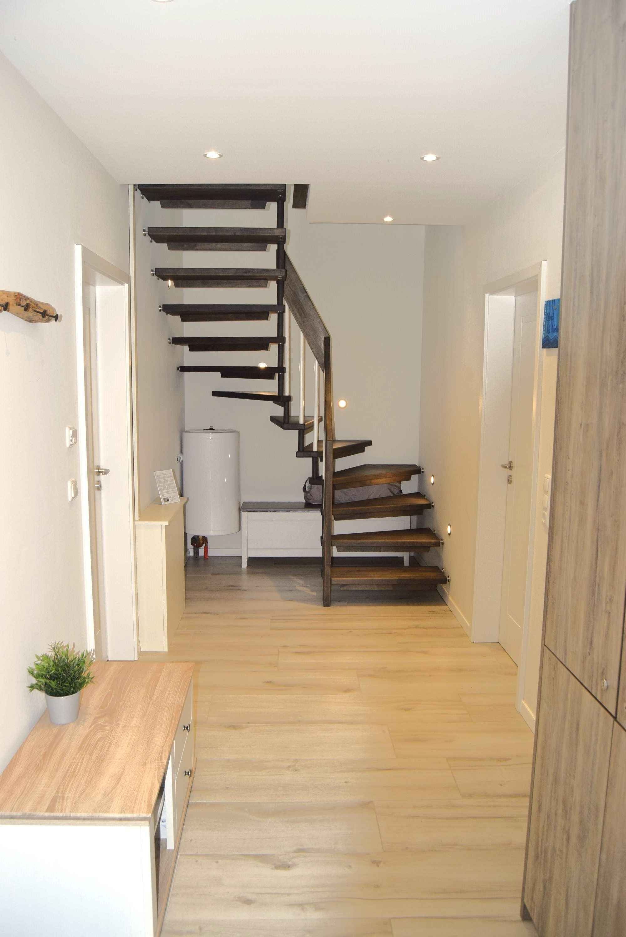 Vom Obergeschoß führt eine Außentreppe direkt in den ruhigen Garten. Hier können entspannt die Füße hochgelegt werden oder Spiele auf dem Rasen für Abwechslung sorgen. Auf der Terrasse stehen Gartenmöbel sowie zwei Sonnenliegen, ein Sonnenschirm und ein Kohlegrill bereit um den Tag genüsslich ausklingen zu lassen.