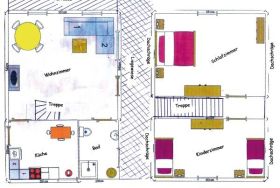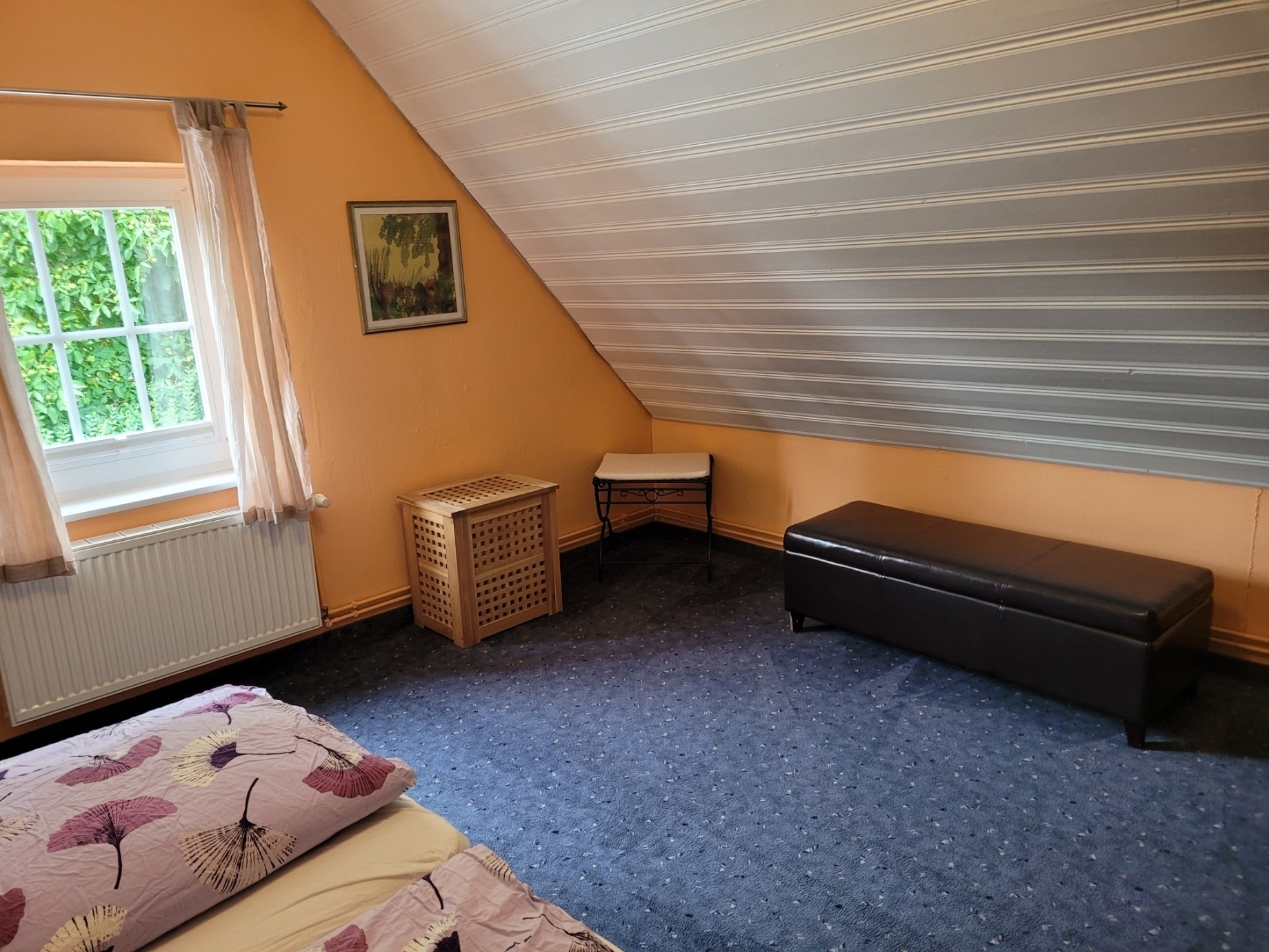 Im 1. Stock befinden sich zwei Schlafzimmer, einmal mit Doppelbett, einmal mit zwei Einzelbetten. Ein Kinderbett mit Decke, Kopfkissen und Bettwäsche kann auf Wunsch kostenfrei dazugestellt werden.
