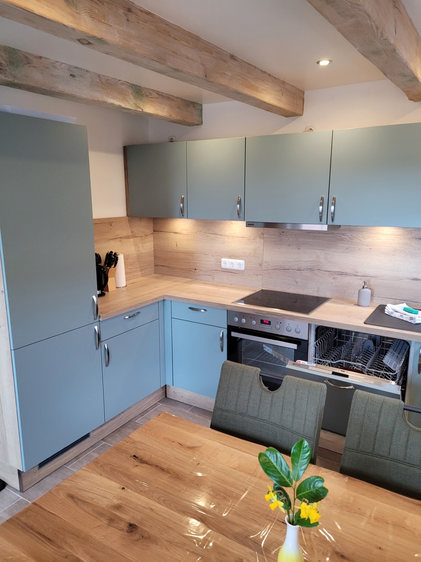 Die Küche ist ausgestattet mit einem Herd mit Ceranfeld und Backofen, einem Kühlschrank mit Gefrierfächern und einem Geschirrspüler.