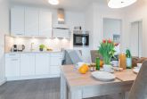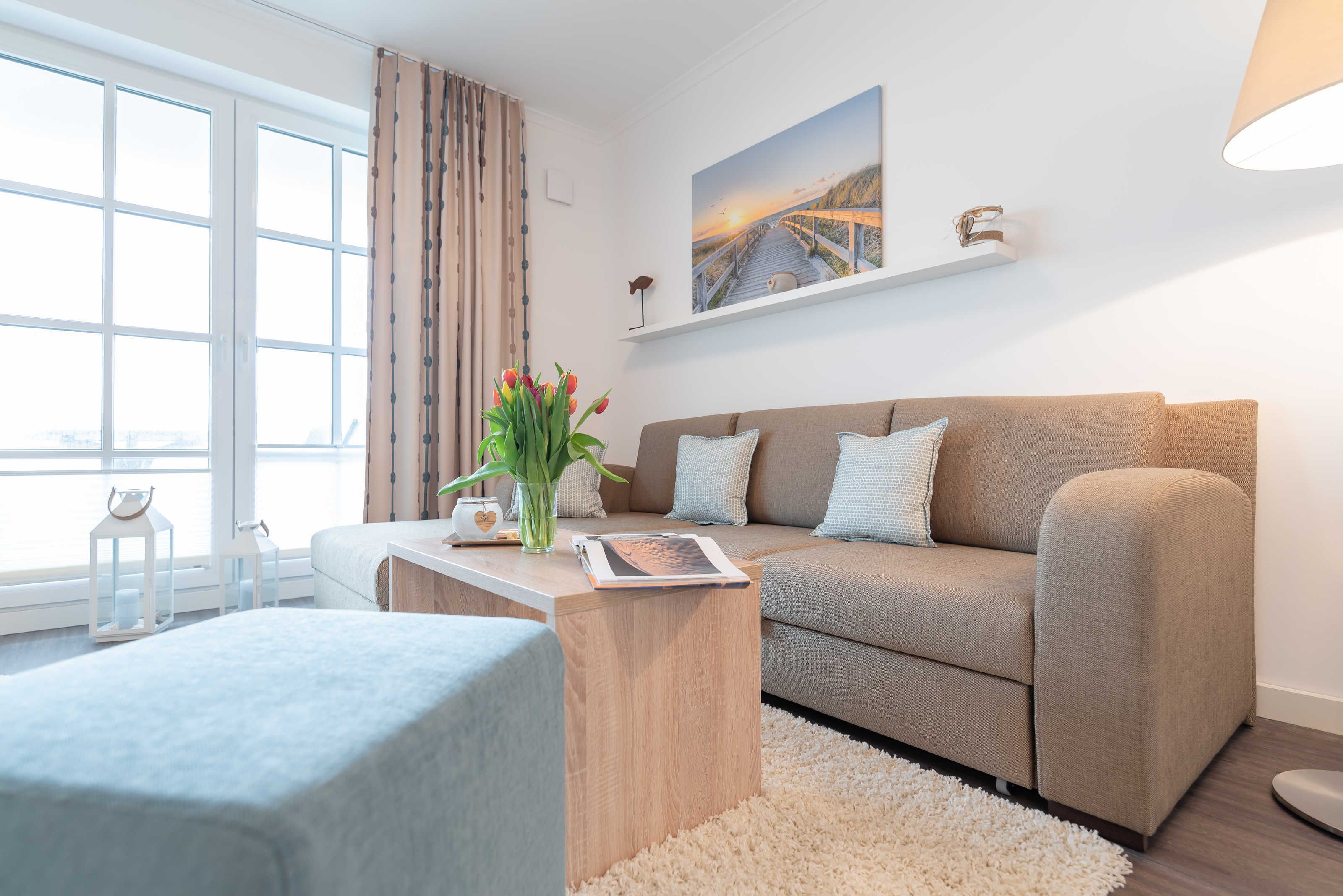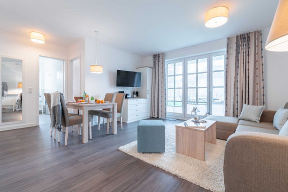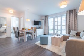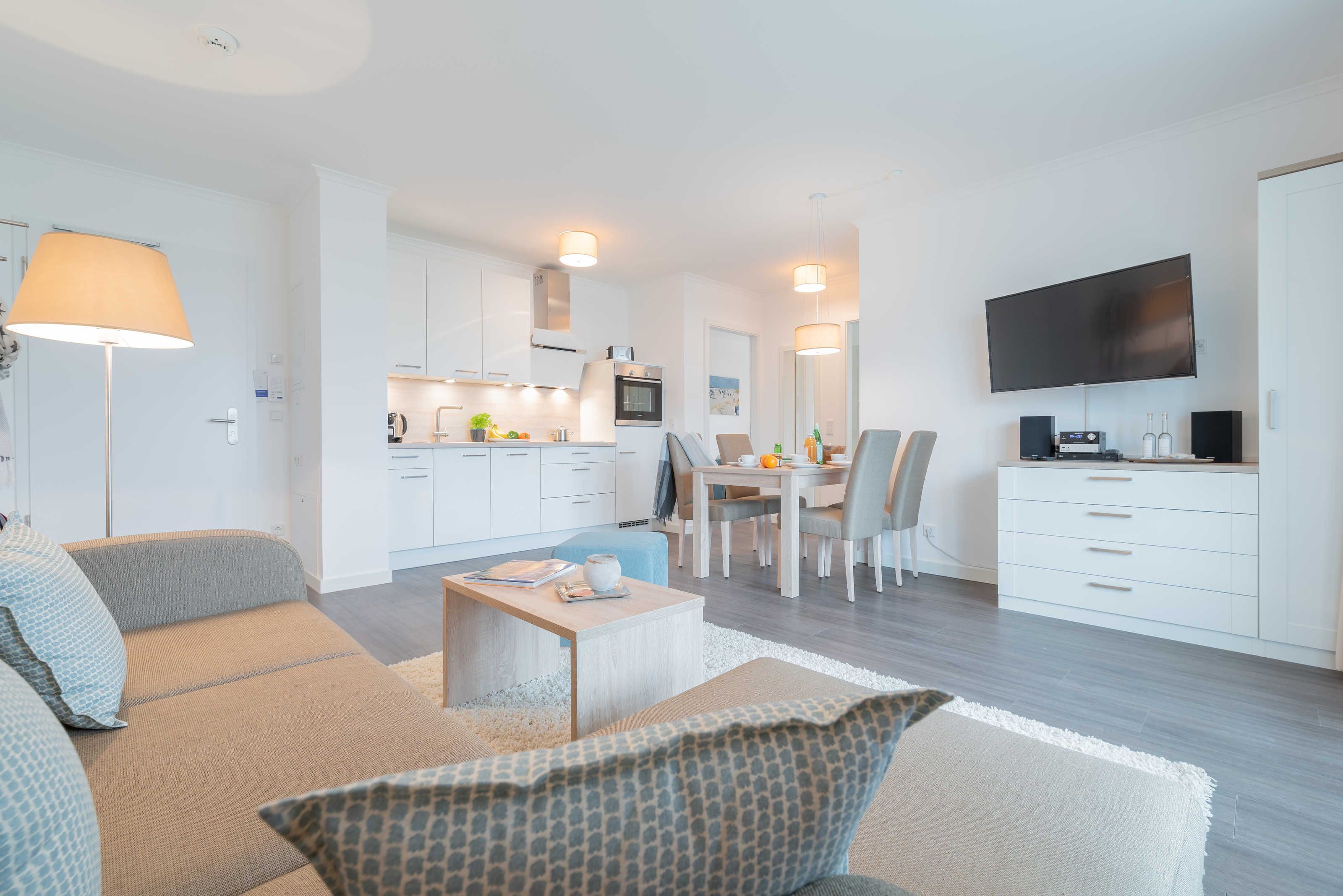 Der offene Bereich von Wohnzimmer und Küche ist geschmackvoll gestaltet. Flachbild-TV, Stereo-Anlage und Blu-ray-Player sind vorhanden. Die gemütliche Sitzecke kann zur Schlafcouch umfunktioniert werden. Ein Esstisch mit vier Stühlen runden das harmonische Bild ab.