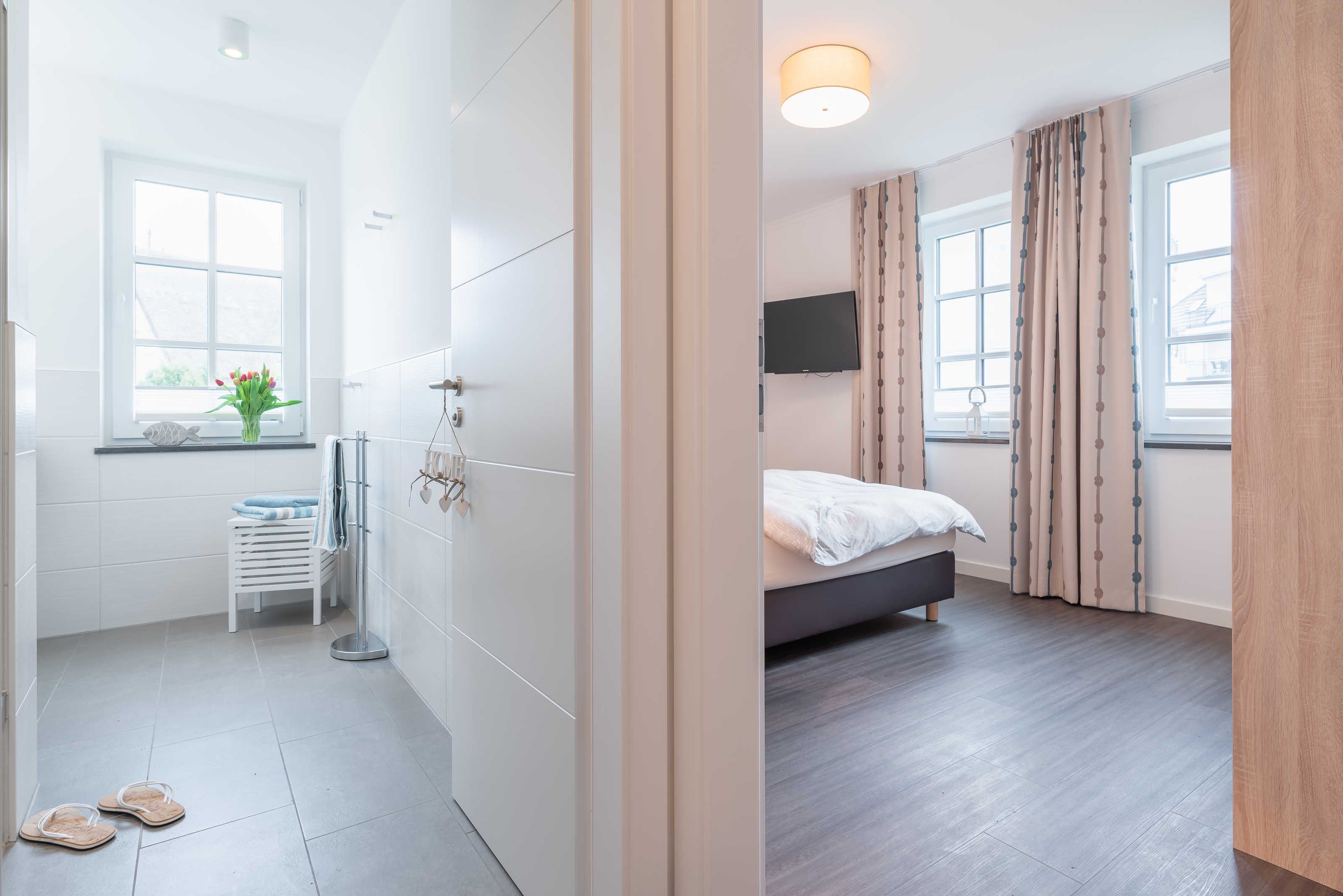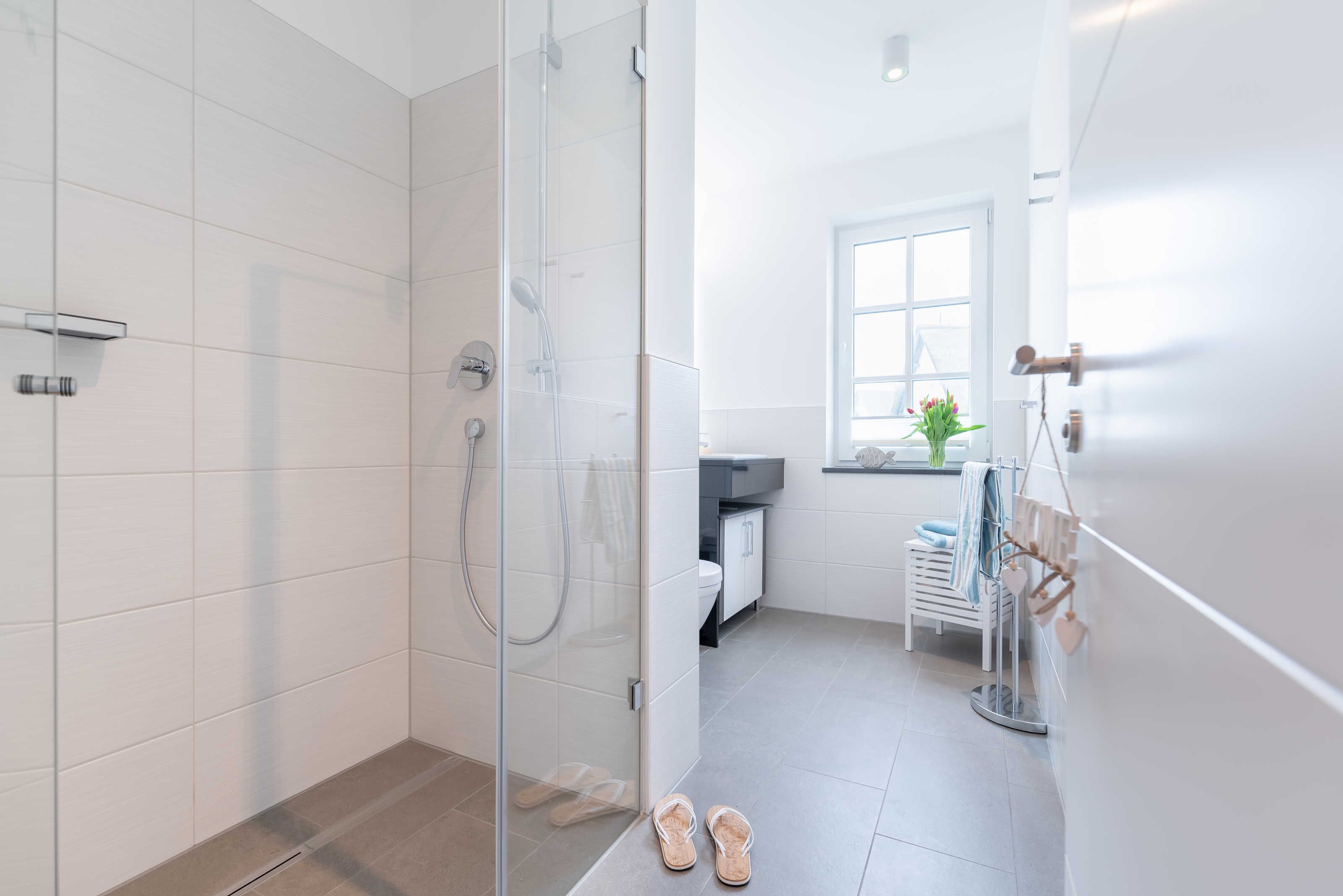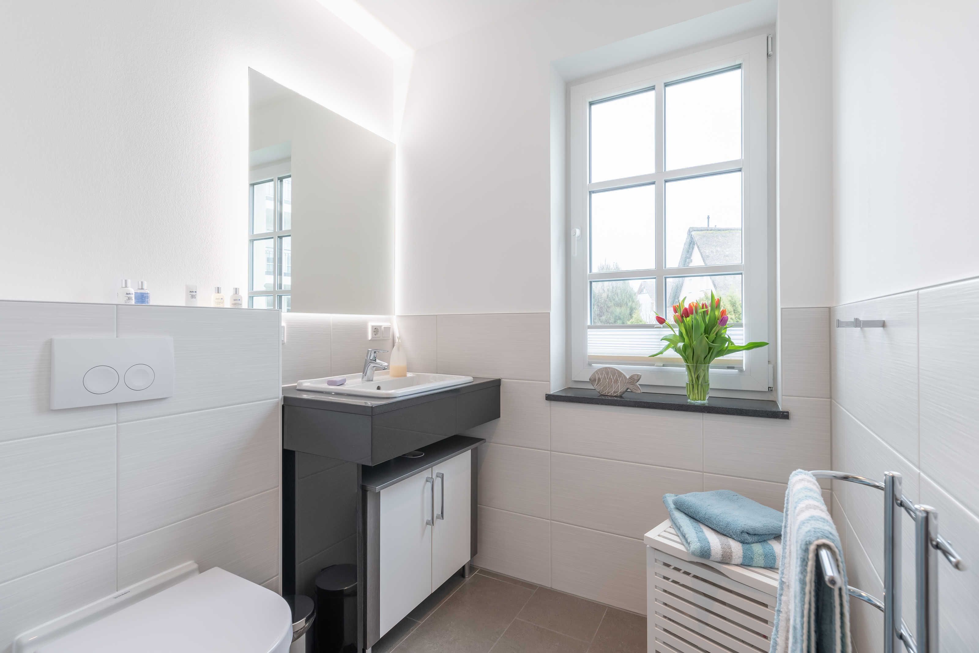 Das große Fenster erleuchtet Ihren Morgen im modern eingerichteten Bad der Ferienwohnung. Eine ebenerdige Dusche, ein Waschtisch mit Unterschrank und großem Spiegel, ein Fön und ein Kosmetikspiegel gehören zur Ausstattung.