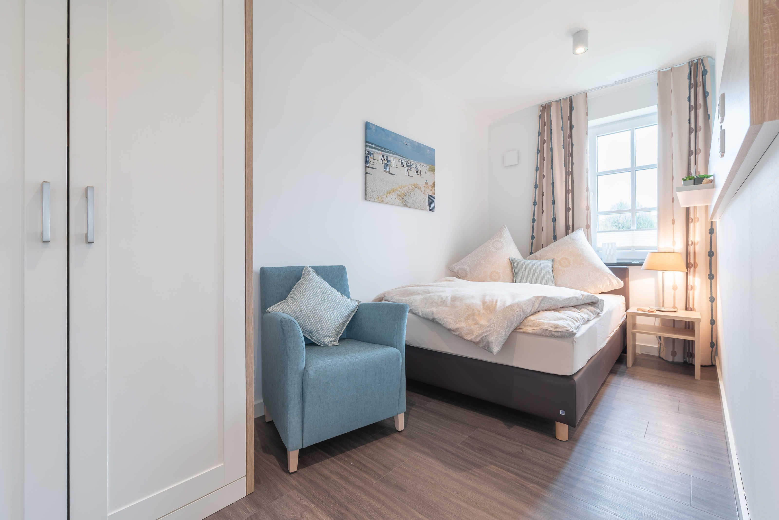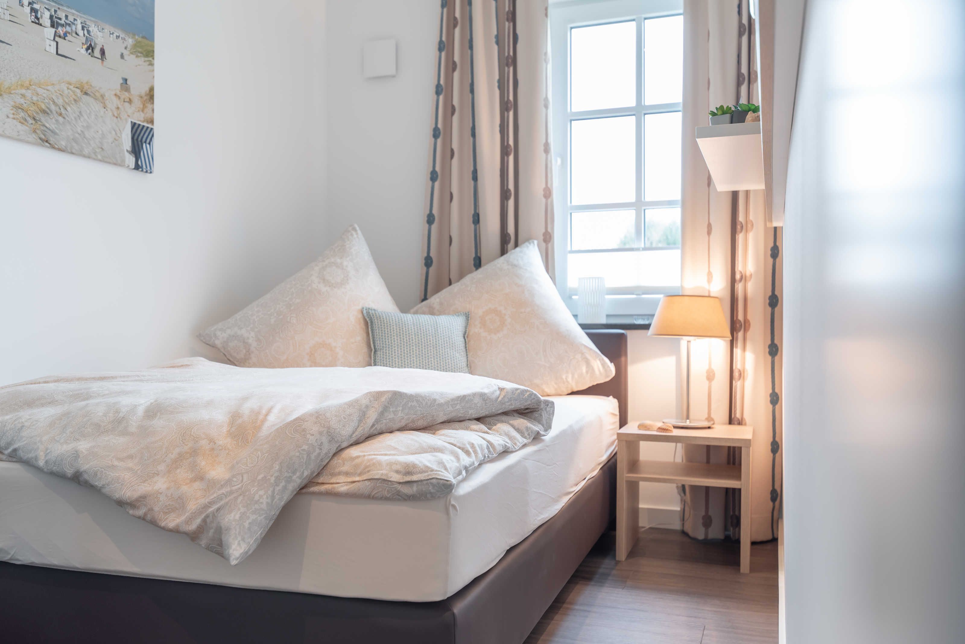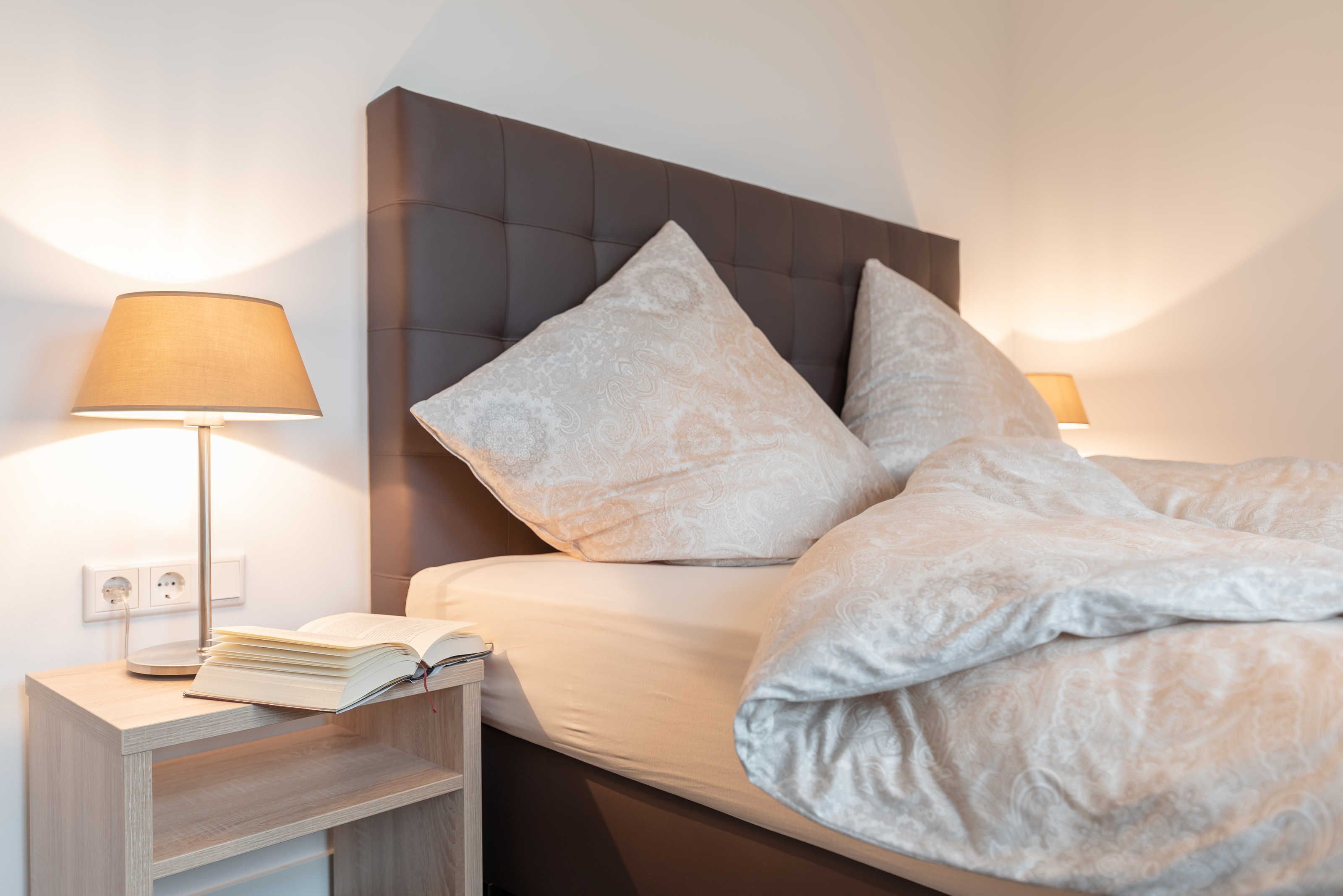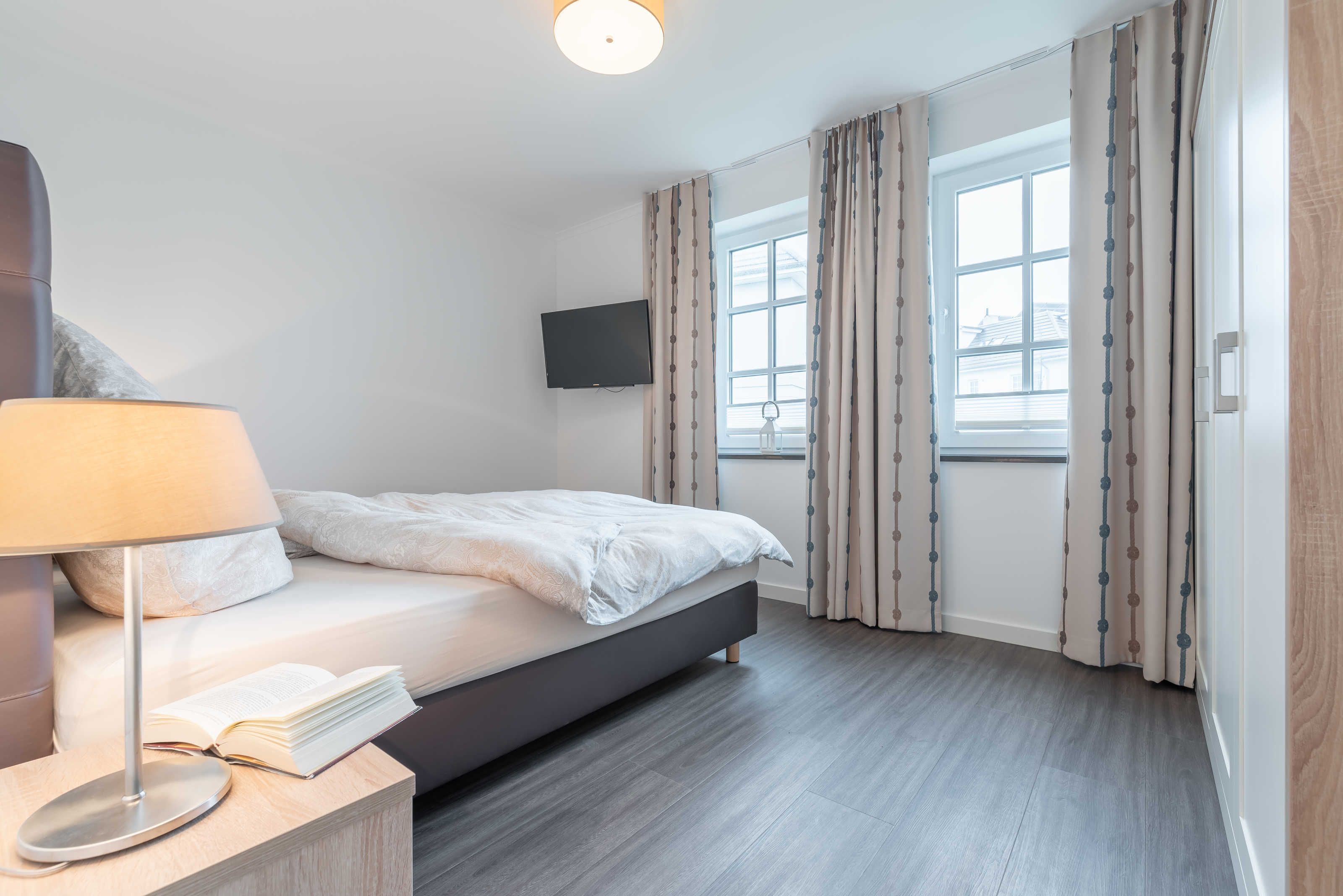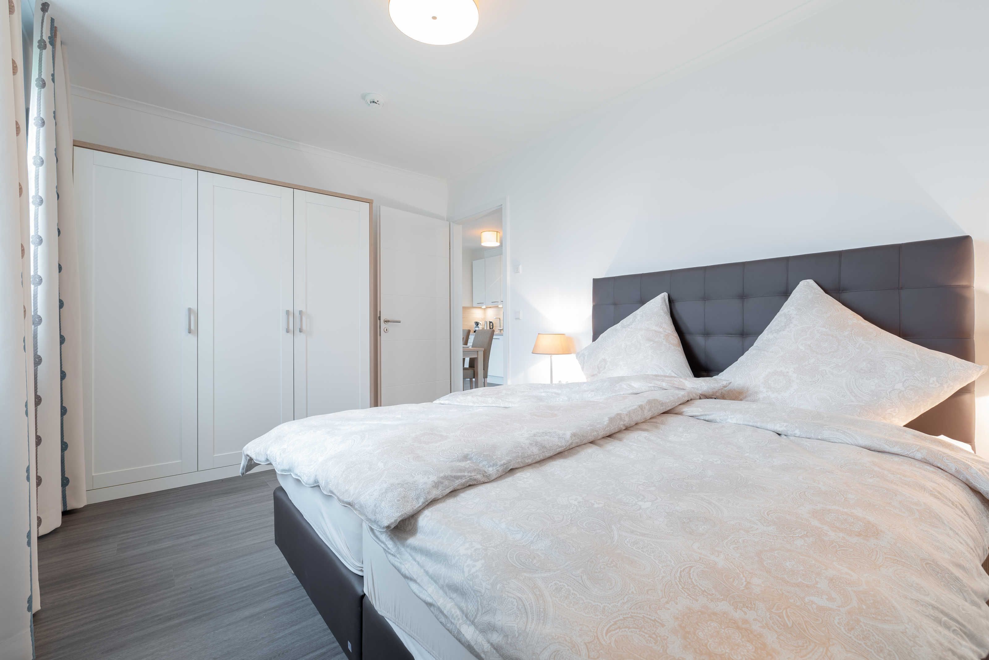 Im großen Schlafzimmer erwarten Sie ein Boxspringbett 1,80 x 2,00 m (zwei einzelne Matratzen), ein großer Kleiderschrank mit Safe, zwei Nachttische und ein Flachbild-TV. Das kleinere Schlafzimmer verfügt über ein Boxspringbett 1,40 x 2,00 m, einen Kleiderschrank, einen Nachttisch sowie Wohlfühldeko.