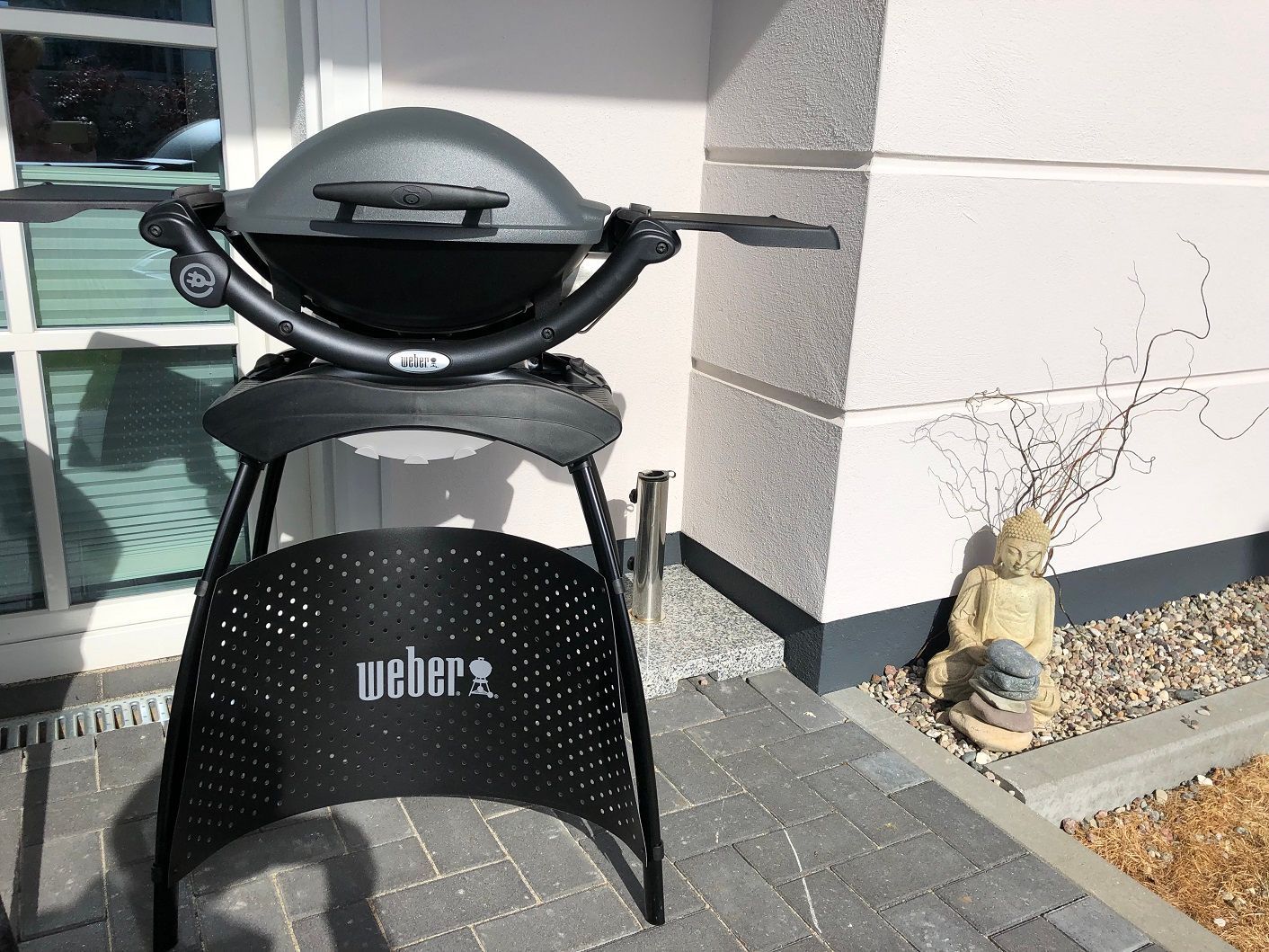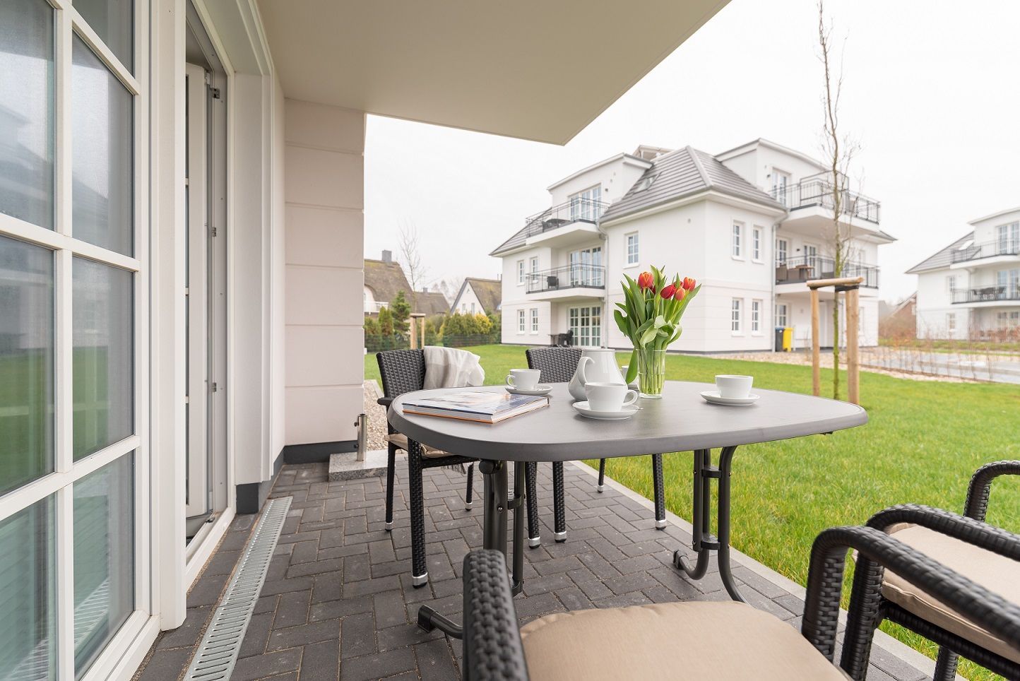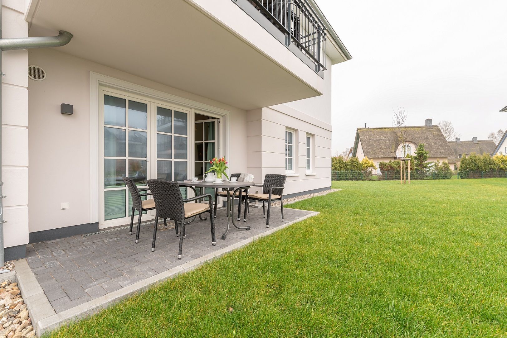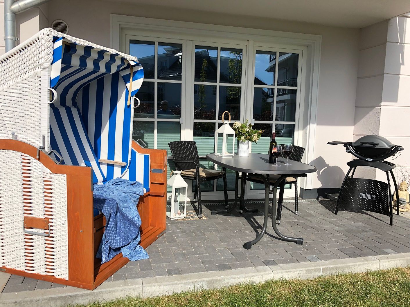 Zur Wohnung gehört eine gepflasterte Terrasse, die nach Süd-Westen ausgerichtet ist, hier laden ein Strandkorb, ein Sonnenschirm, ein Tisch mit vier Stühlen sowie ein Elektrogrill zum Verweilen ein.