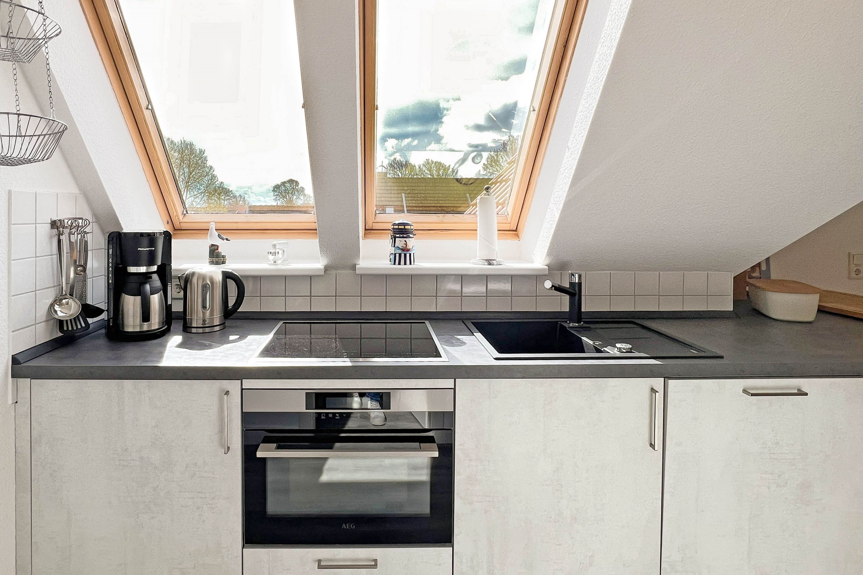 • Küche: Voll ausgestattete Küchenzeile mit Geschirrspüler, Backofen, Kochfeld, Kühlschrank mit Gefriermöglichkeit, Filterkaffeemaschine, Toaster, Wasserkocher, Mikrowelle und Eierkocher