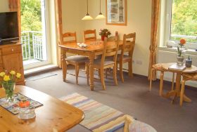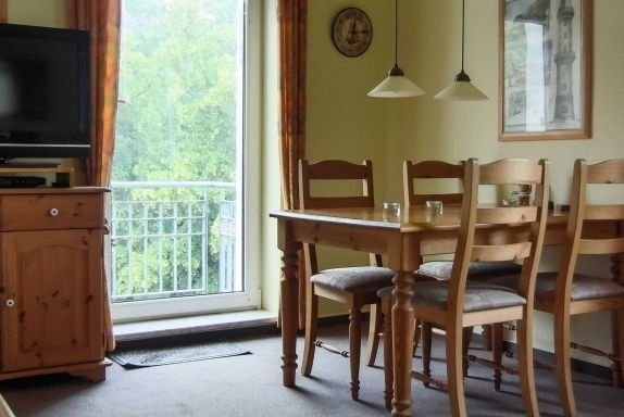 Die 2-Raum-Ferienwohnung besteht aus einem Wohnraum mit Essbereich, einem Schlafzimmer, einer Küche sowie einem Duchbad. Außerdem verfügt die Wohnung über einen Balkon.