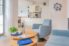 Die Ferienwohnung Wellenflüstern besticht durch ihre hochwertige Ausstattung und das stilvolle Ambiente. Der offene Wohn- und Essbereich mit Gaskamin lädt zu gemütlichen Stunden ein, während die voll ausgestattete Küche keine Wünsche offenlässt. Die beiden Schlafzimmer bieten erholsamen Schlafkomfort, und das moderne Badezimmer sorgt für einen angenehmen Start in den Tag.